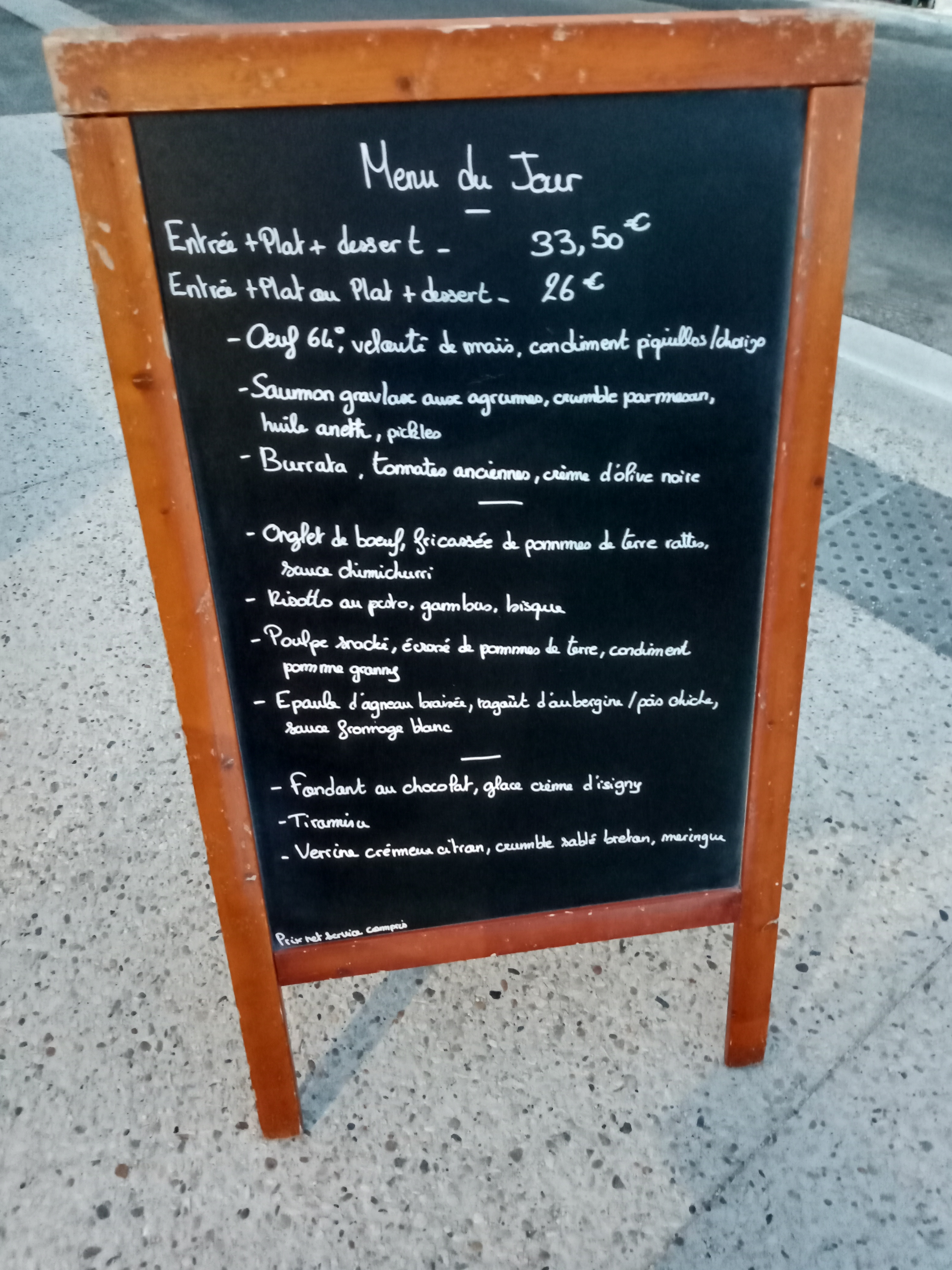 Pas de carte seulement un menu (à prix correct 16€ E+P+D). Produit frais. Et jeudi c'est poisson! Et si le plat principal ne convient pas, il y a toujours un plat de substitution plus classique. Cuisine bien même si le plat est de la viande grillée avec des frites. Le personnel est chaleureux, à disposition si besoin de modifier quelque chose. Le seul bémol: on sent un peu trop la friture en sortant ☹ pas top quand on repart travailler. A recommander sinon et l'été il y a une terrasse.