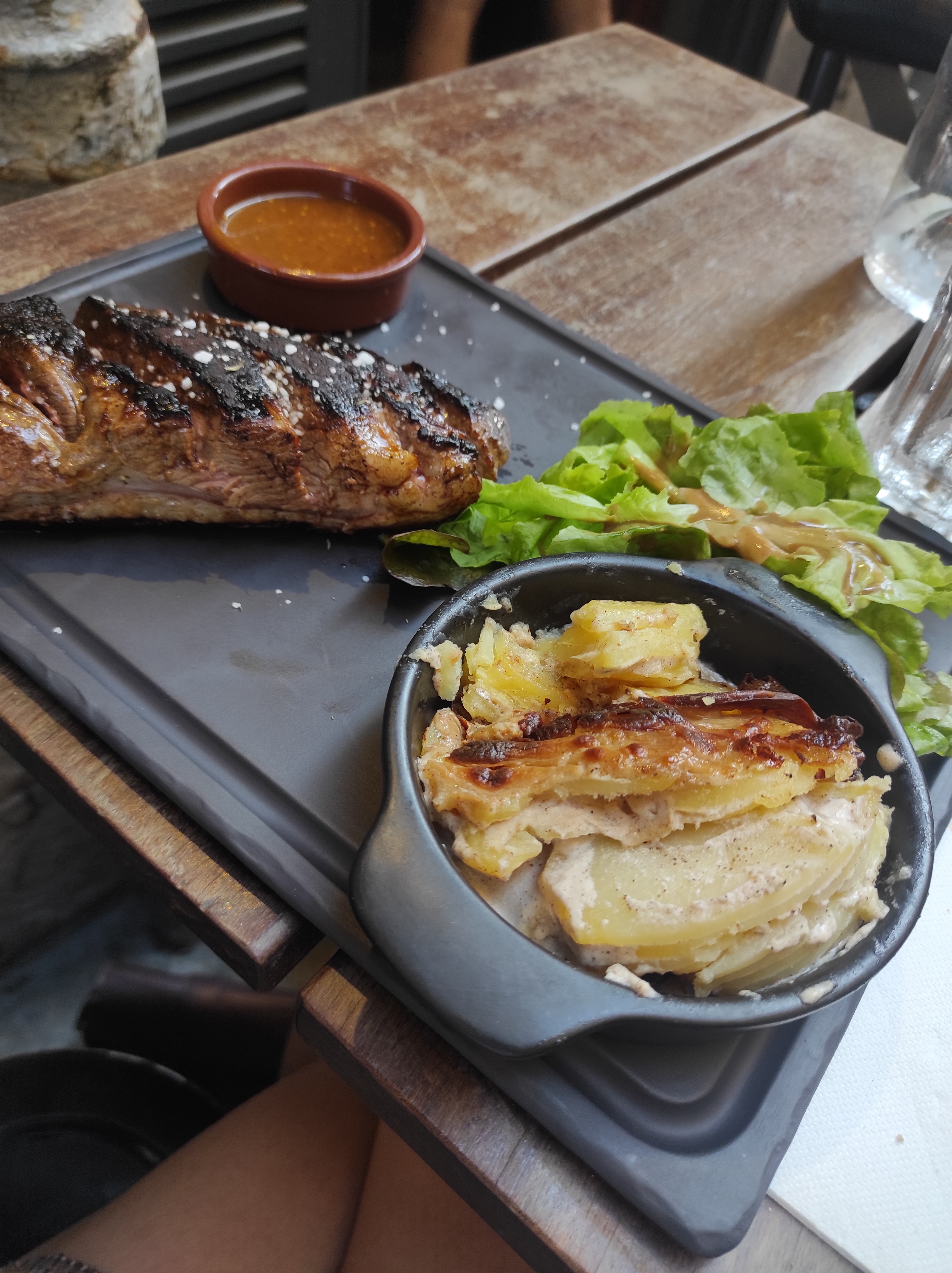 Très bonne adresse dans une rue très touristique !! Vous pouvez y aller sans hésiter : salade périgourdine très fraîche, excellente assiette d'escargots et plancha majestueuse. Ensuite magret vraiment extra arrosé d'une merveilleuse sauce, saumon mi cuit savoureux et grenouilles particulièrement bonnes. Nous nous sommes régalés mais n'avons pu tester les desserts. Plus faim.....