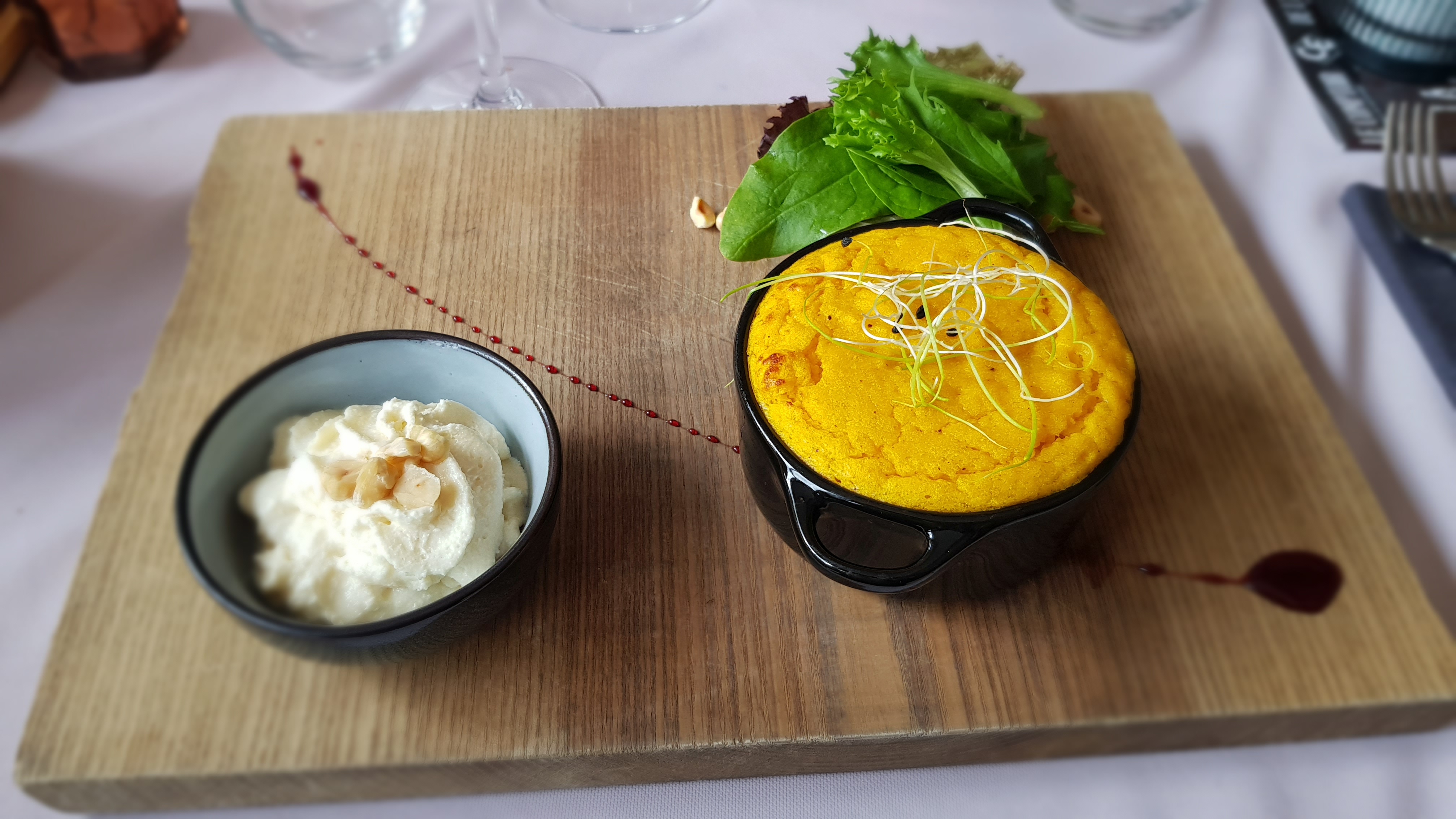 Super service, accueil chaleureux et souriant, avec une équipe jeune et disponible. Le repas était savoureux et nous avons apprécié ce qui était offert: tapenade noire maison, beurres de saté et curry et la délicieuse mise en bouche: velouté de châtaigne avec mousse de crème fraîche.