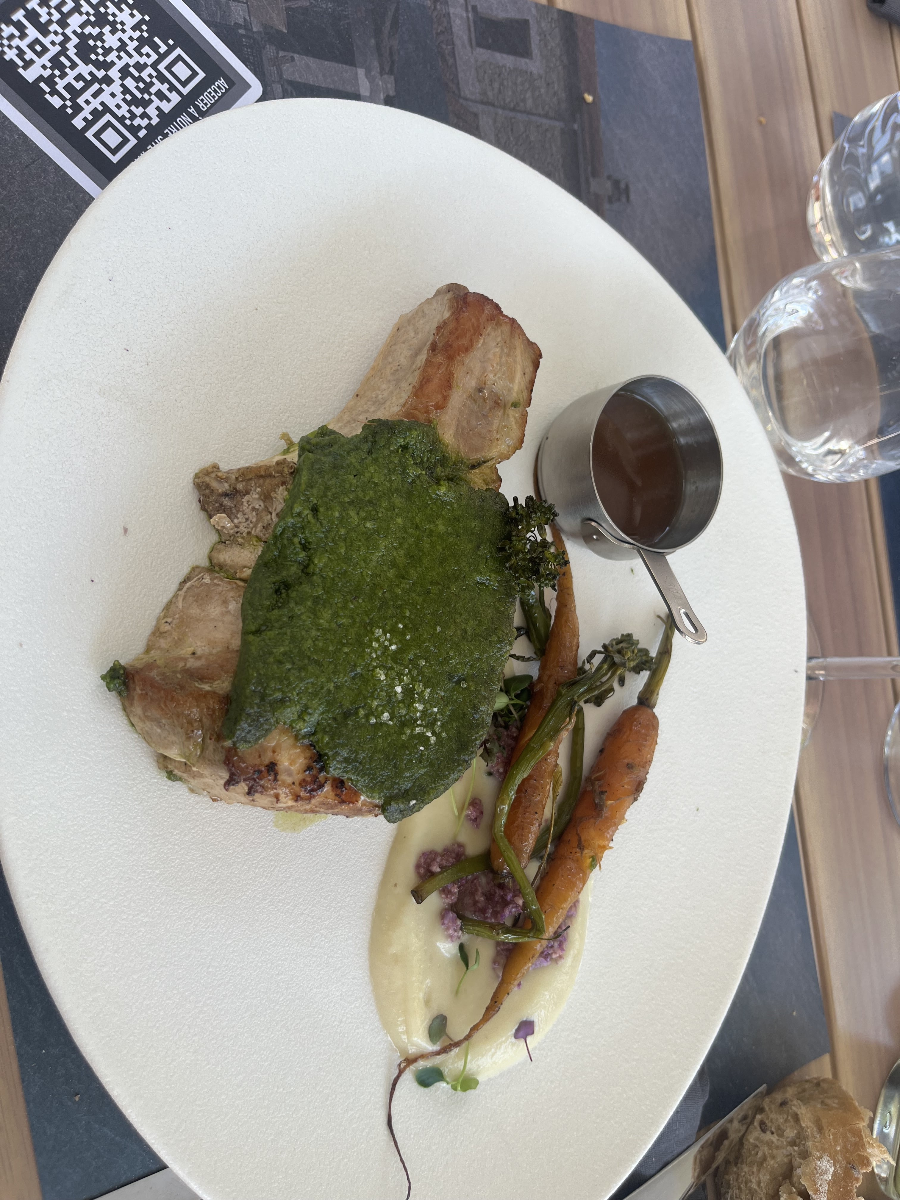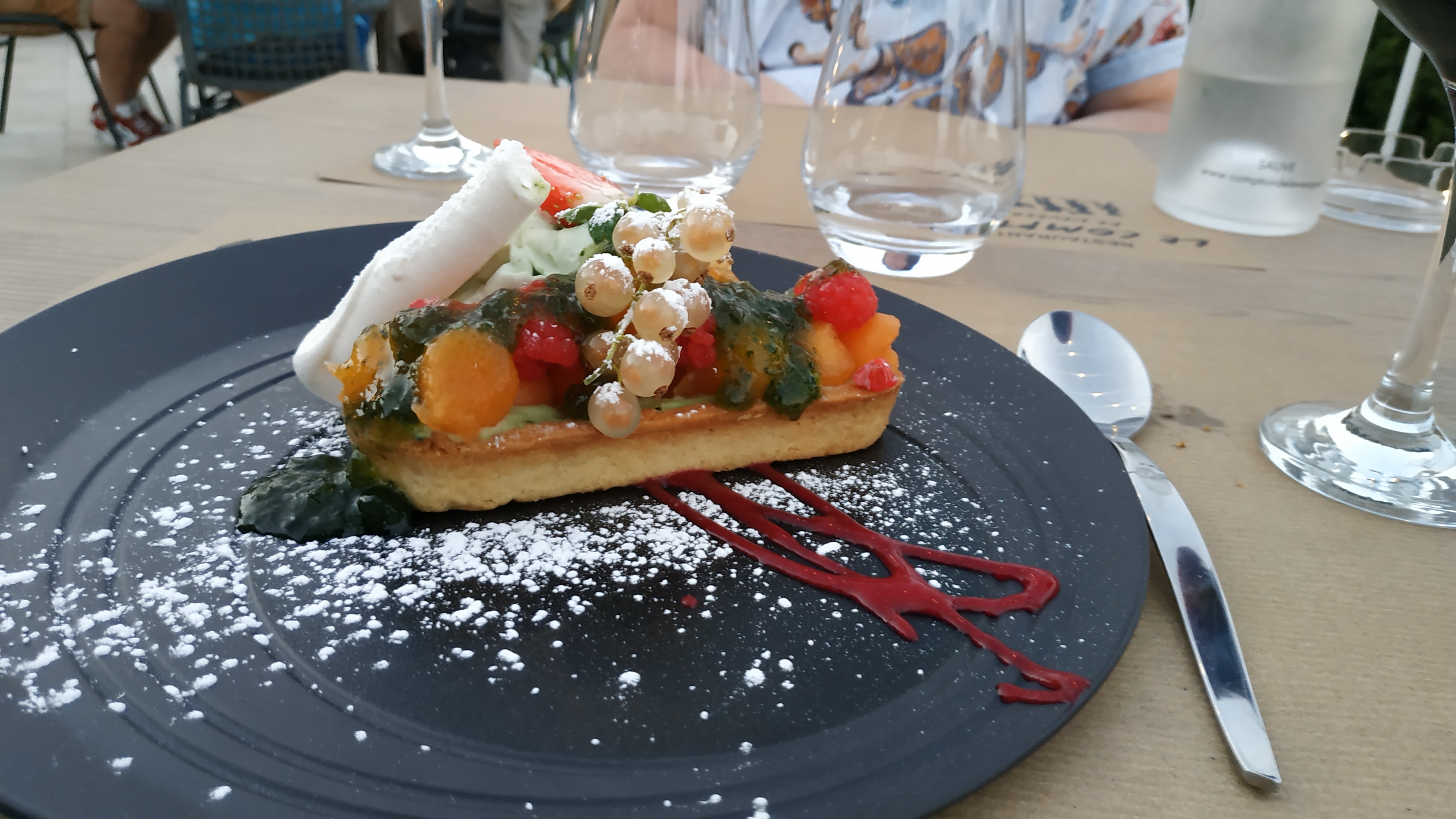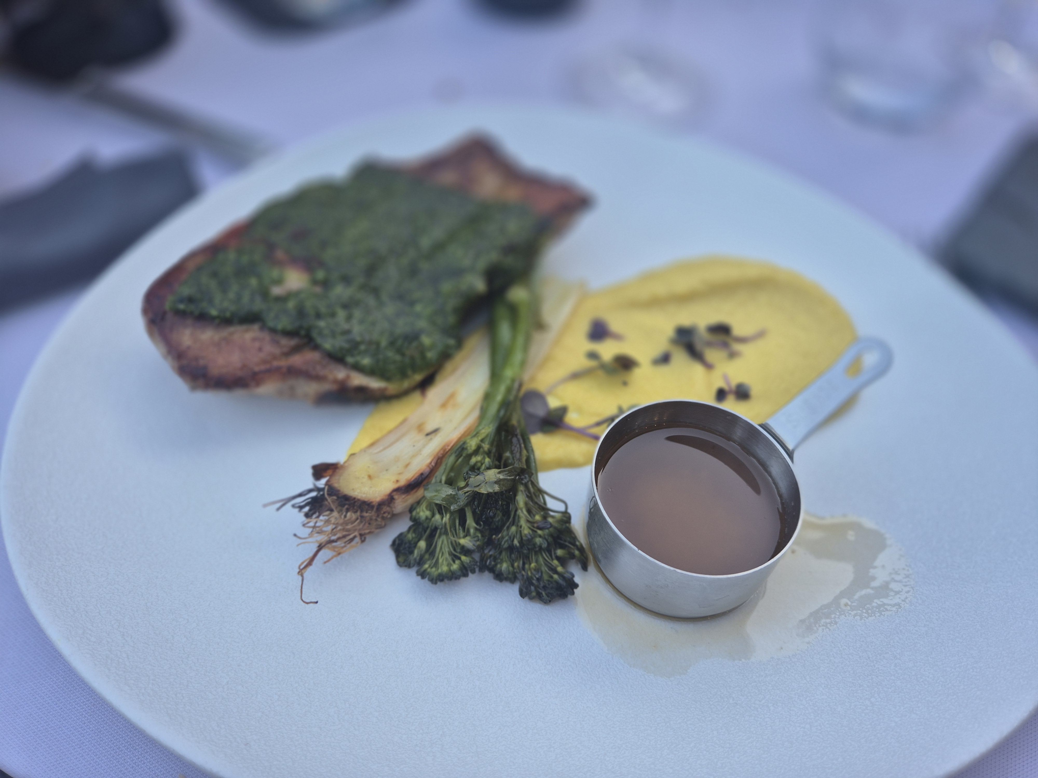 Cuisine exceptionnelle et recherchée. La soupe de concombre aux gnocchis de betterave était magnifique. Excellent service et super endroit pour déjeuner en été, avec des arbres pour l'ombre et une piscine (même si c'est probablement bizarre d'aller dans l'eau entre deux plats).