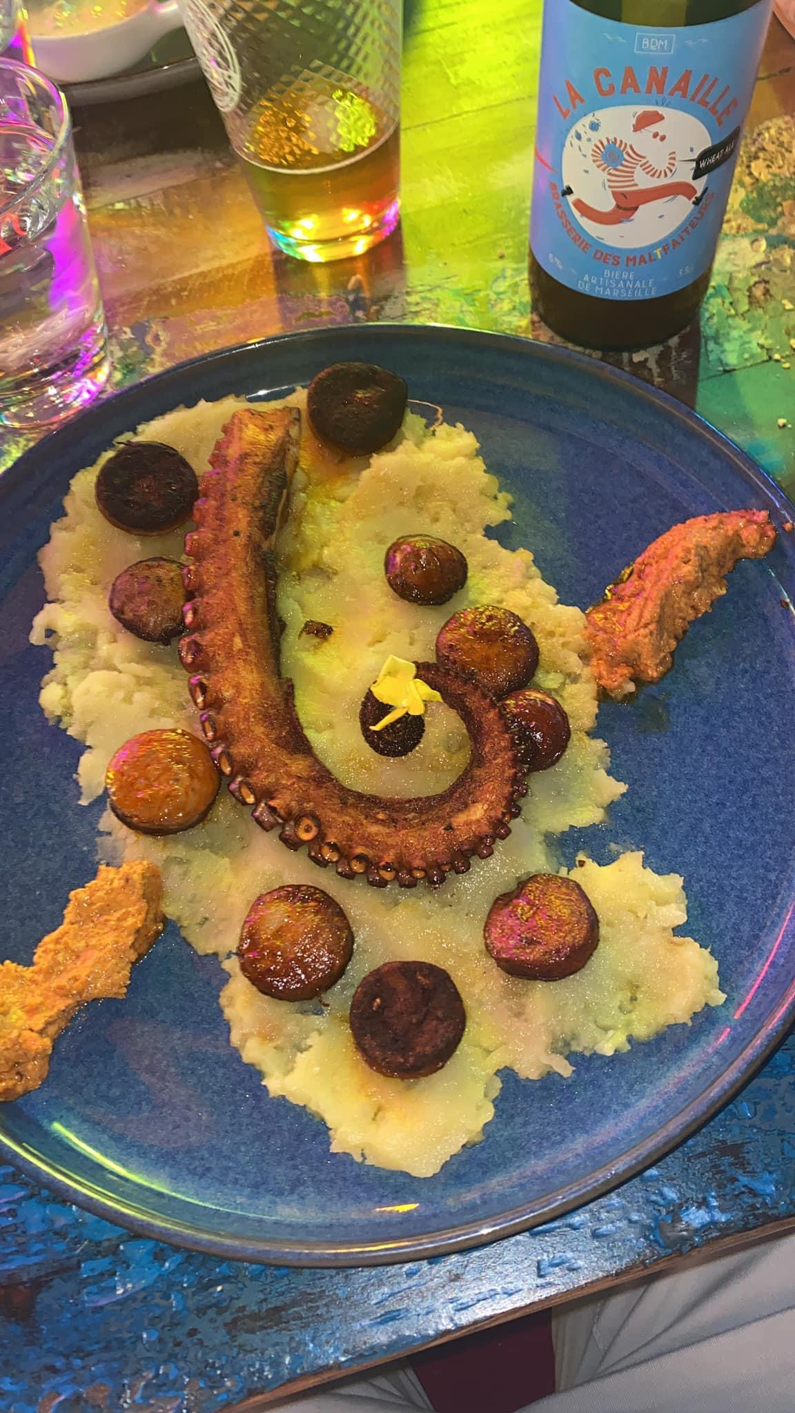 Bar restaurant incontournable de Marseille super ambiance décoration incroyable personnel accueillant prix attractifs et cocktails 🍹 et plats délicieux 🤤. Je recommande vivement! Si vous devez choisir un plat les encornets de poulpe sont délicieux mes préférés !!