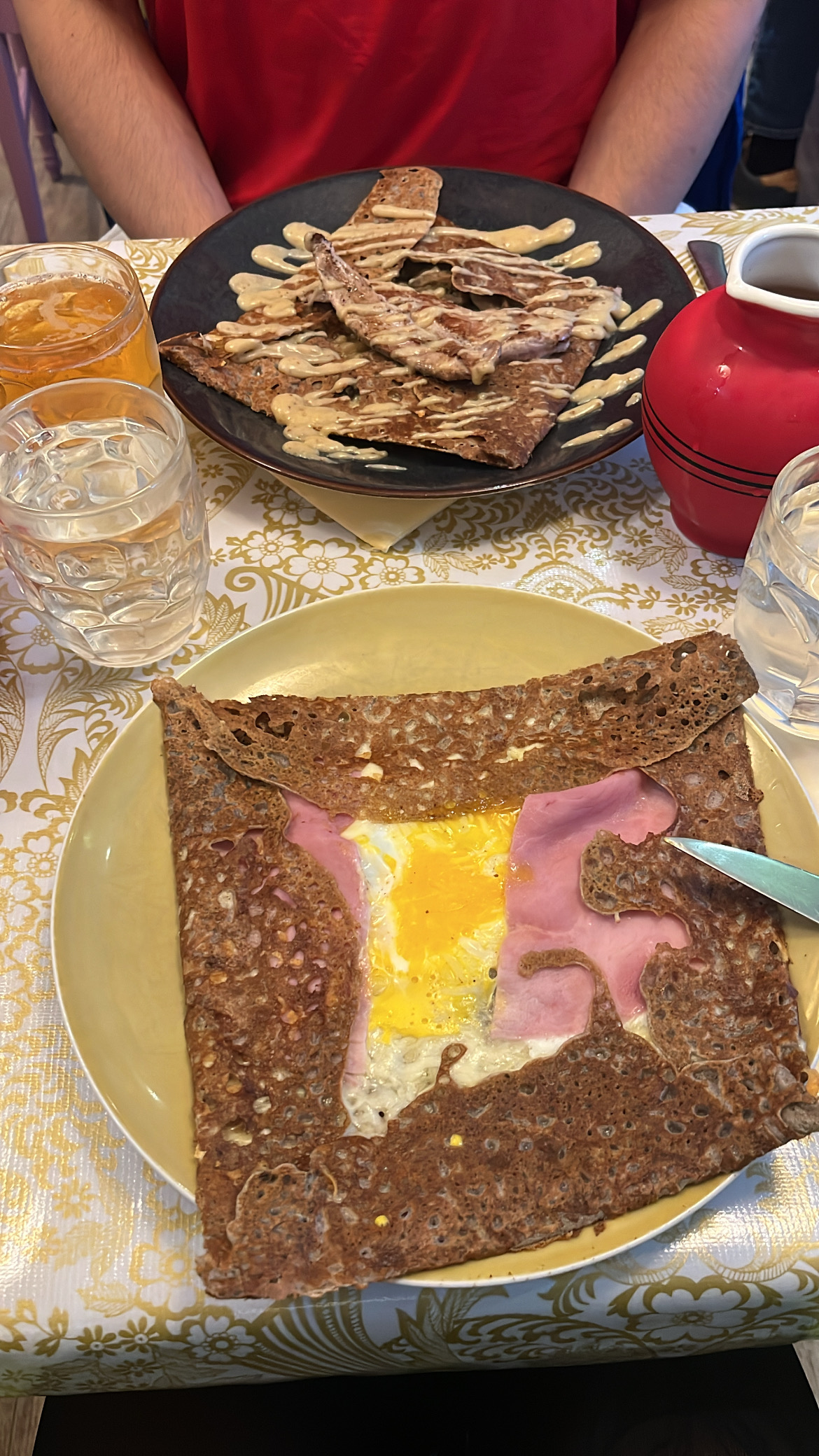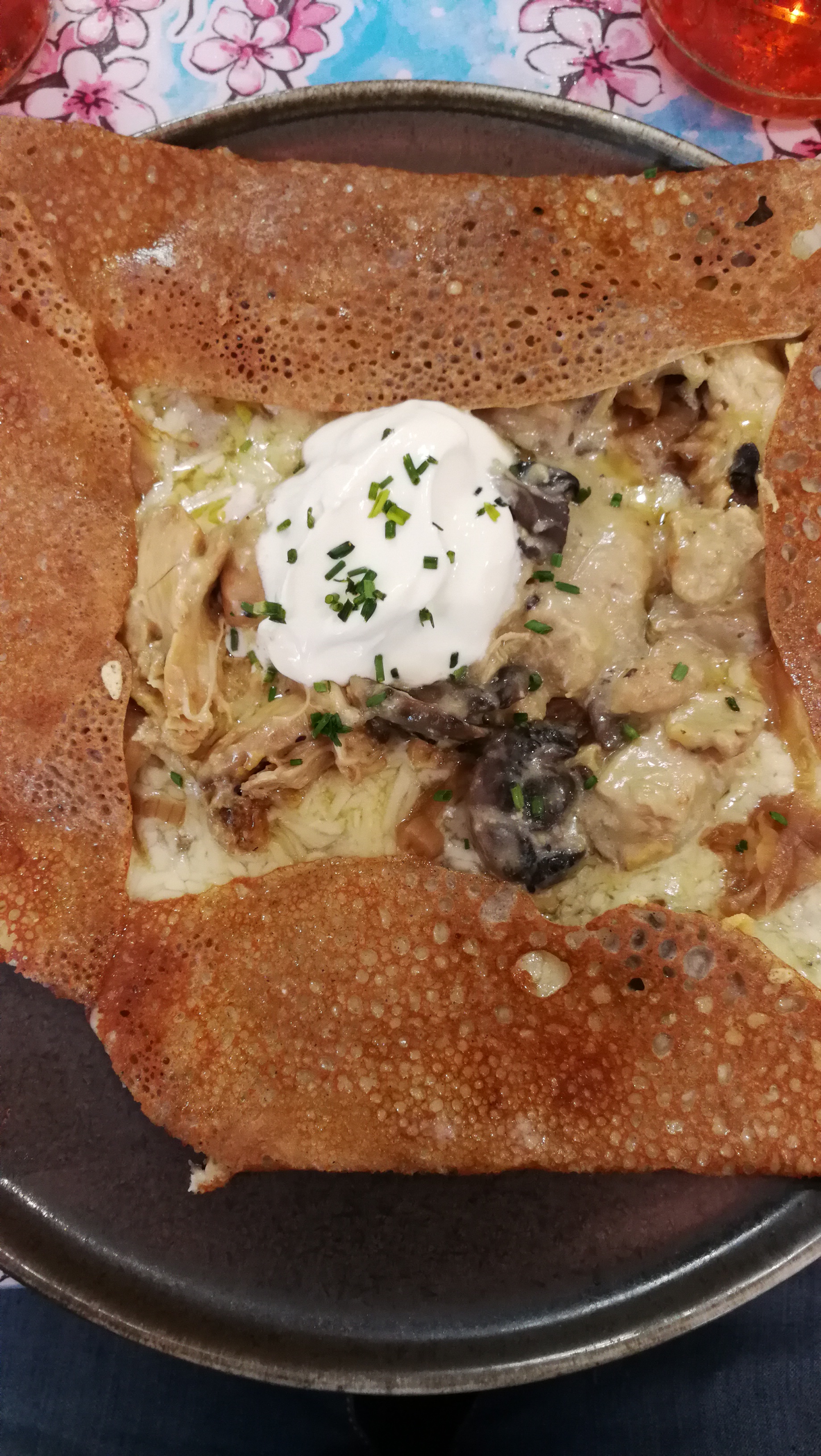Ambiance au top qui change, serveuses adorables et super gentilles ! Celle qui s'est occupée de notre table, n'a absolument pas hésité à me conseiller sur mon choix de galette ou sur comment accompagner mon gâteau de crêpe (je le recommande à 200% avec le caramel et les éclats de speculoos) ! Légende photo : 1er plan : la Tonton Fernand (au poulet) 2eme plan : la Papy Bigoude (façon tartiflette)