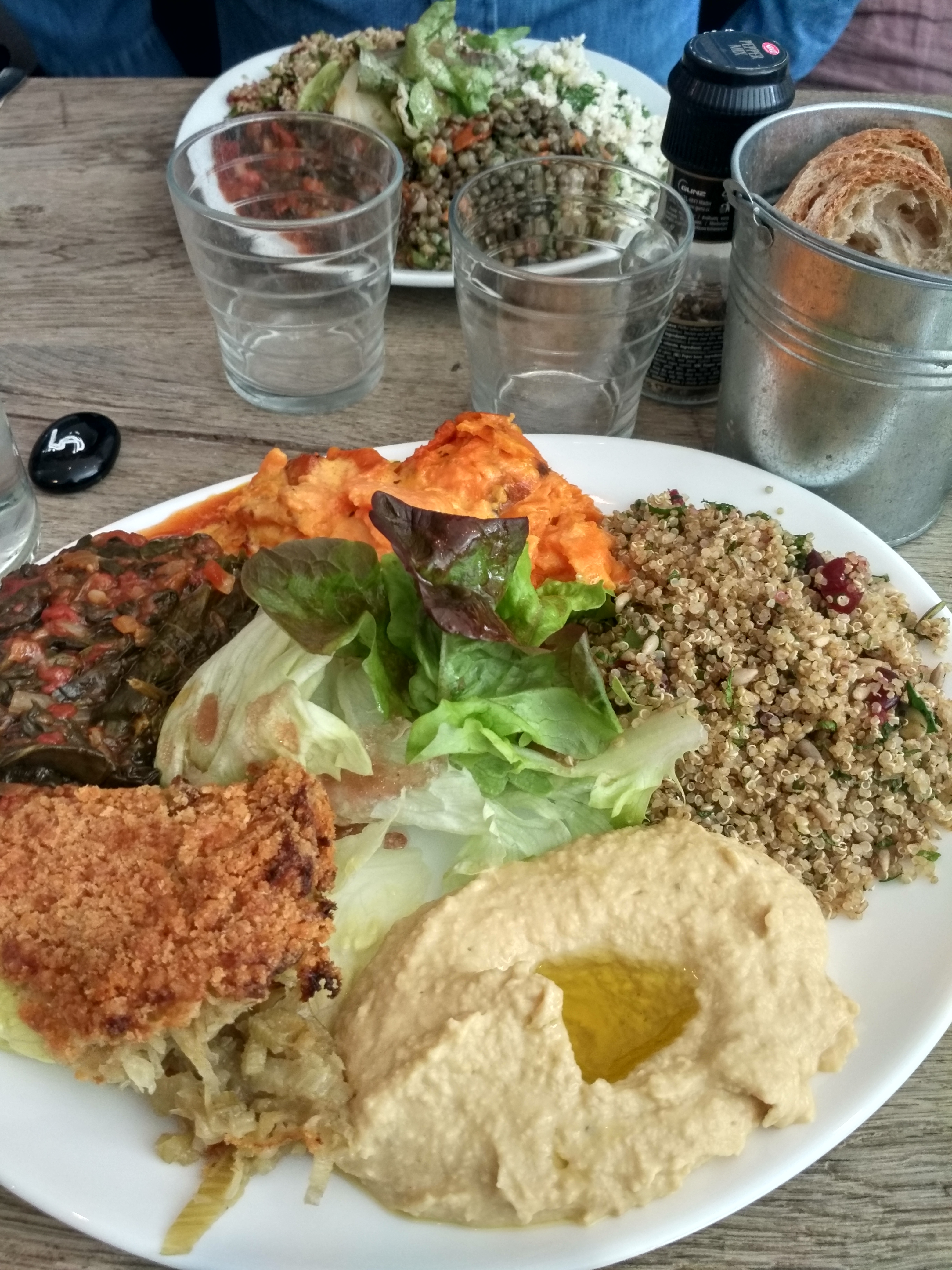 Génial, superbe surprise, par hasard :-) Plats végétariens, légumes de saison, produits alternatifs au lait de vache (lait coco ou amande) et aux féculents (patate douce et quinoa) Dahl délicieux, subtilement épicé. Fondant au chocolat sublime ! Pas eu le temps de faire des photos, on a tout dévoré et léché nos assiettes !