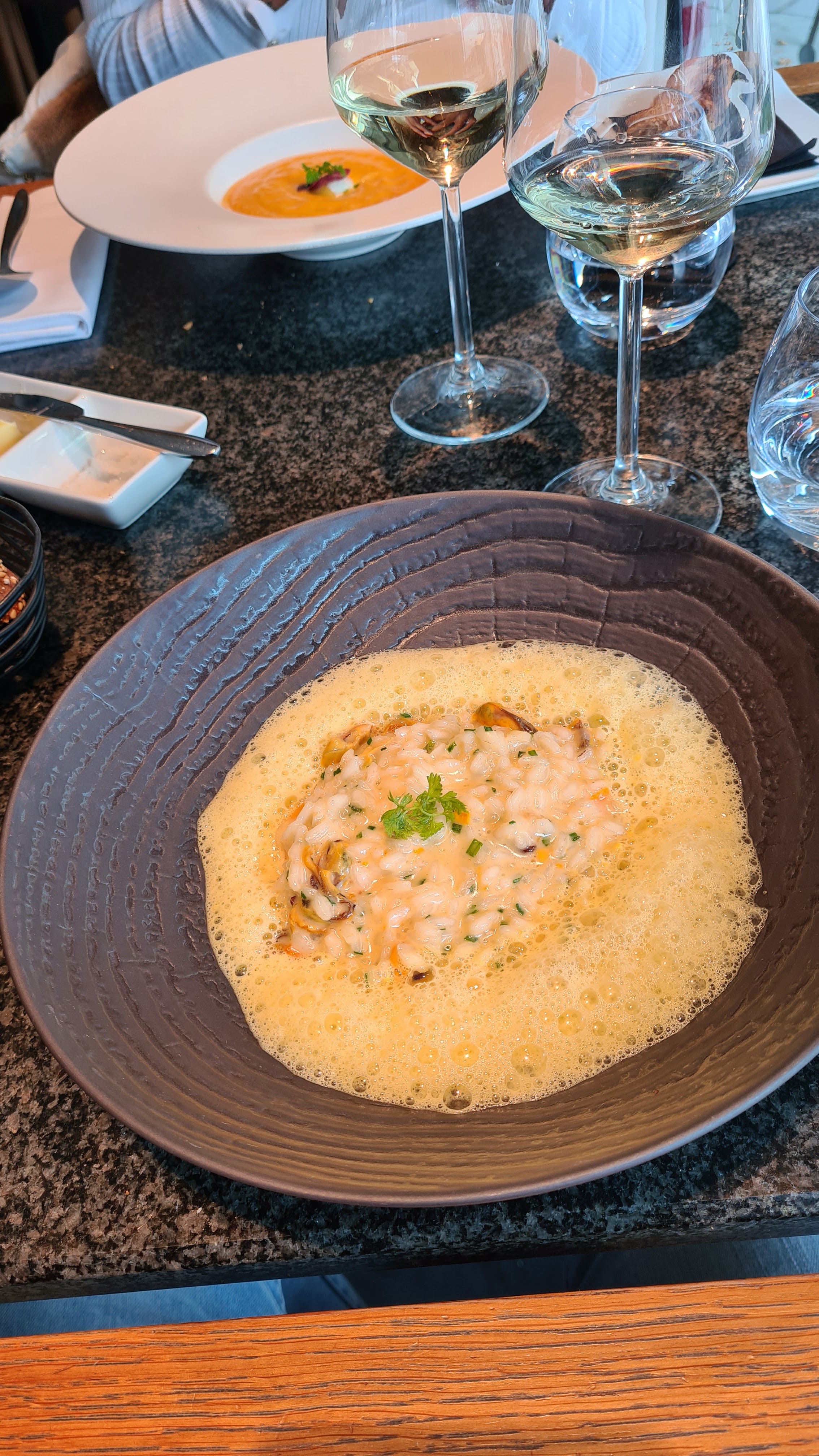 Le serveur avec des lunettes rondes et des cheveux relativement longs était très peu professionnel et à la limite impoli. Nous avons compté jusqu'à six serveurs différents qui nous servaient au cours du repas, ce qui était décevant - mon ami avait une grave allergie aux noix et nous avons dû l'expliquer plusieurs fois, donc il n'y avait clairement aucune communication entre le personnel - cela pourrait être très grave étant donné le Conséquences potentielles. Il y avait un manque d'attention et la nourriture était fade (pas mauvaise mais pas bonne - médiocre. Ce à quoi on peut s'attendre dans un hôtel d'affaires) - le risotto était trop cuit et les plats principaux n'étaient pas inspirés. Il était clair que l'endroit était composé de travailleurs saisonniers qui ont peu d'expérience en matière d'hôtellerie. Ils savent qu’il s’agit d’une station de ski avec beaucoup de fréquentation et ils ne se soucient donc clairement pas des clients réguliers. Ils ont insisté pour facturer une commande de café qu'ils s'étaient trompés alors que la facture s'élevait à plusieurs centaines d'euros (pour deux personnes). Je ne le recommanderais pas - il existe de bien meilleurs endroits à Chamonix à des niveaux de prix similaires ou moins chers.