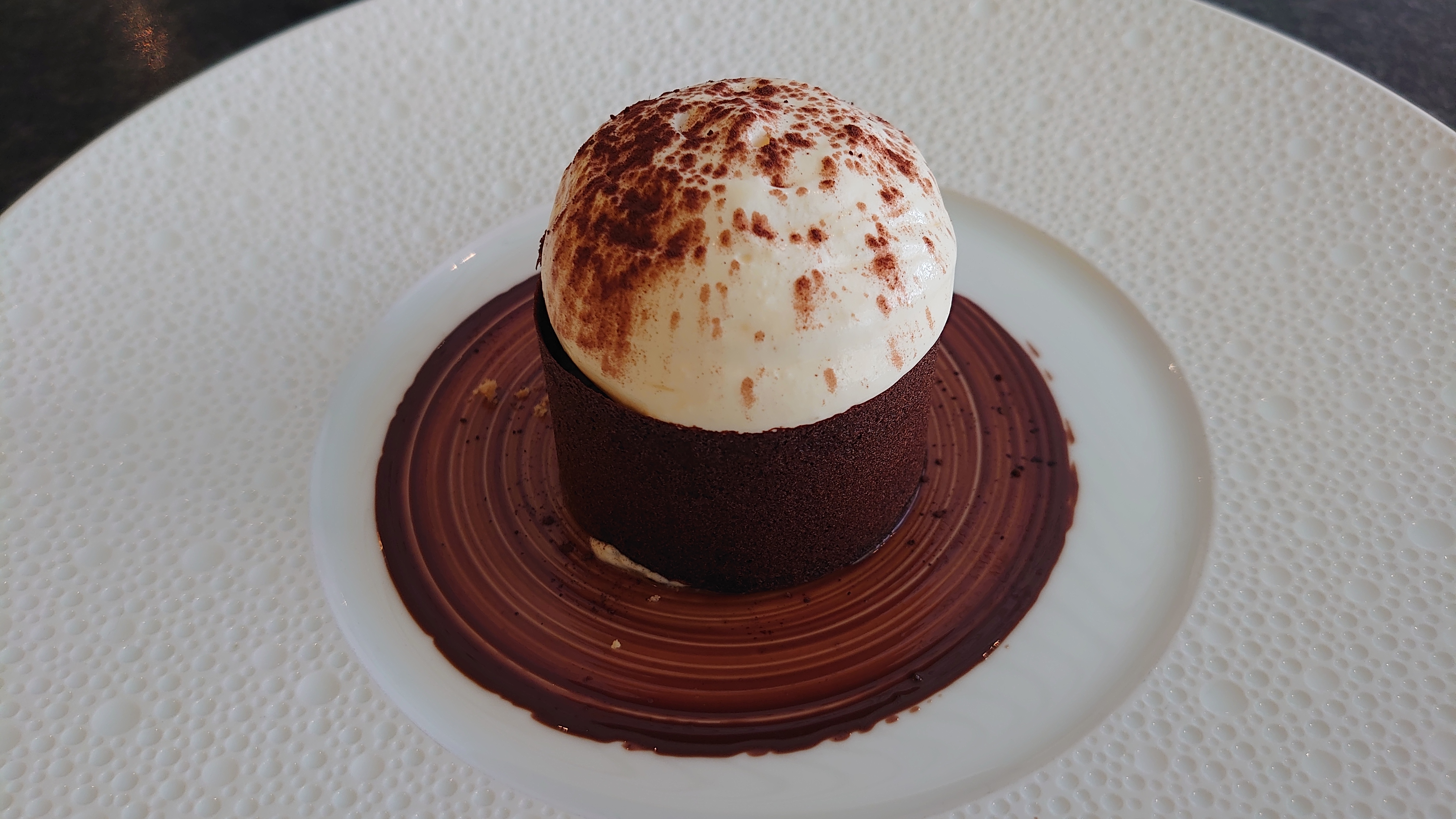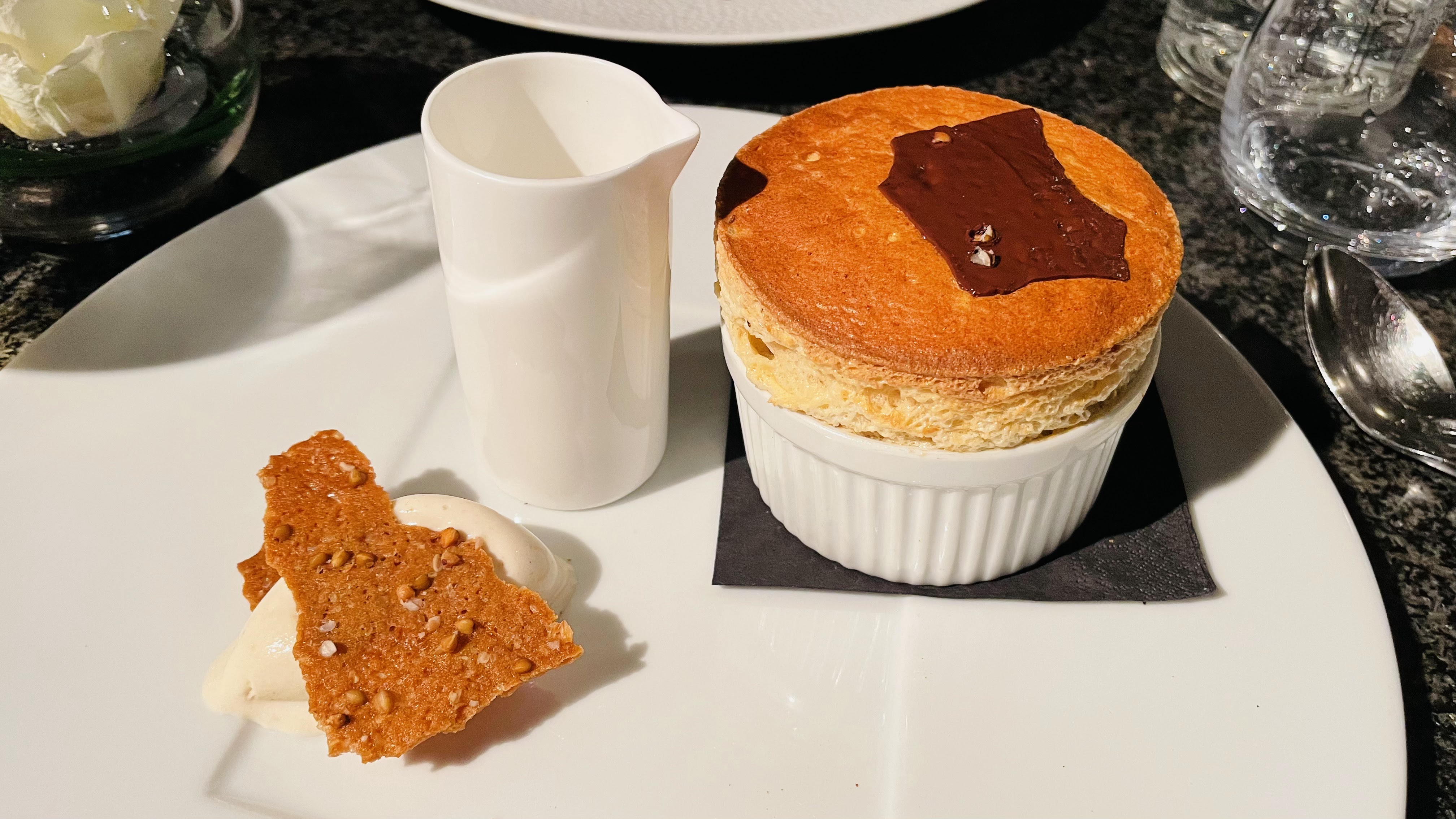 Jusqu'où ira le chef dans sa quête pour nous régaler?.La salle est toujours aussi classe sans snobisme et la brigade en salle est souriante et connait son métier , connaissance des plats et présence sans insistance. La formule à 56€ est d'un rapport prix qualité rare surtout à Chamonix ou les prix peuvent déraper. Après 2 mises en bouchestout n'est qu'equilibre et plaisir puis on finit avec un soufflé à tomber et des mignardises délicieuses..le fait maison par le chef italien et son chef pâtissier...l' étoile n'est pas loin!!