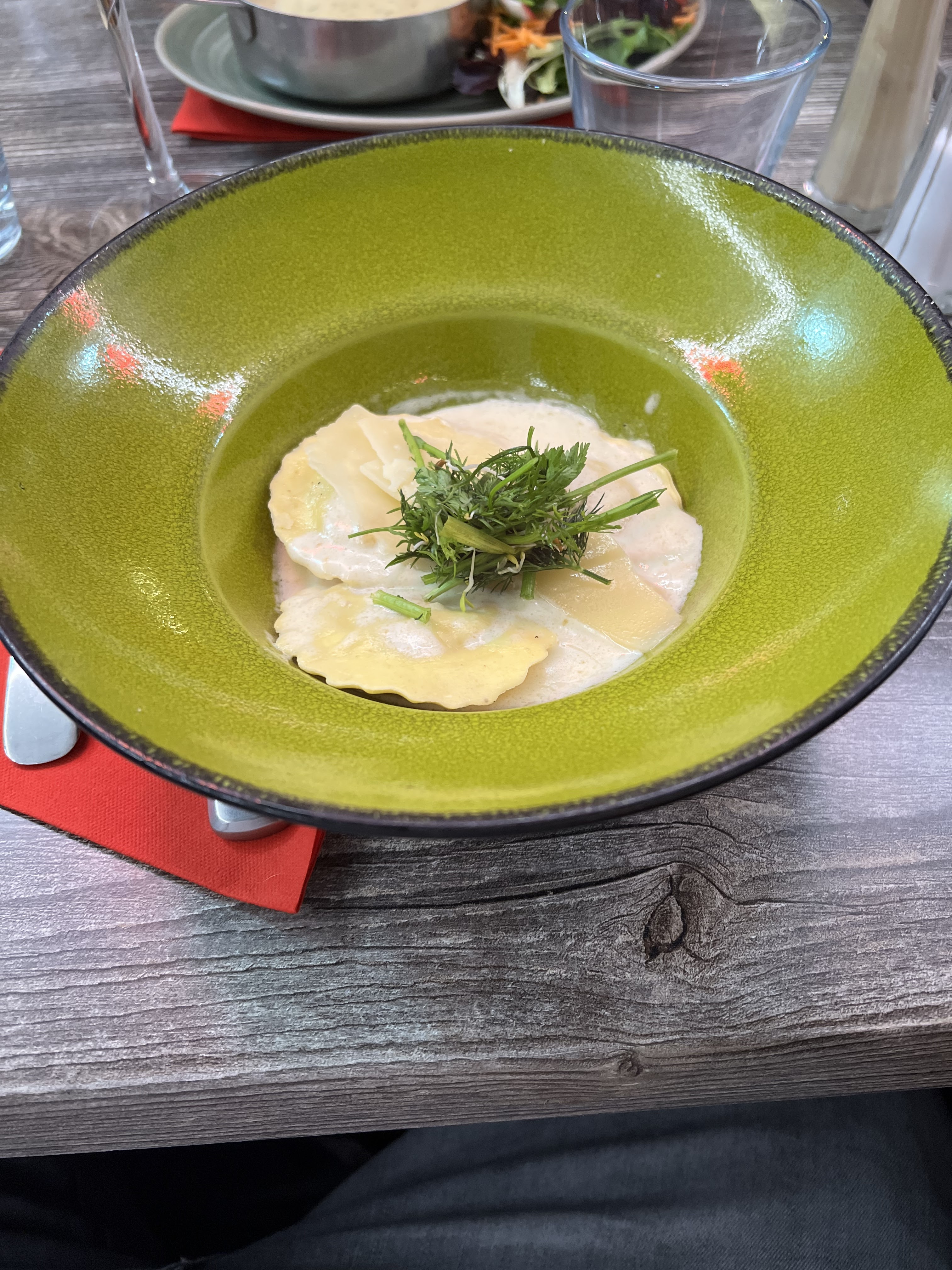 Très bon accueil Feuilleté de chèvre chaud au miel, Ravioles à la truffe et à la crème de parmesan, ensuite nous avons choisi un plat basique... Dommage il manquait des petites tables sur la terrasse pour les fumeurs..