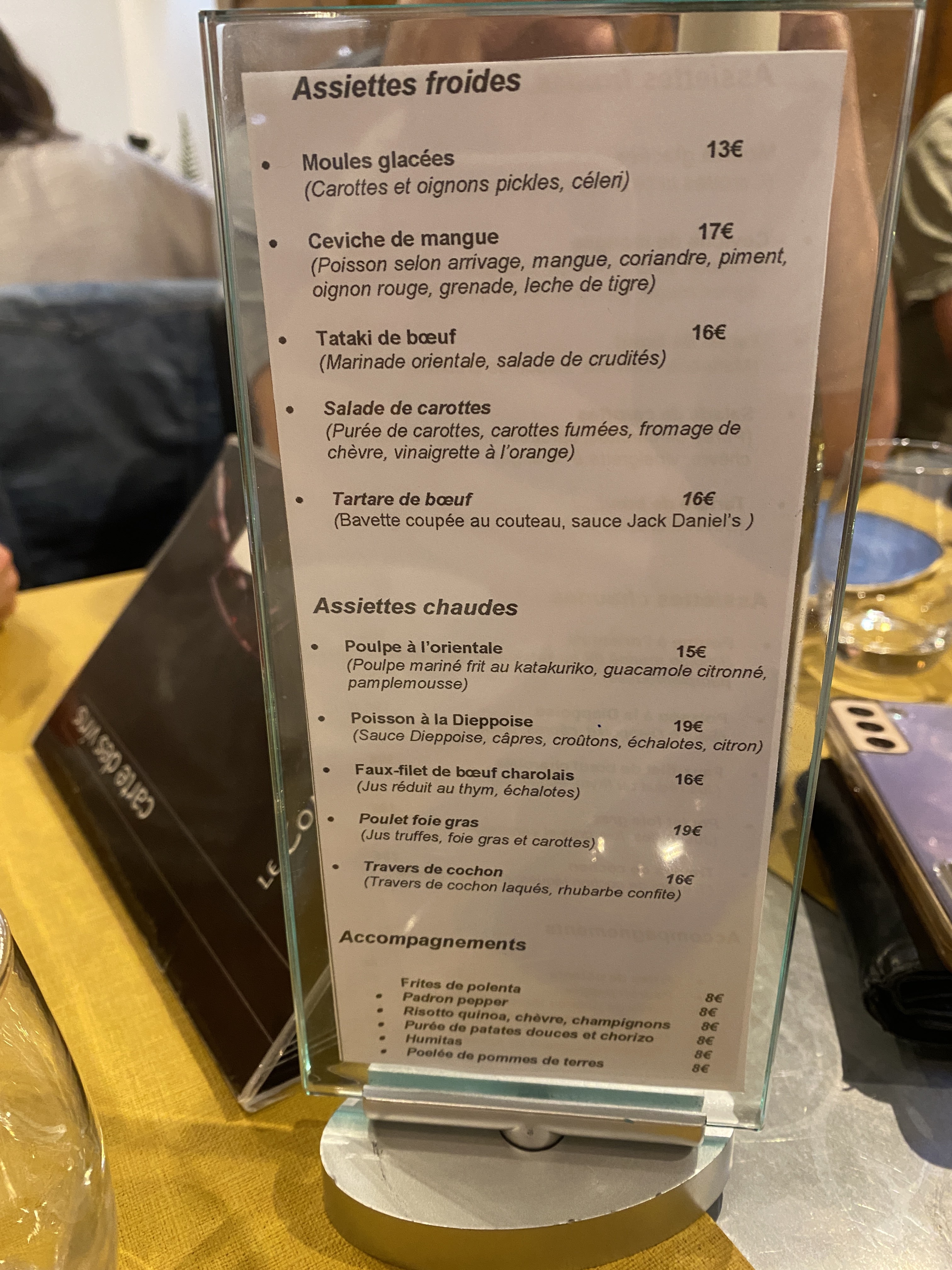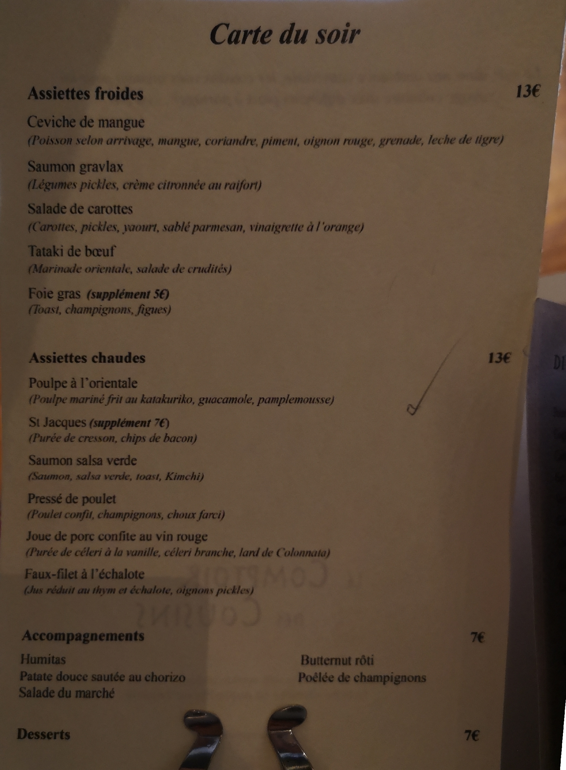 2ème expérience dans cet endroit, une fois un midi, carte sous forme de formule du jour et une autre fois sous forme de carte assiettes froides et chaudes à partager ou non. Produits frais, de qualité et bien travaillés. Un peu cher cependant le soir. Service rien à redire, des personnes avenantes et souriantes avec un sens de la clientèle que l'on voit rarement ! Je recommande.