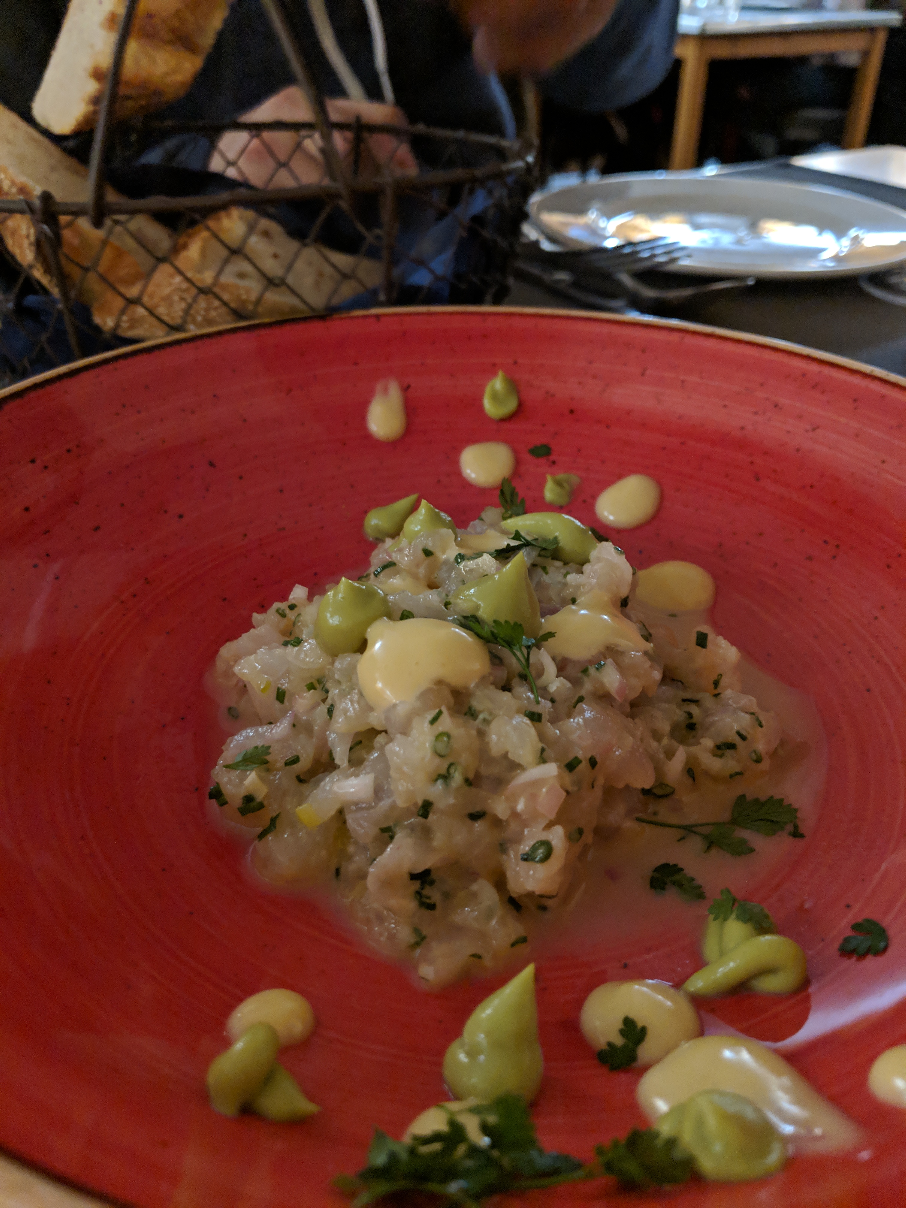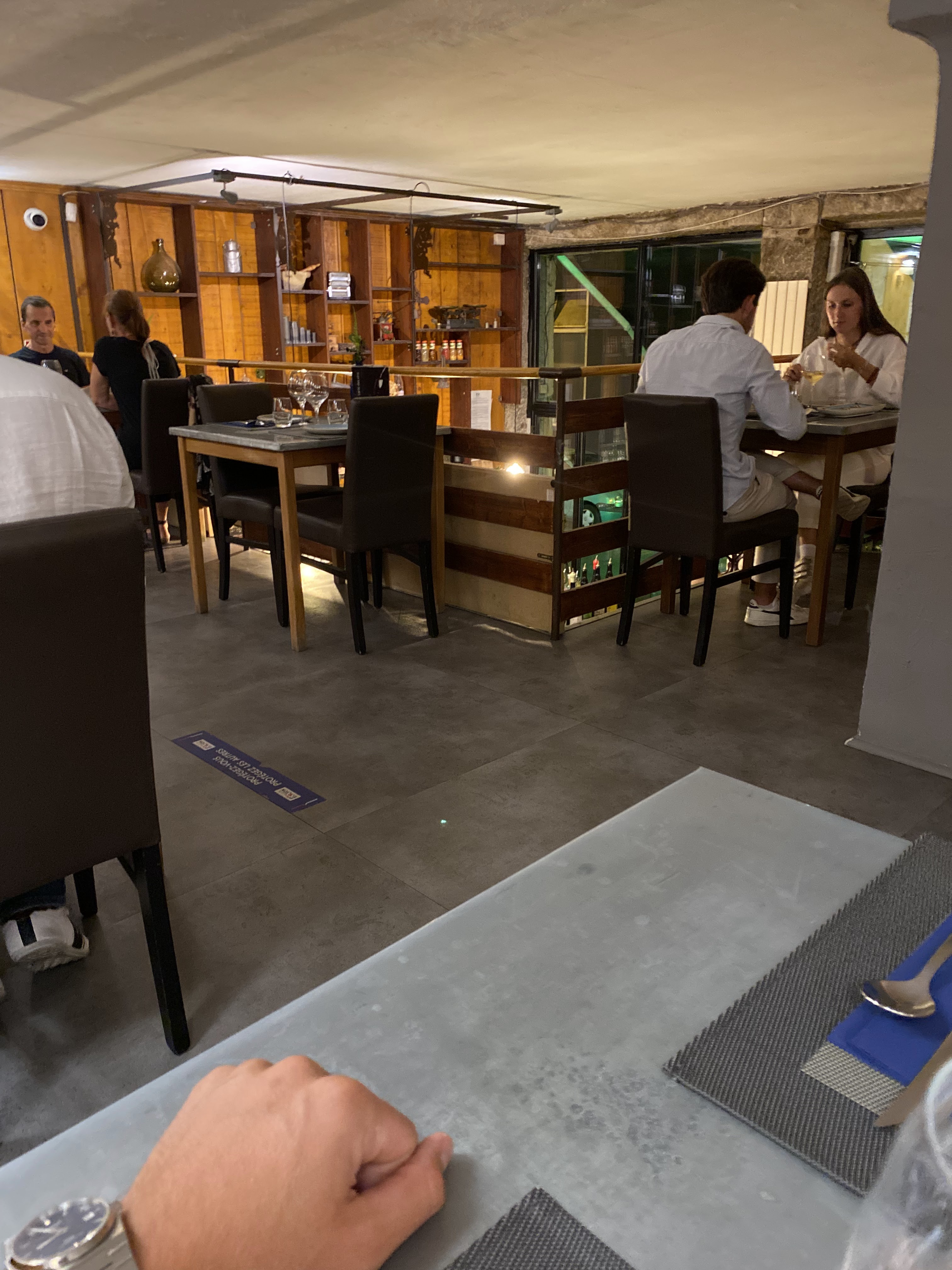 Heureusement que ce restaurant est ouvert un lundi en août. Lieu confortable sur deux étages. Chaque cours est conçu pour être partagé. Ce n’est pas comme les tapas, où tout est servi en même temps. Le service était bon mais altéré car il n'y avait que deux serveurs pour tout le restaurant. La nourriture était délicieuse. Je recommande d'essayer la poulpe et le ceviche. Le gâteau au chocolat était du pal mal mais peut être agrémenté d'un peu de calvados ! Il faut réserver. C'est la France.