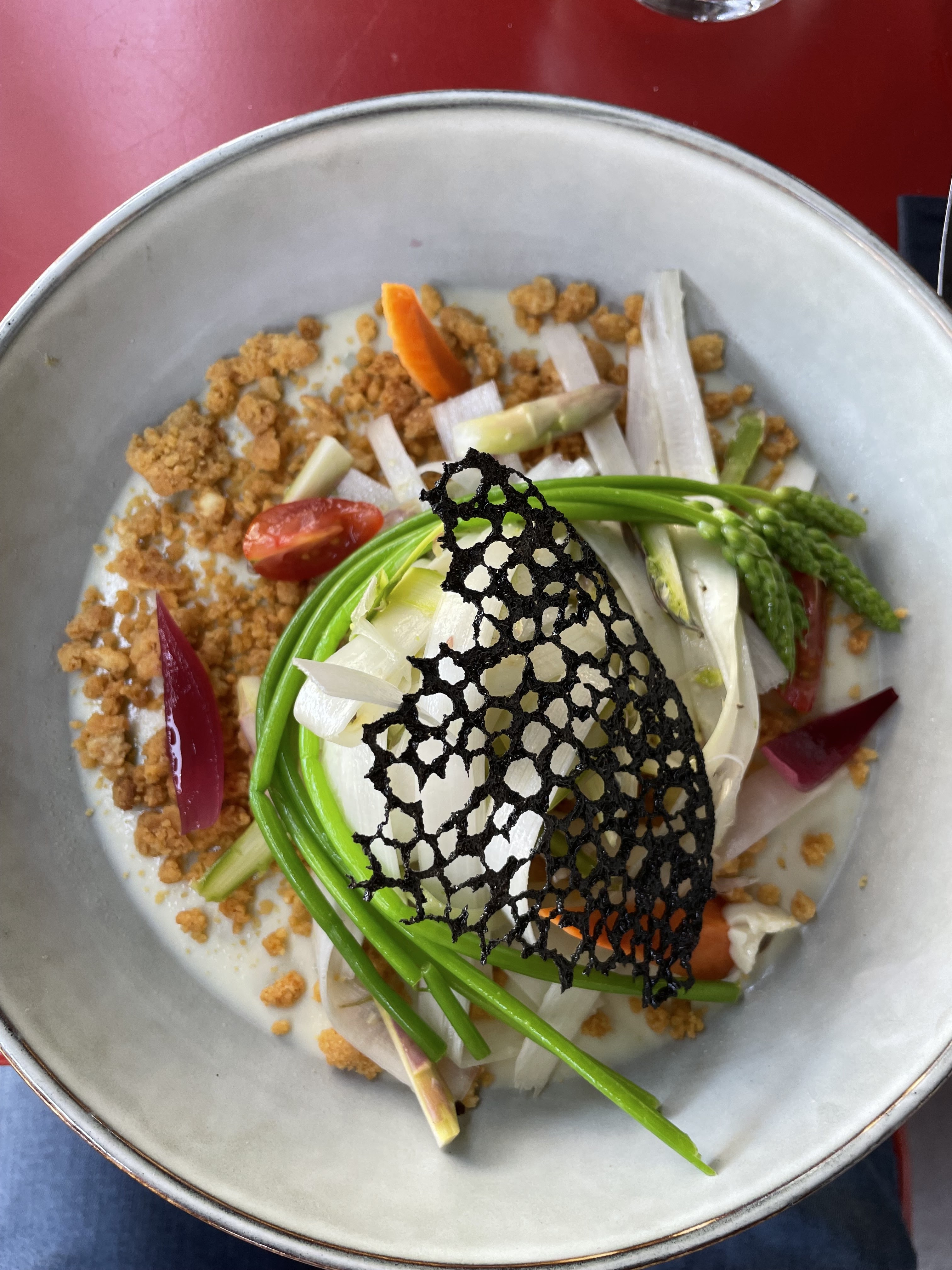 Très mauvais accueil. Nous avions réservé une table en extérieur et avons été placés en fond de salle au prétexte qu'il faisait frais. En fait par commodité pour le service... L'amuse bouche sans interêt: aucune saveur. Le plat ( attendu 1 heure) très indigeste. Trois asperges dites croquantes étaient simplement panées , accompagnées de 2 oeufs mollets et quelques feuilles de salade. Et que dire de quelques ris de veau sur une grosse purée ! Les desserts sans interêt ( glace sans saveur alors que le chocolatier du coin est un expert en glaces et sorbets). Le tout beaucoup trop cher pour la qualité et la banalité. Banalité