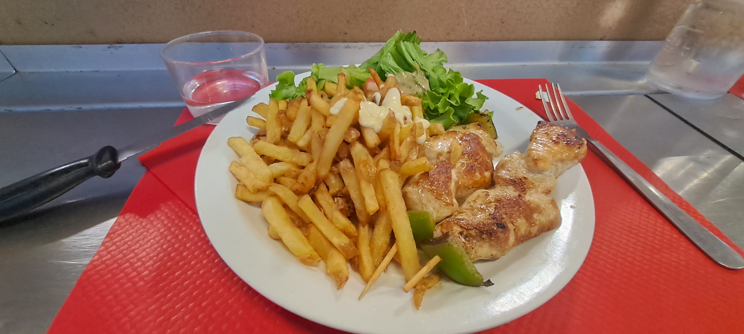 Le plat se compose de deux brochettes de poulet, de nombreuses pommes de terre et d'une salade. 17 € + boire un verre de vin ou de bière 20 €
