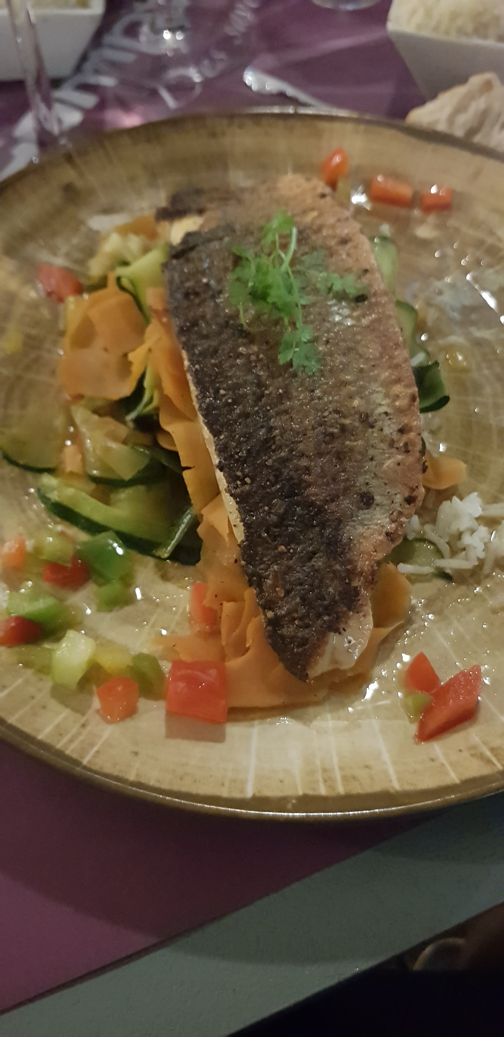 Filet de dorade frais, servis avec des tagliatelles de légumes bien assaisonnées et cuisinées. Moules marinières excellentes.
