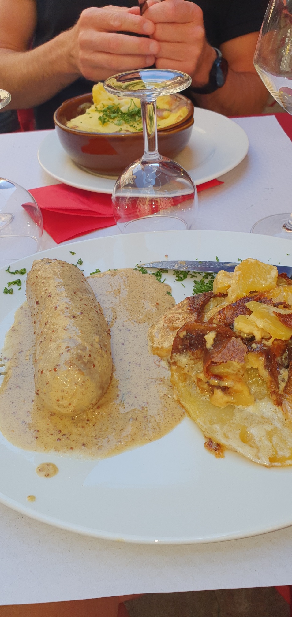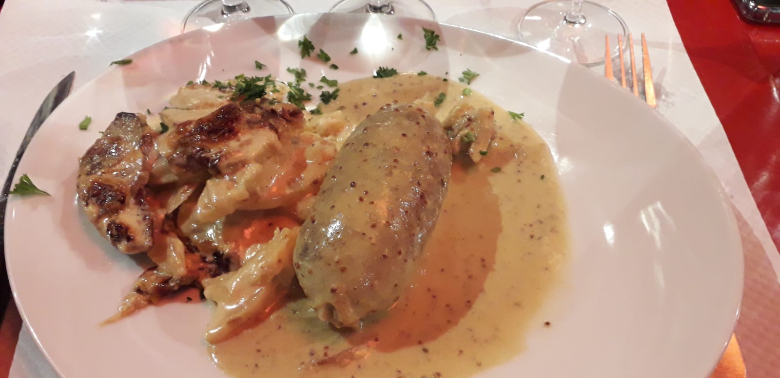 Conseillé par des Lyonnais rencontré en gîte, une bonne adresse avec un menu à 19 € que l'on a apprécié. Sur la photo on a le Parmentier à la saucisse et une andouillette à la moutarde. Attention, le service du midi s'est arrêté à 14h00.