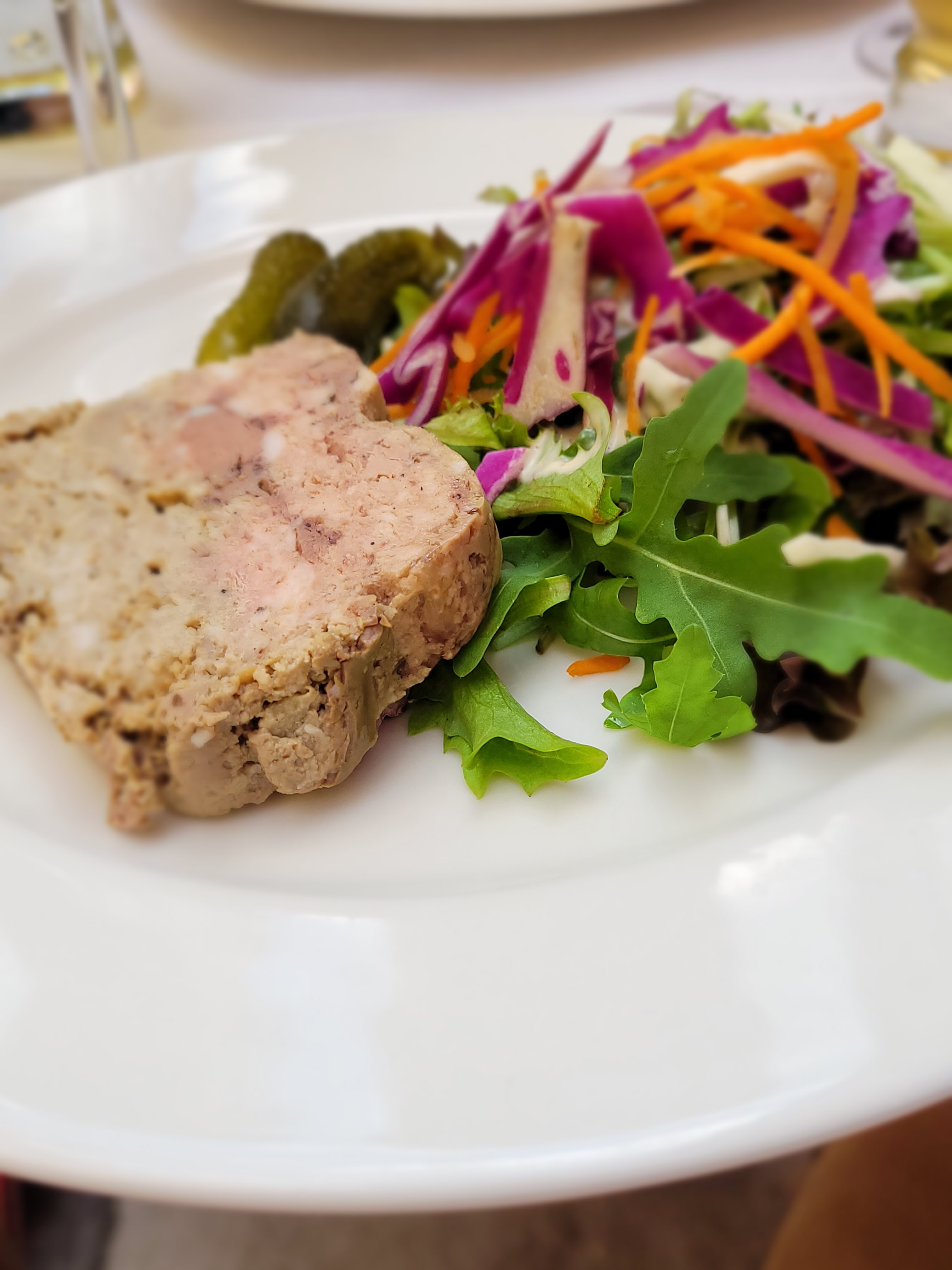 Menu à 24€ 2 entrées : pâté de campagne, très bien assaisonné, la salade qui l accompagnée datée de la veille j'imagine, je n'y ai pas touché (bord noir) Les plats : tête de veau :Une autre façon de déguster la tête de veau, à la sauce tomate, olives vertes, champignons (en boîte), et un autre morceau de viande, comme un marengo, avec des morceaux de quenelles dedans. L andouillette était très bonne ! Le gratin dauphinois 👍 Et les desserts : 1 pain perdu (qui malheureusement avait pris un coup de chaud, il avait le goût du brûlé) Et un dessert du jour : un brownie maison (je ne suis pas dessert, mais il était bon) Par contre, un service opérationnel, autant la serveuse que le serveur.