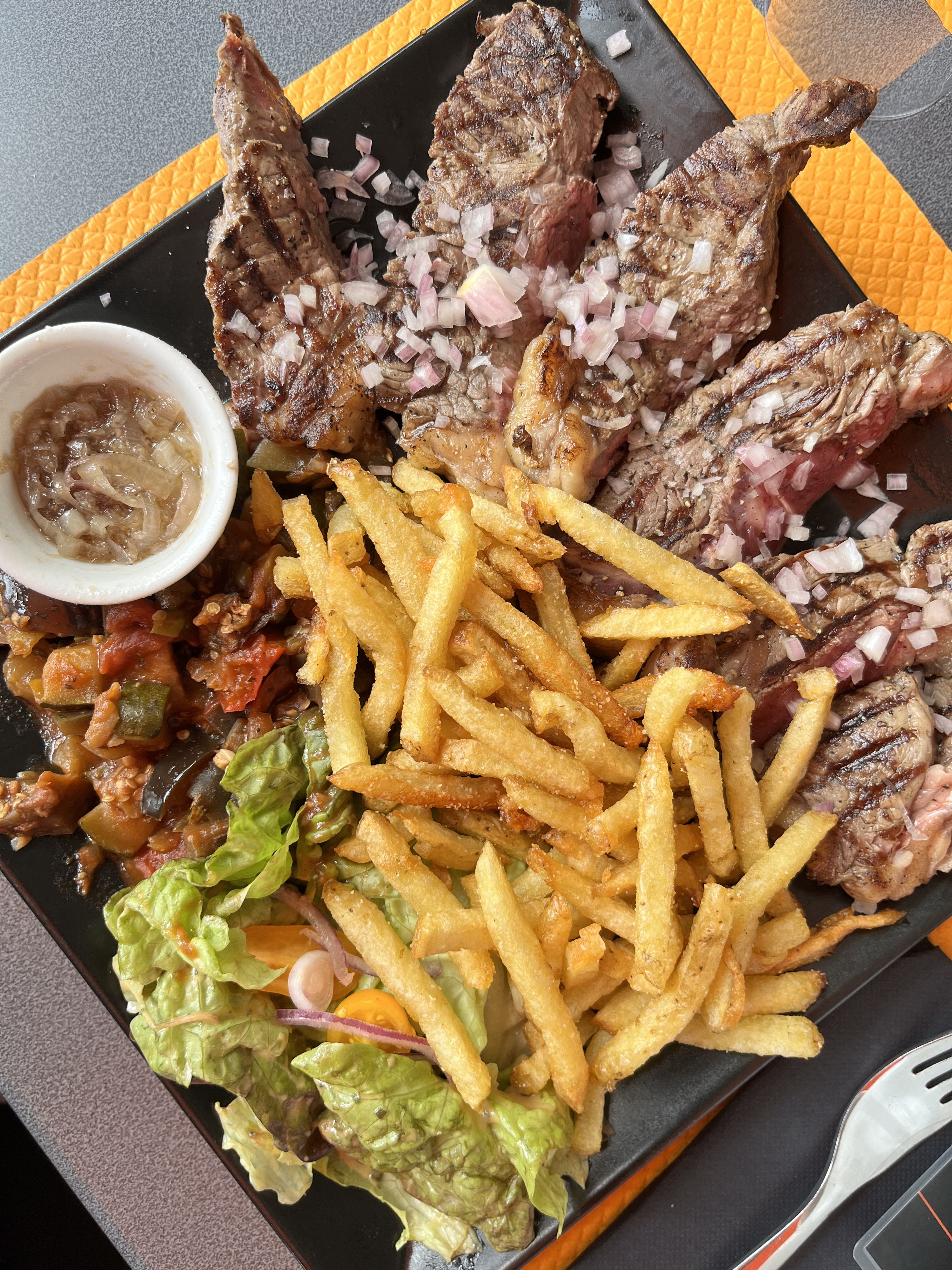 Moi qui ne suis pas fan de l’ail et des oignons et bah là j’ai adoré c’était super bon et le service était efficace malgré le monde.