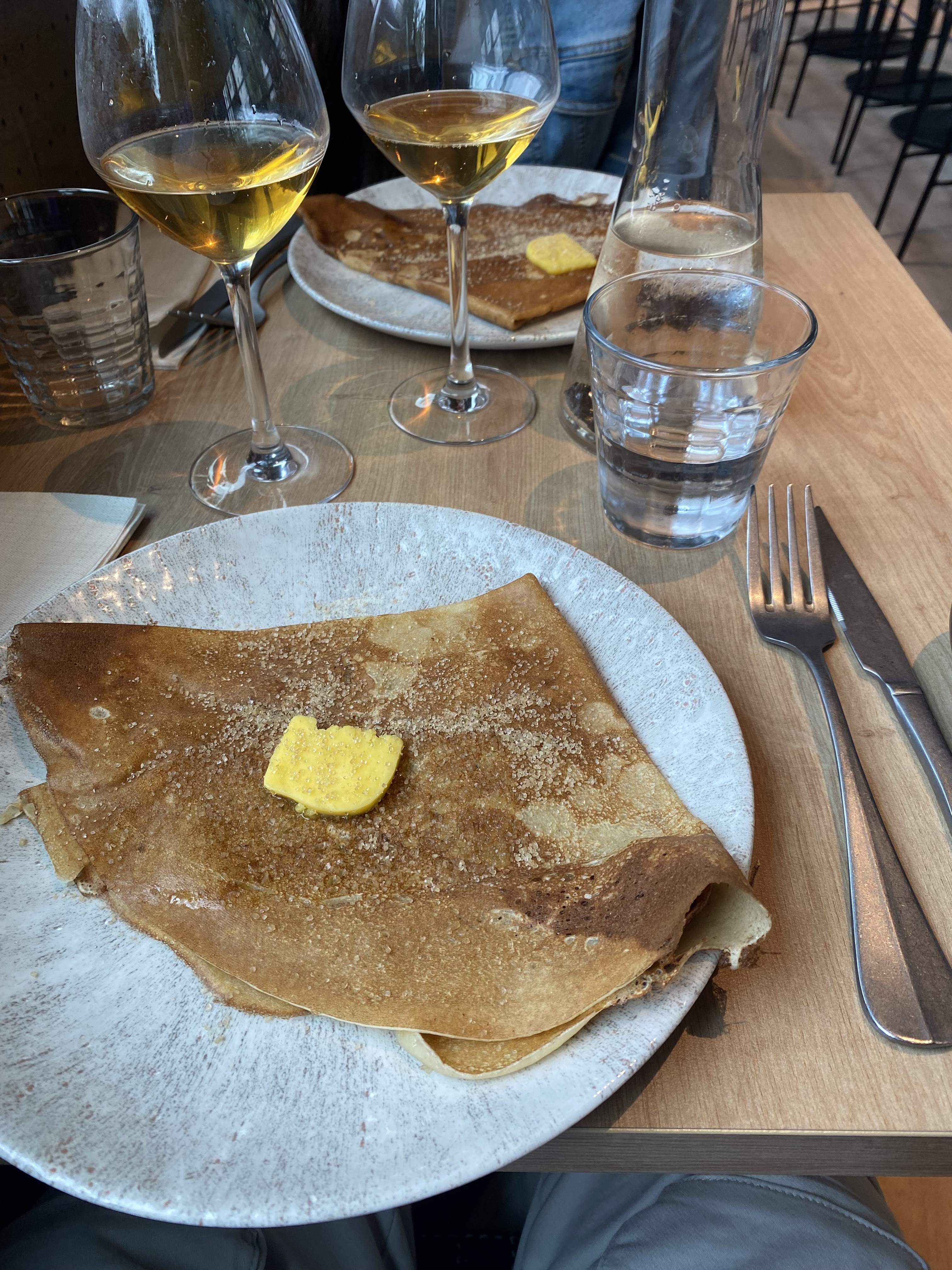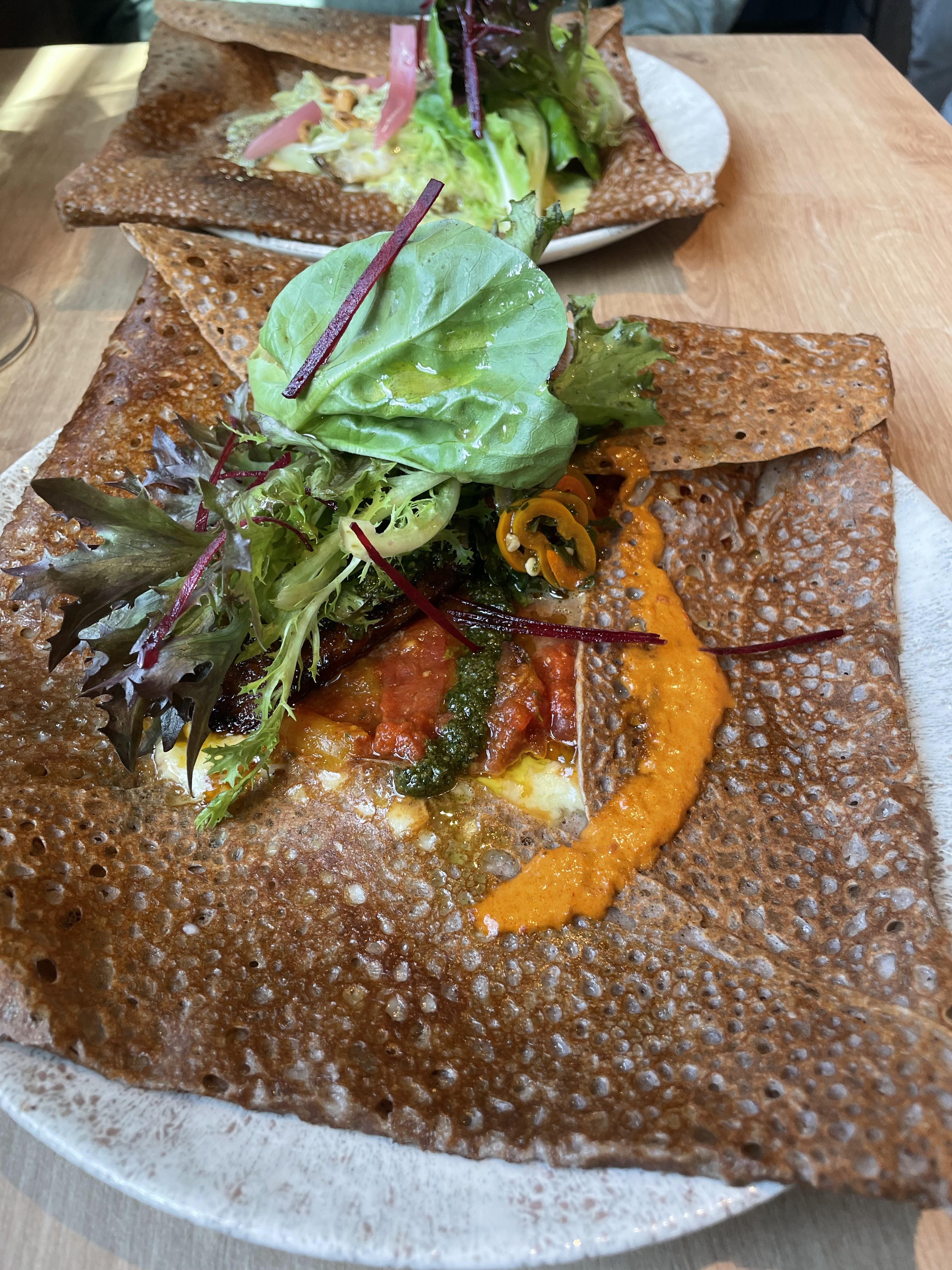 Superbe nouveau lieu pour déjeuner ou dîner dans un endroit atypique! Nous avons pris une assiette de tapas autour du sarrasin, puis la galette du jour et ensuite la crêpe du jour en dessert. Je recommande vraiment le menu du jour car nous avons eu le droit a des galettes originales qui étaient délicieuses. Et le service est chaleureux et parfait, bravo!