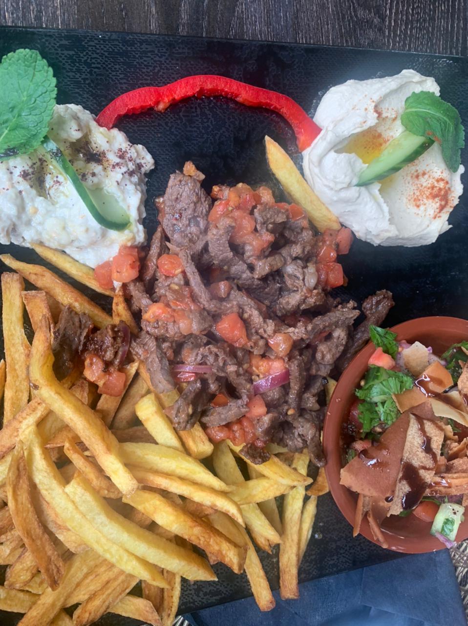 Bonne nourriture et bon service. Nous avons eu l'assiette végétarienne, une sélection de « mezze » comme du houmous, du falafel, etc. Excellent. De la viande est également servie, mais c'est un bon endroit pour les végétariens et les végétaliens.