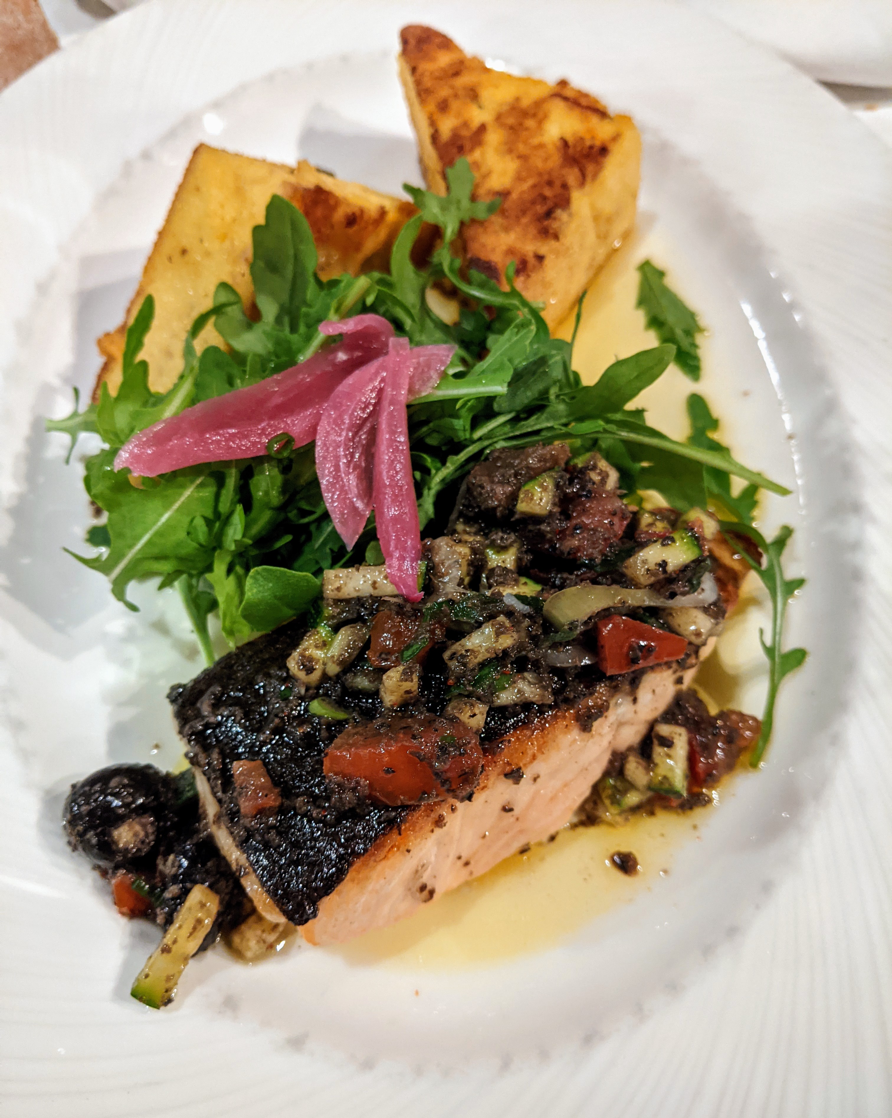 Le menu choisi pour notre dîner était très bon, petit bémol sur le crumble à l'ananas qui était un peu trop sucré à mon goût. Endroit intimiste et chaleureux
