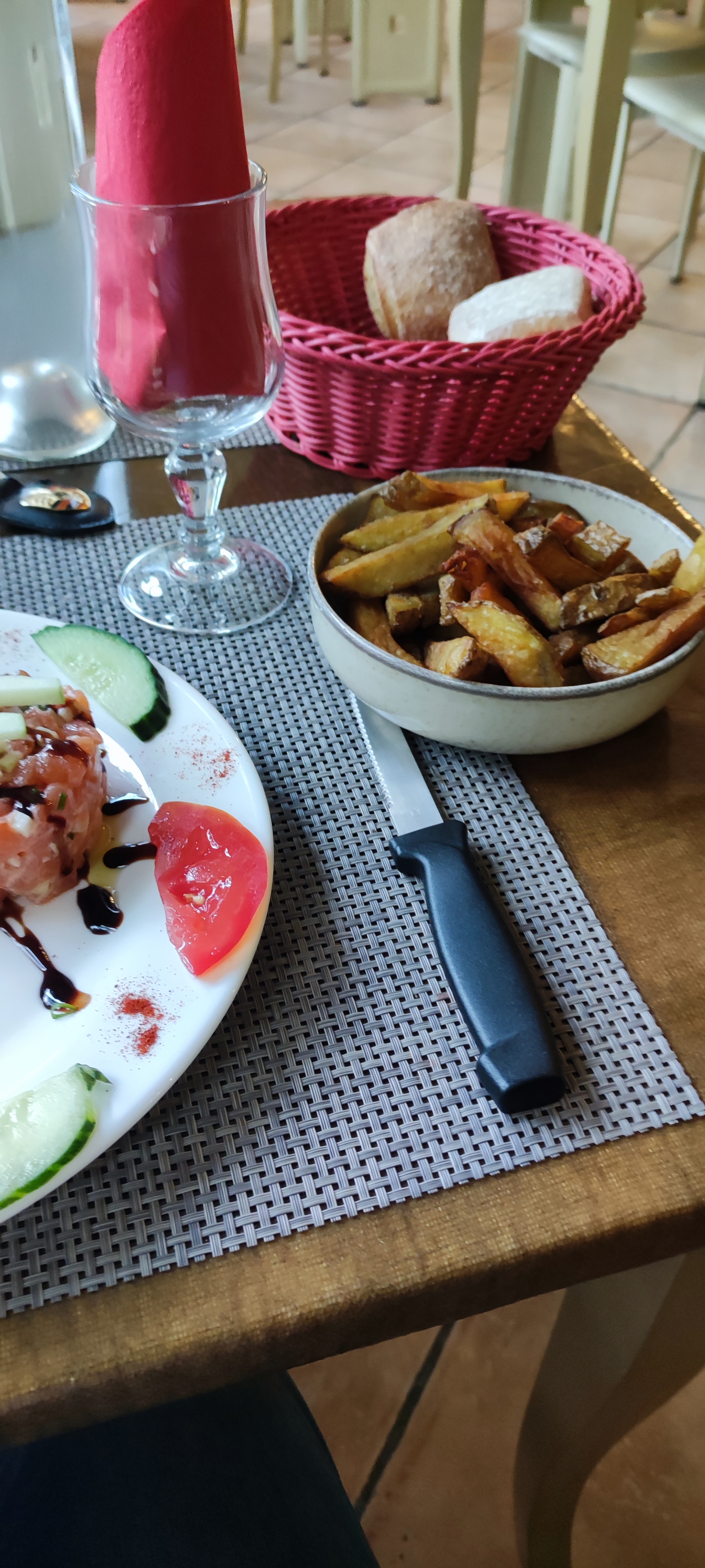 Cadre très joli, petit concert très agréable, Le service rapide, Quelques failles venant du serveur les bouteilles de conditionnement vide on a a pas eu d' autre , le soufflement quand il nous servent. Côté assiette bon, simple mis dans les assiettes pour ma part grossièrement mon tartare de bœuf au chèvre (morceaux trop gros) Visuellement cela n'a pas réveillé mes papilles Repas tête à tête assez rapide moins d' une heure on nous apporte la note sans demandé c est frustrant