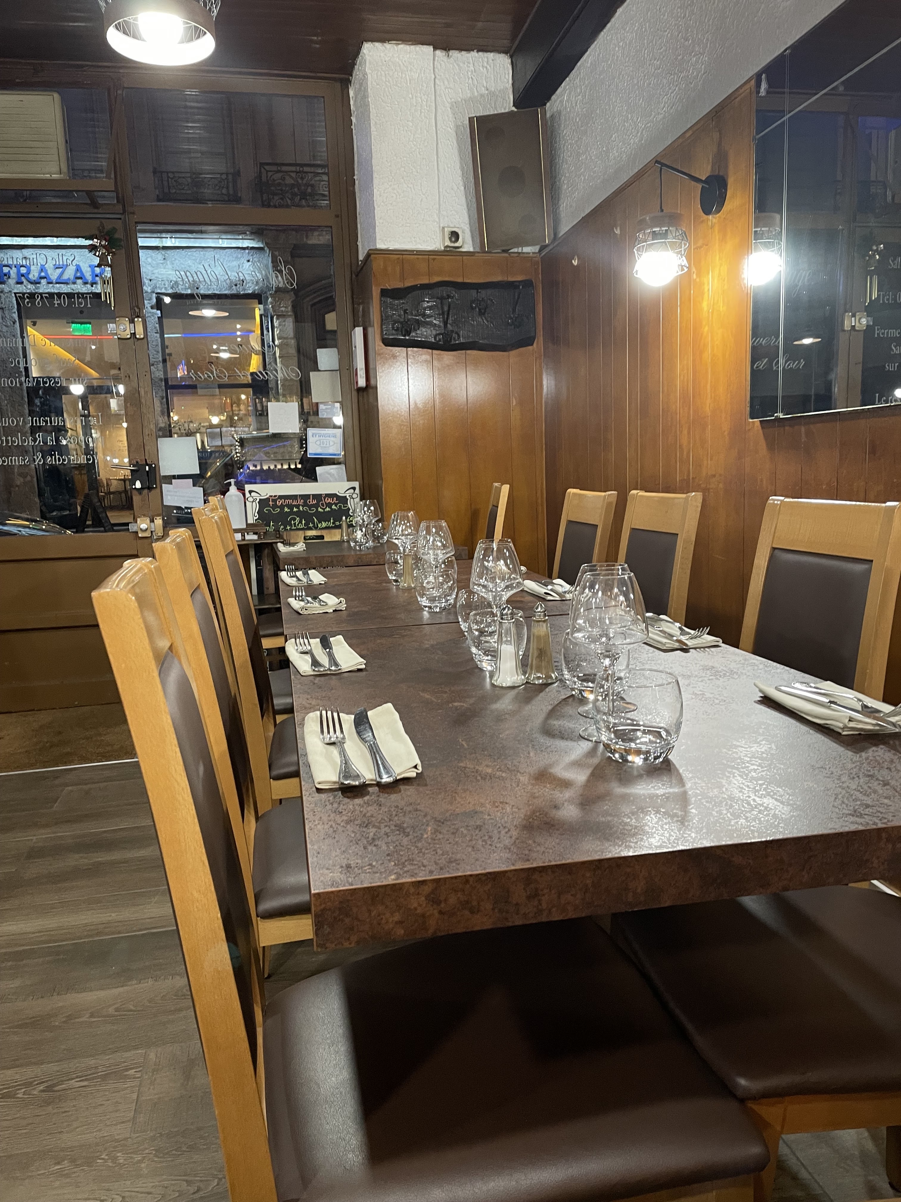 Dîner sans réservation, ce fut assez agréable, le service est rapide (4 autres tables) , les plats bons (tartiflette/quenelles/cuisses de grenouilles/andouillette). Chiche en vin mais celui en carafe est très bien Bonne surprise donc 👍