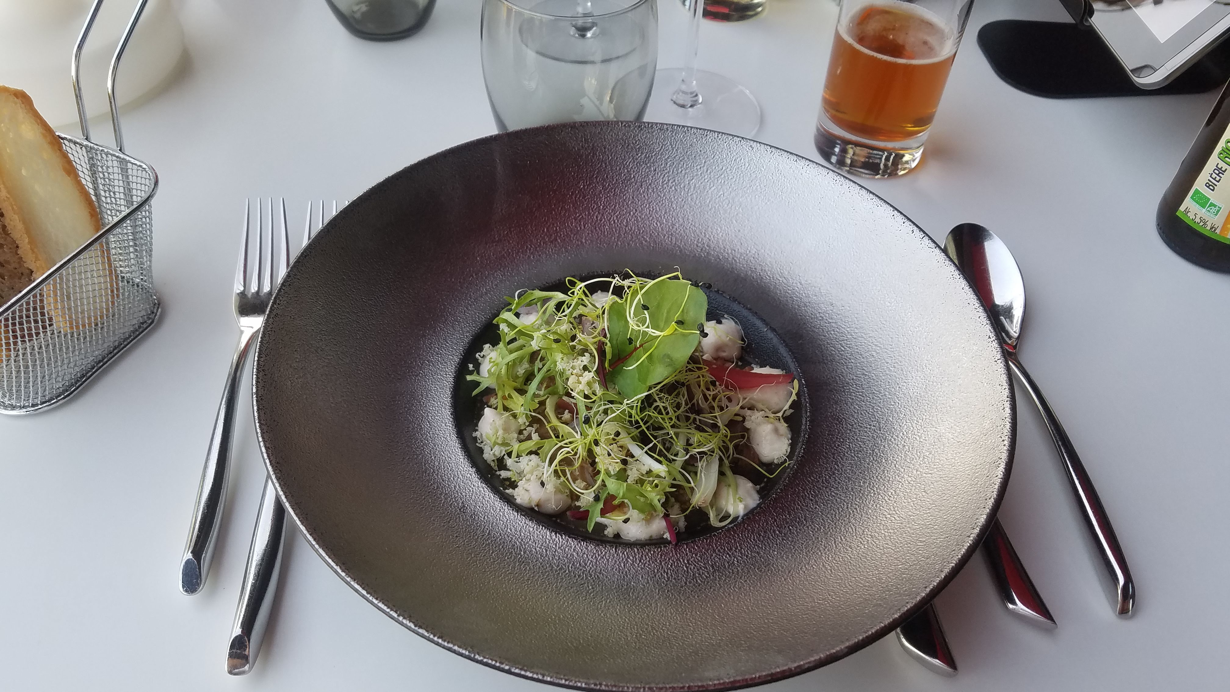 Le lieu est sympa, bel espace, des fauteuils confortables. Une carte courte qui donne la part belle aux poissons. Bref un bon départ ponctué de faux pas, carafe d'eau oubliée, corbeille de pain sur demande, verre de vin oxydé, poisson trop salé. ..et le plus dommage la cuisine met plein de jeunes herbes sur les plats mais le serveur fait un service minimaliste et du coup on ne sait pas ce que l'on mange. Du potentiel.
