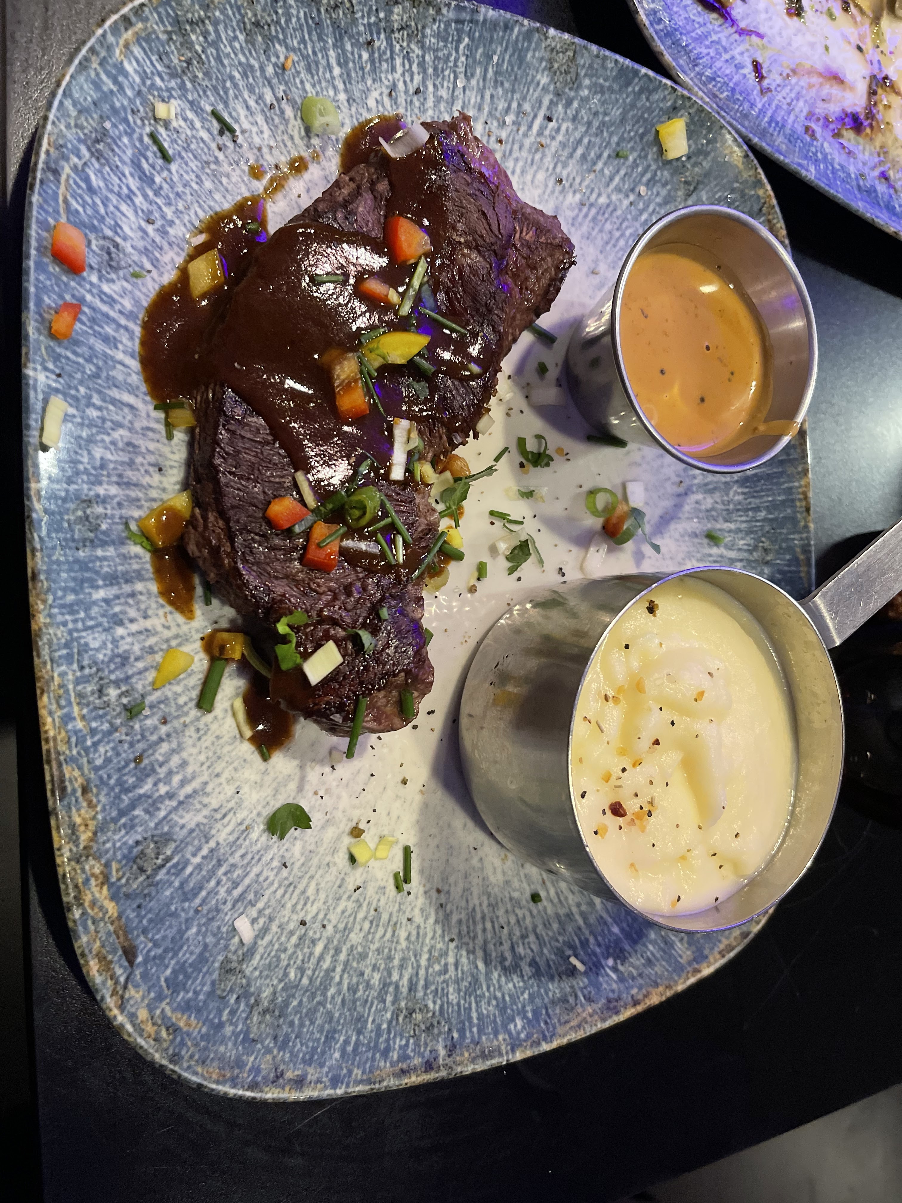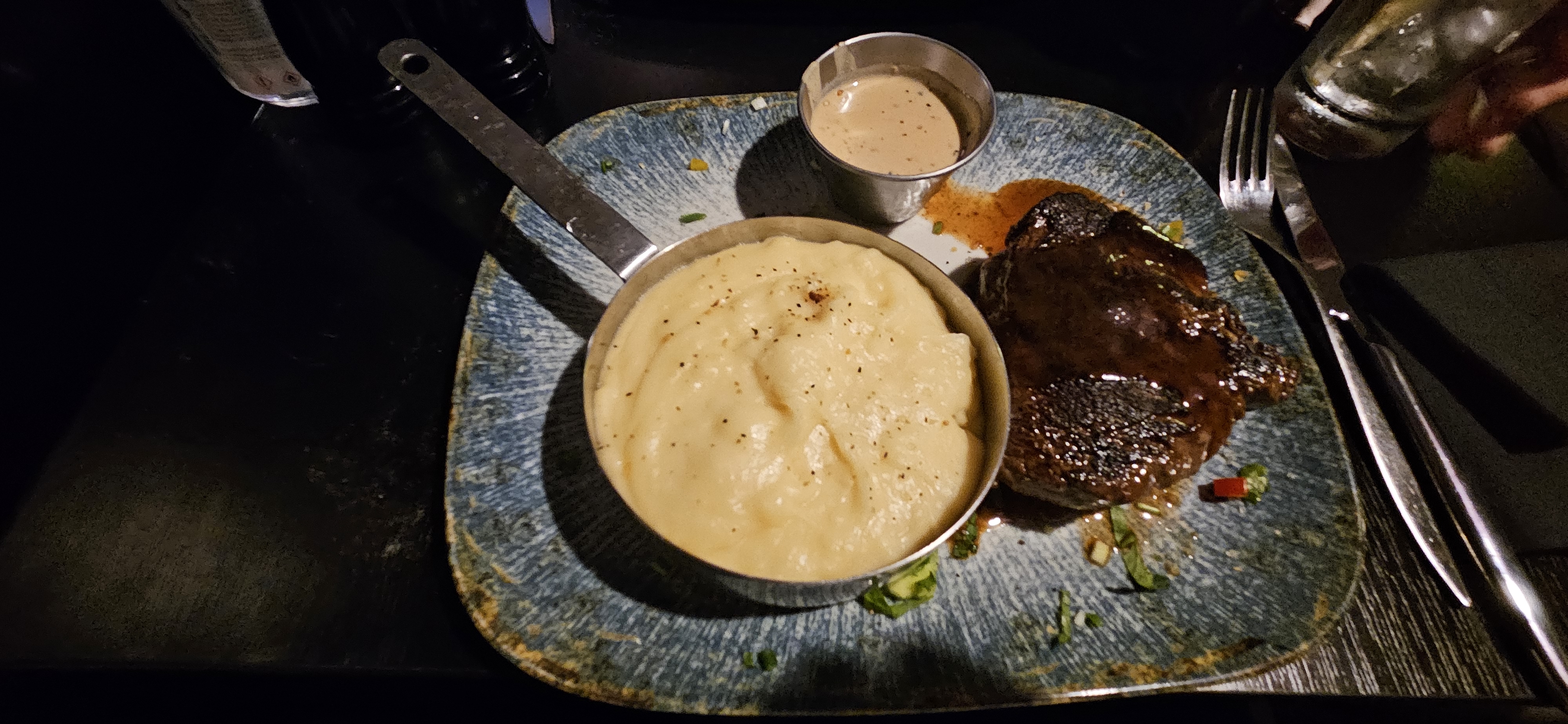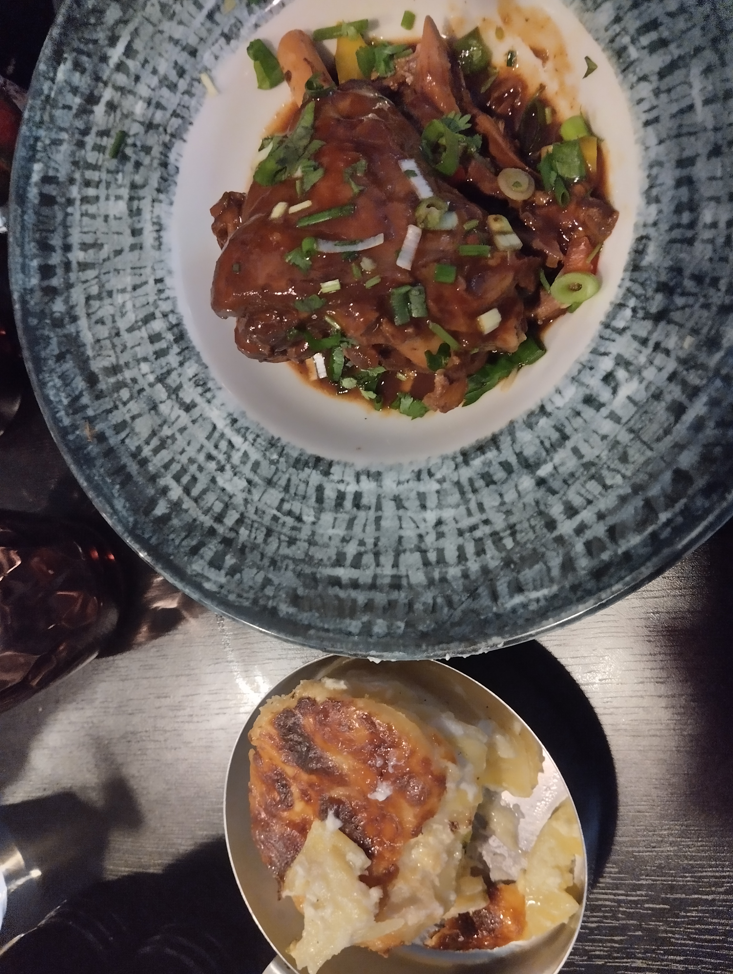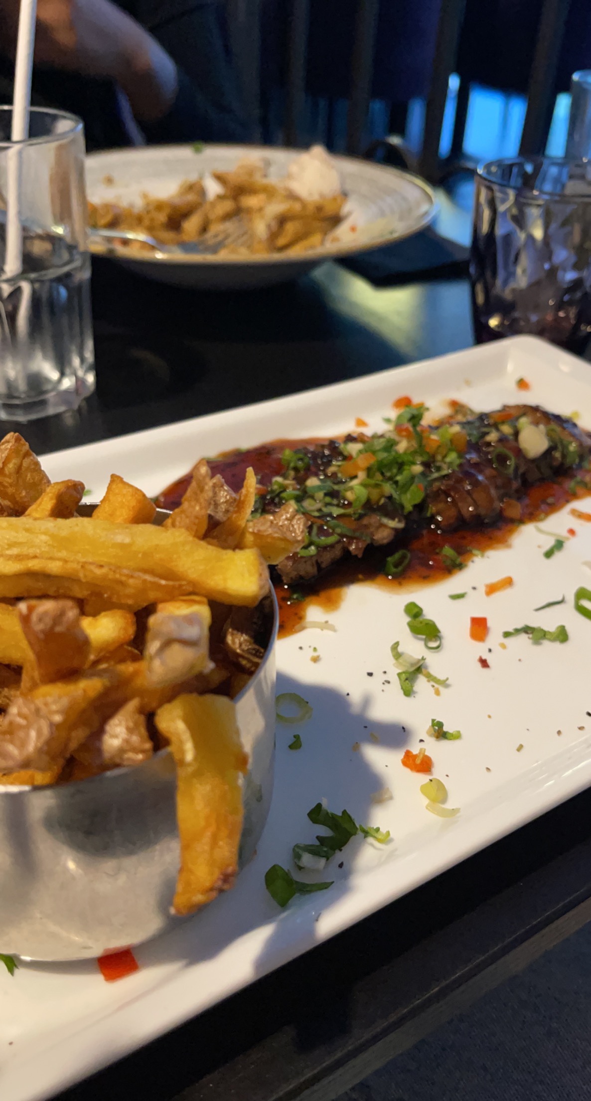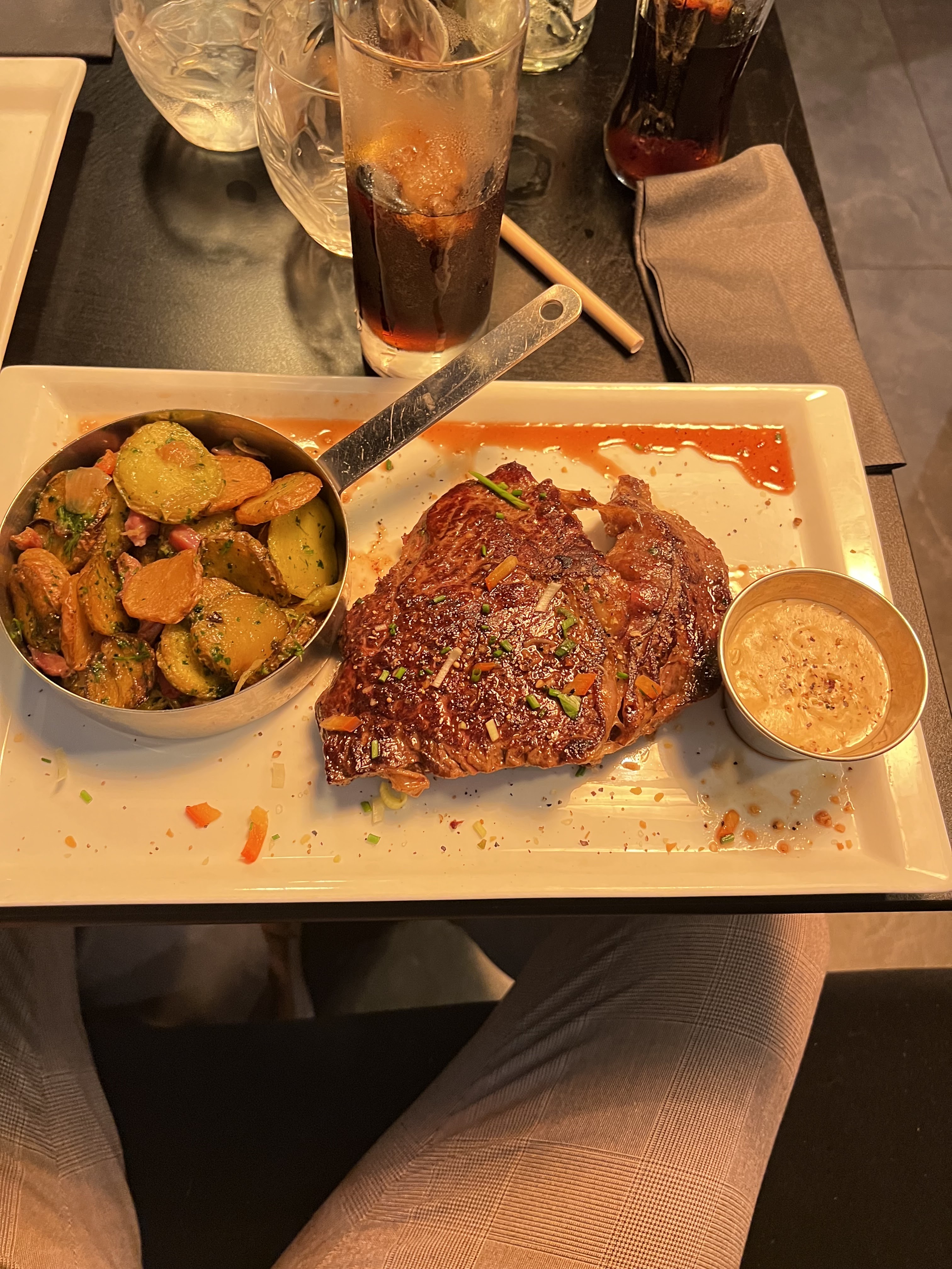 Notre serveur marocain était très attentionné et gentil! La nourriture était malheureusement à l'opposé 😕. Steak de filet commandé et steak de faux-filet et les deux étaient de la viande de mauvaise qualité. Je n'ai pas fini non plus. La dauphinoise de pommes de terre était mal faite avec la crème fendue et le fromage dessus trop cuit. Les pâtes au poulet étaient sèches et sans goût. La dame qui semblait être la directrice doit vraiment adopter une approche plus amicale et être plus gentille - elle avait l'impression d'avoir un professeur d'école strict qui se promenait dans les lieux et gâchait l'atmosphère. Dans l'ensemble, je ne recommanderais pas cet endroit