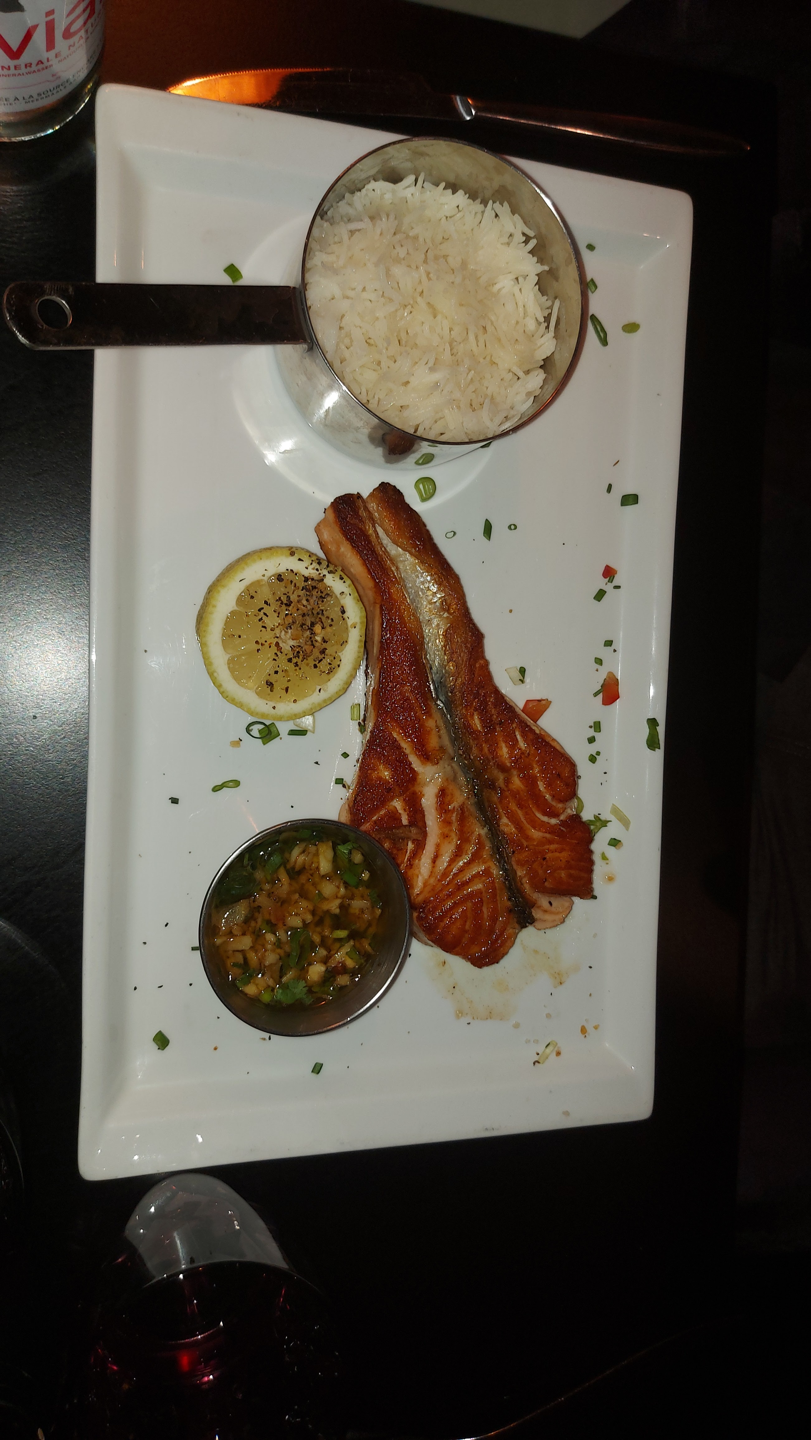 C’est tellement délicieux et nous sommes tellement rassasiés malgré la portion. Nous avons eu: -La Buratta - Darne de Saumon Grillé - Filet de poulet avec sauce au miel Niveau prix, c'est un peu cher mais ça vaut vraiment le coup. Je le recommanderais à tous ceux qui souhaitent manger des plats raffinés + halal dans le centre de Paris