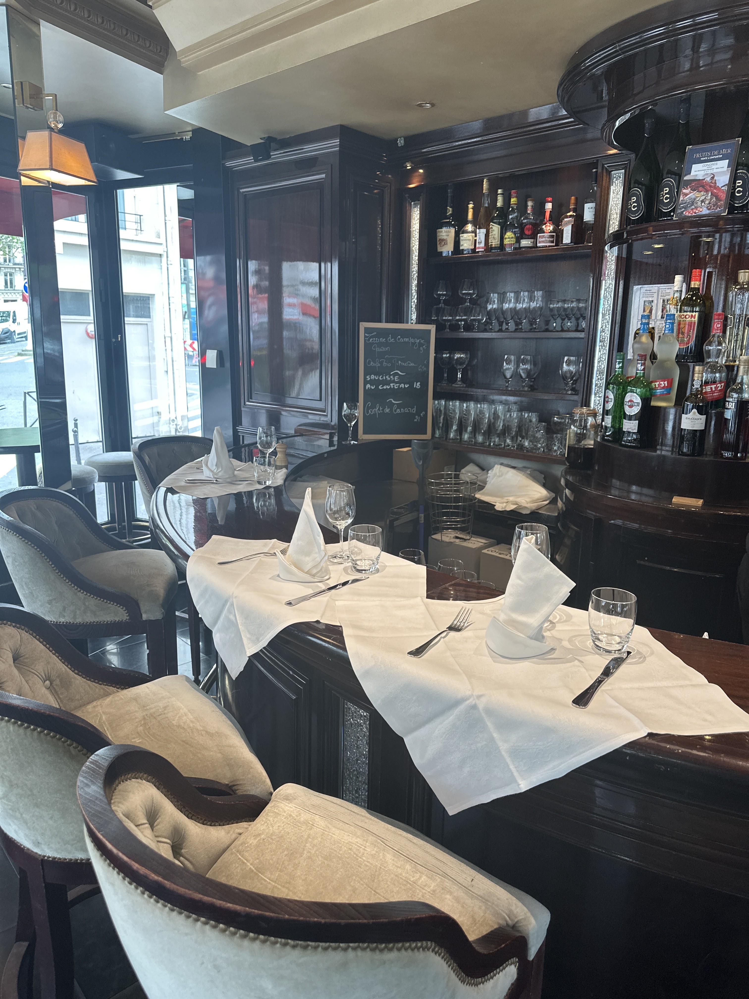 un bruit infernal d'une table avec des italiens, un service très tres moyen. 24 huîtres même pas servi dans un plateau, mon cabillaud à peine chaud avec une Béarnaise quémandéé à peine chaude, un Fontainebleau directement sorti du réfrigérateur... donc plus jamais cette adresse 😡