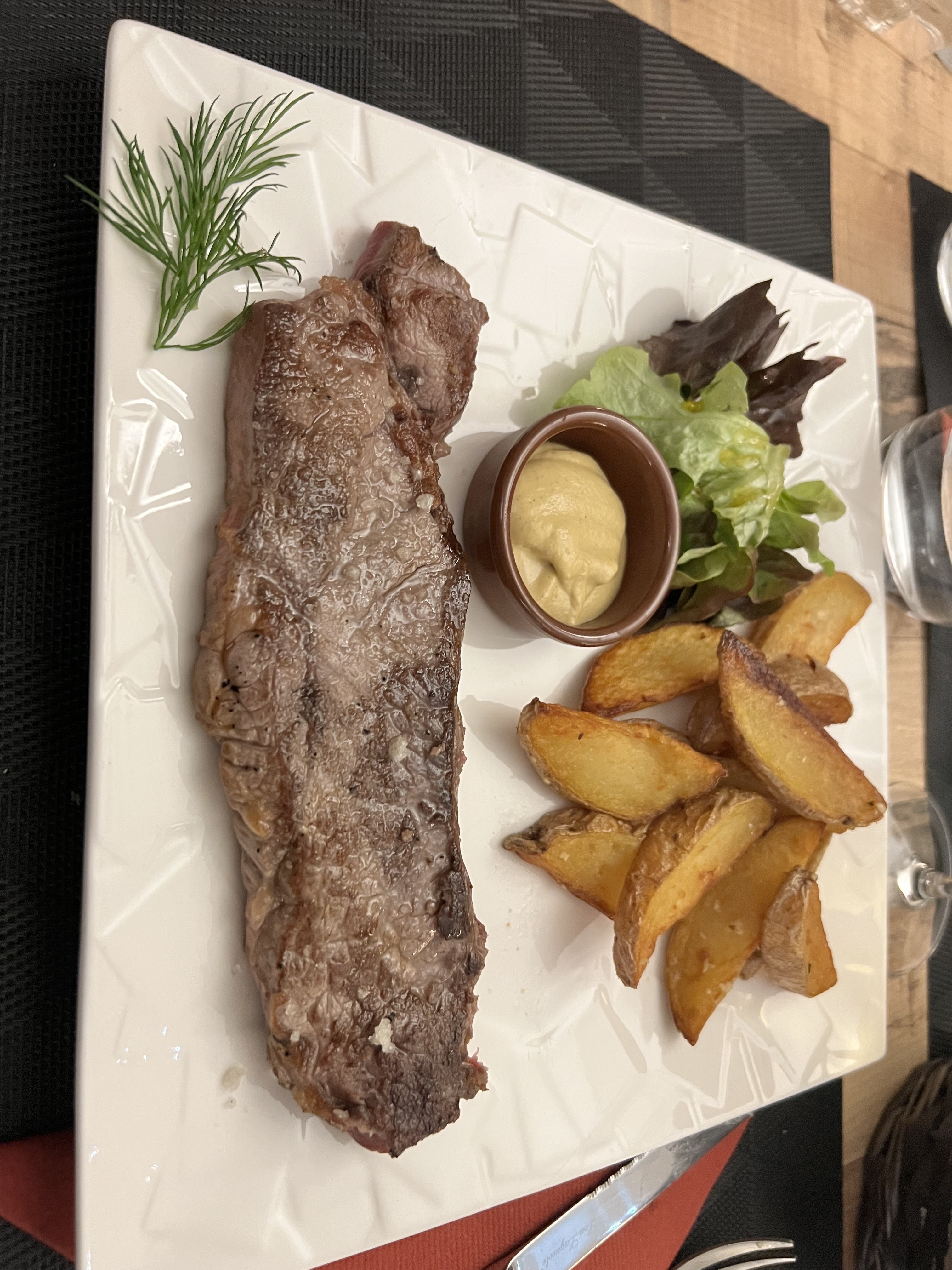 Le magret sauce porto super bon , servi avec des frites maison , un REGAL! Je recommande pour leurs plats ainsi que pour la symphatie des serveur(e)s/cuisto 👌