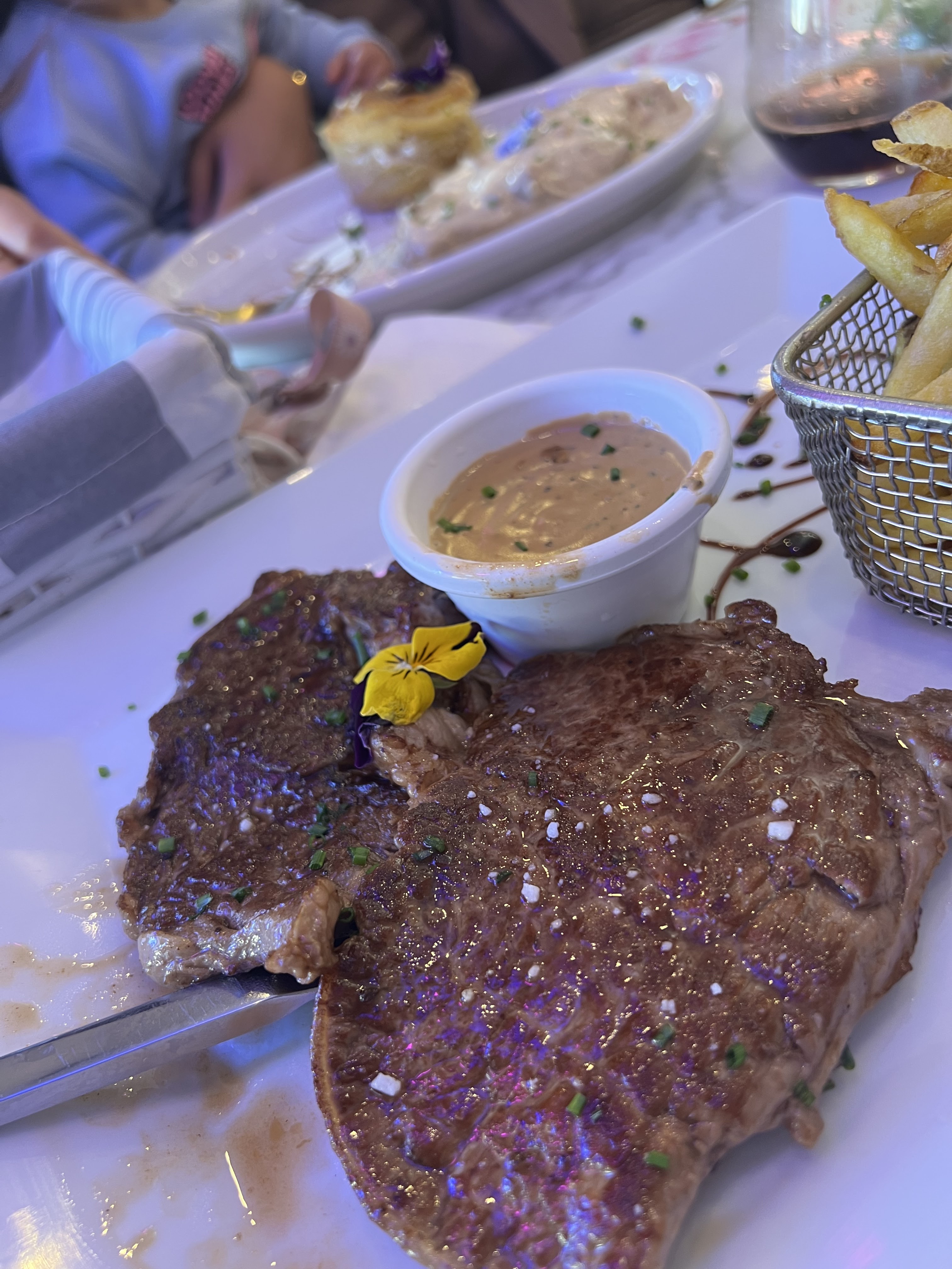 Je ne comprends vraiment pas les avis positifs. La cuisson de la viande n’a pas été respectée, la viande était sans goût, aucun assaisonnement. Les frites n’étaient pas bonnes. J’ai mis mon téléphone à charger près du comptoir en prévenant le serveur, pendant le dîner il s’est permis de le prendre pour prendre des photos avec son collègue, ce qui n’est pas professionnel du tout.