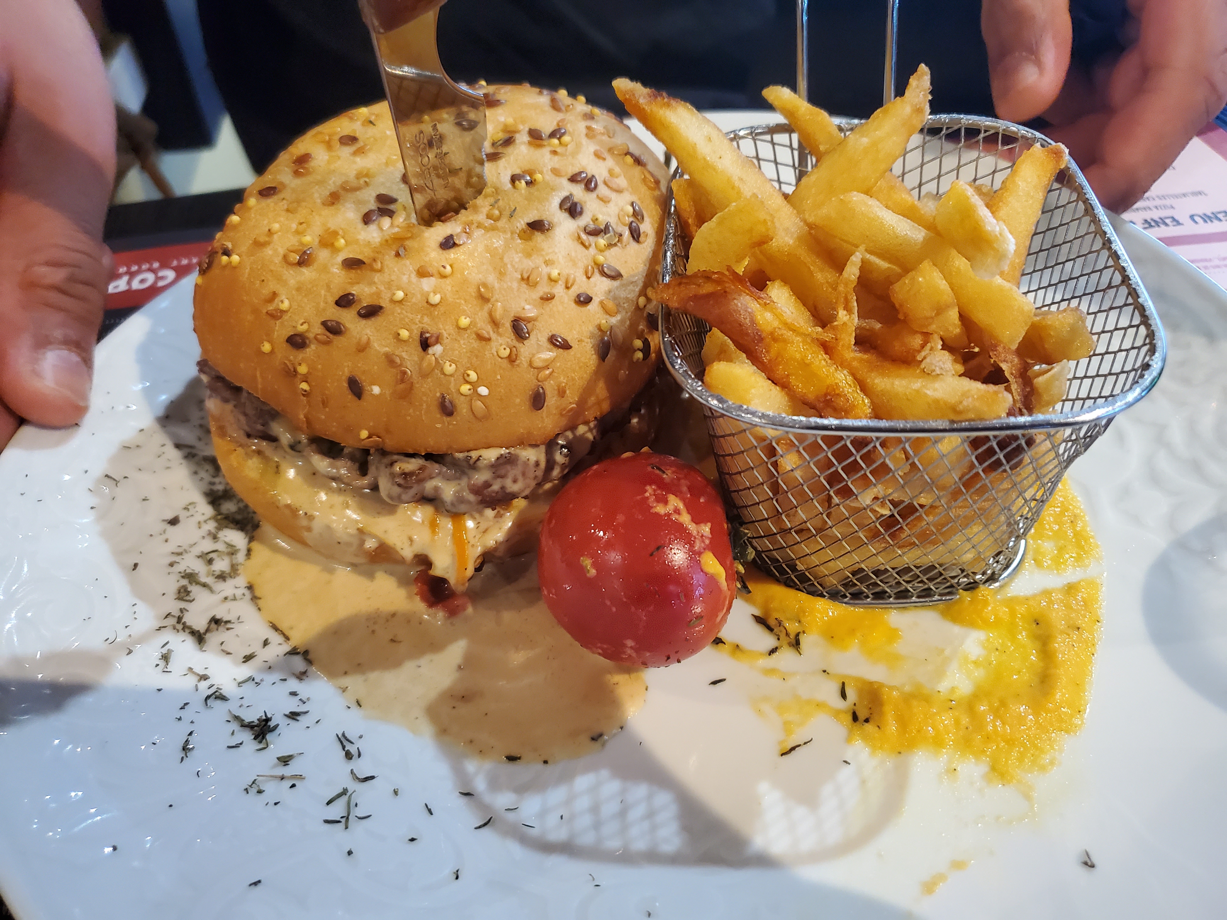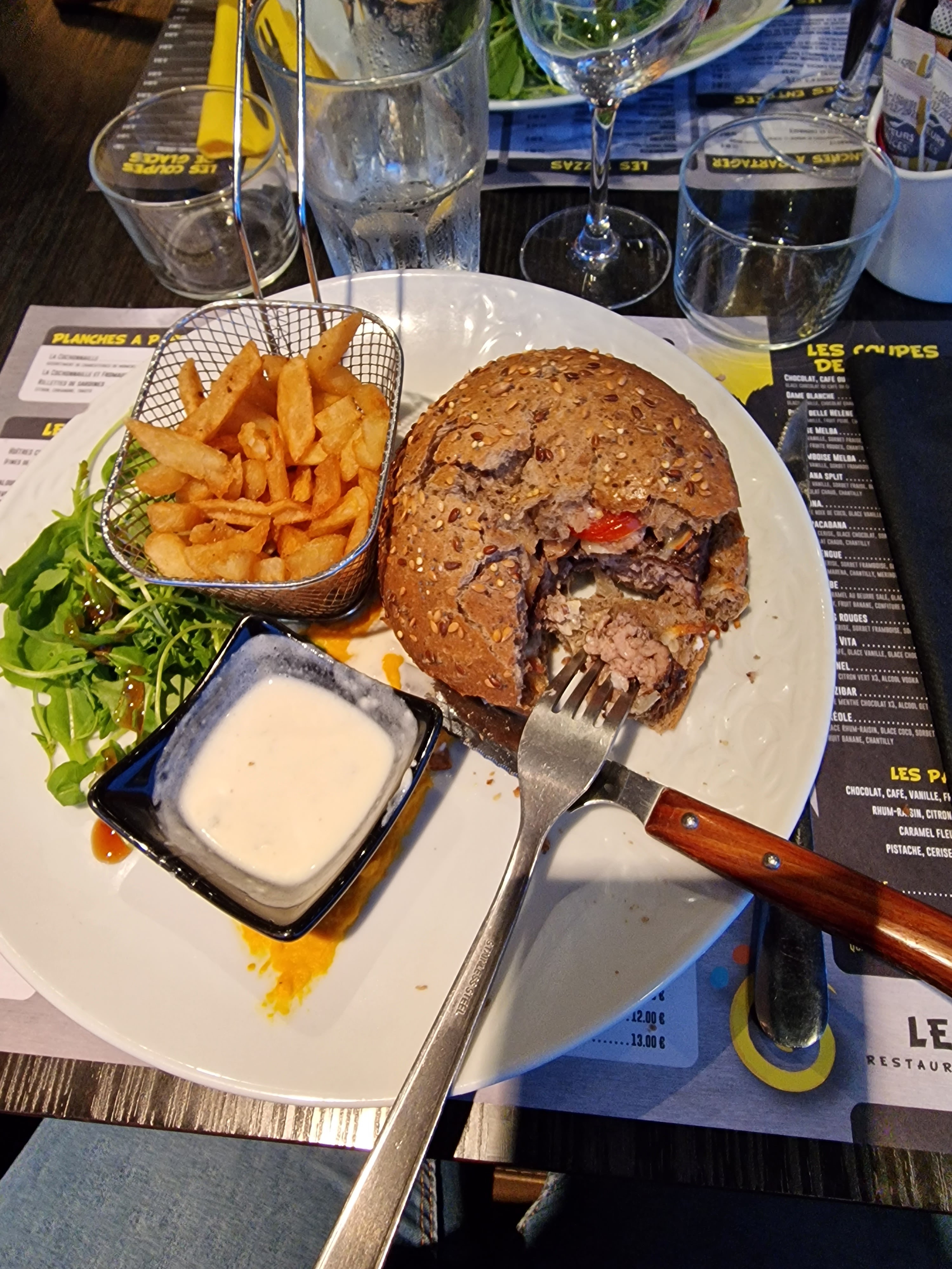 Bonne expérience, très beau cadre. On etait deux, j'ai pris un burger blue cheese, frites maison très bonne. Burger pas tres gros, sauce qui peut avoir plus de gout. Il y a un peu d'attente quand meme. Et une entrecote de veau a été servie, bonne aussi. Petite réflexion sur la carte, il y a beaucoup de fautes d'orthographe , cela m'a quand meme choqué . Les pizza sans S !! Le fromage conté au lieu de comté. Les desserts sont bons aussi. Je recommande mais des améliorations peuvent etre mise en place, en terme d'attente et un menu avec un peu plus de gout serai apprécié.