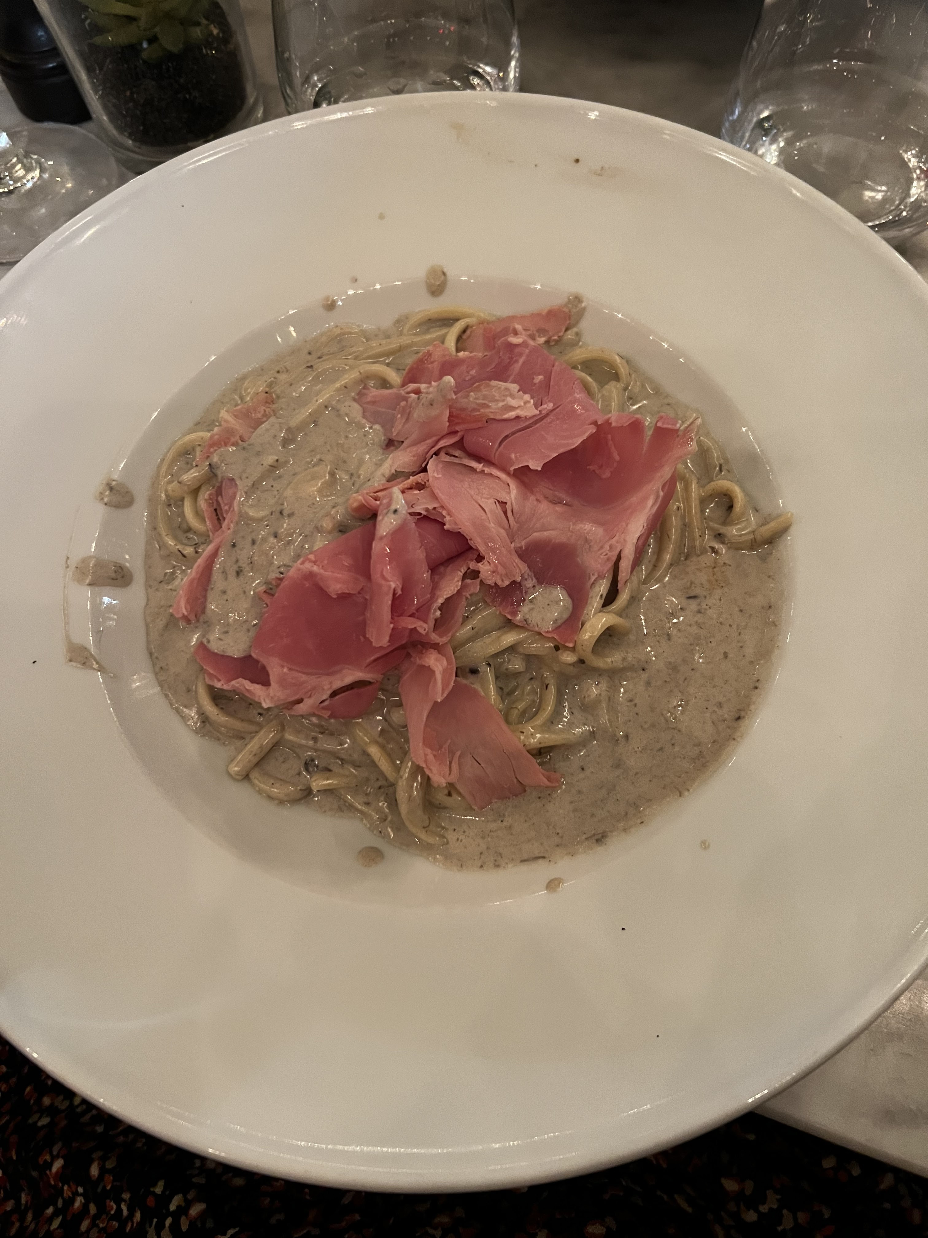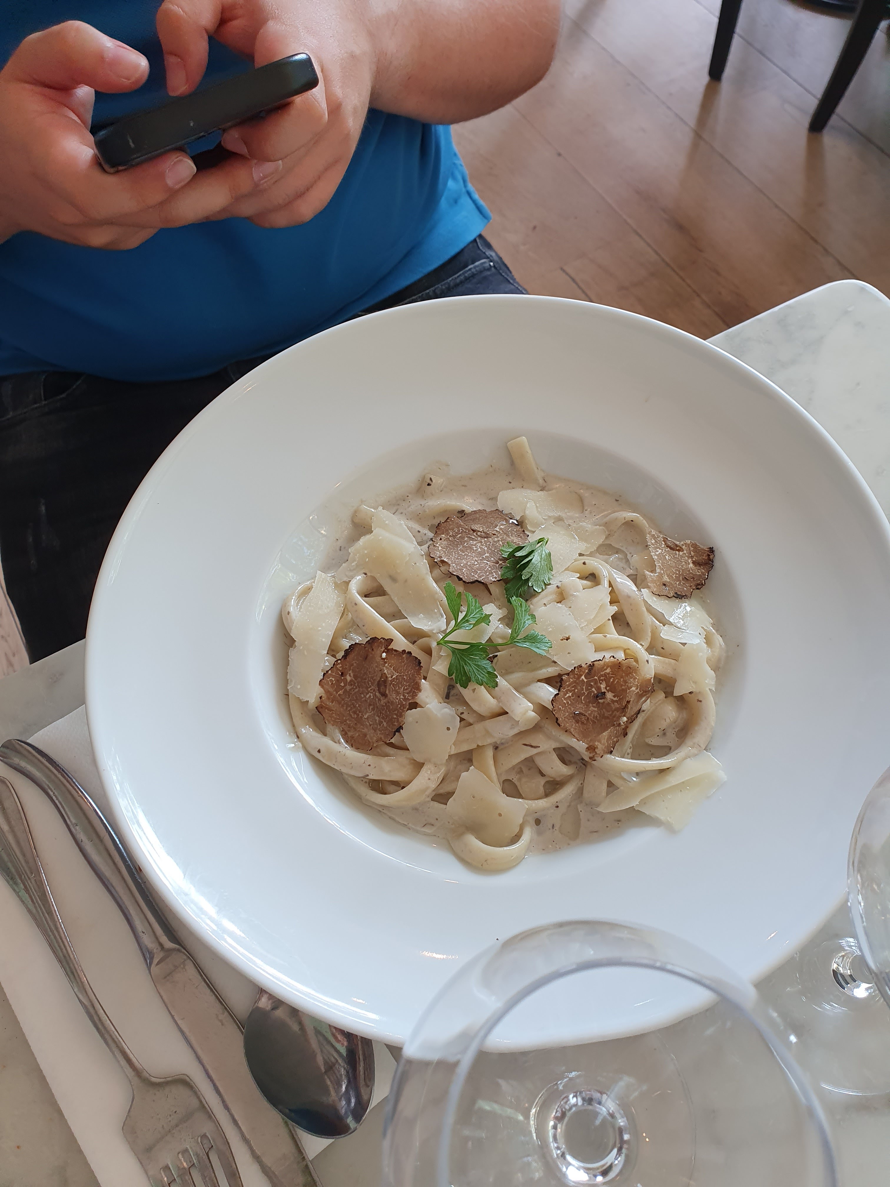 Superbe lieu. Salle ambiance feutrée, éclairage et fond musical très doux. De l'espace entre les tables pour se sentir bien. Le personnel et le service sont irréprochable. La carte est diverse et variée. Une mention particulière pour la meule de parmesan et ses liguines.