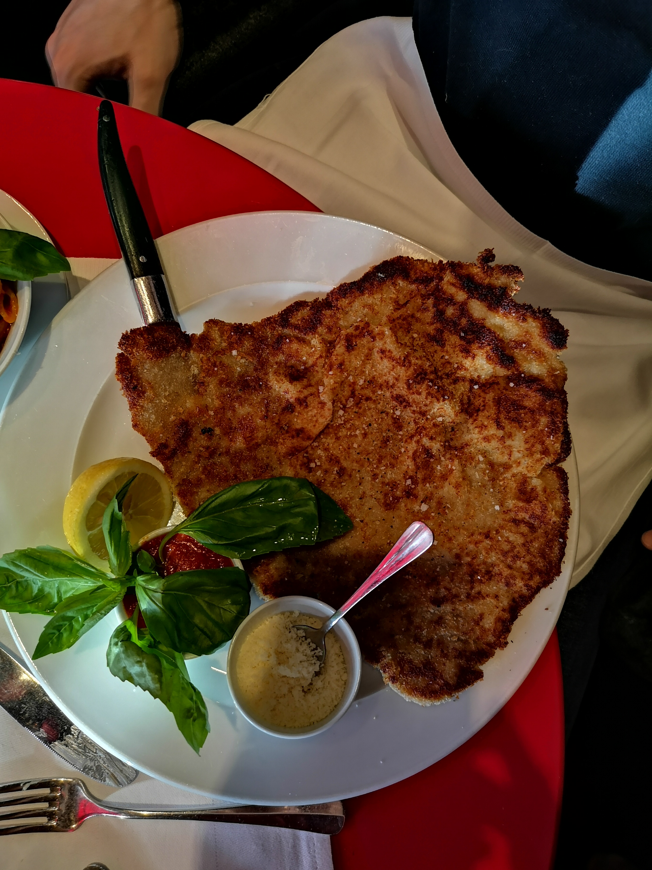Si l'escalope milanaise est réellement généreuse tant elle couvre l'assiette, j'aurais dû amener une scie plutôt qu'un couteau pour la découper et rester tout l'après midi afin de réussir à la mâcher convenablement. On se demande quelle viande se cache sous la panure. J'en ai mangé de bien meilleures dans des cantines moins snobs et moins prétentieuse sans qu'elle soit facturée 31€.Surtout, ne me présentez pas votre fournisseur en boucherie ou peut-être payez le au juste prix afin que le client soit respecté. C'est regrettable d'autan que le service est impeccable et le lieu agréable..