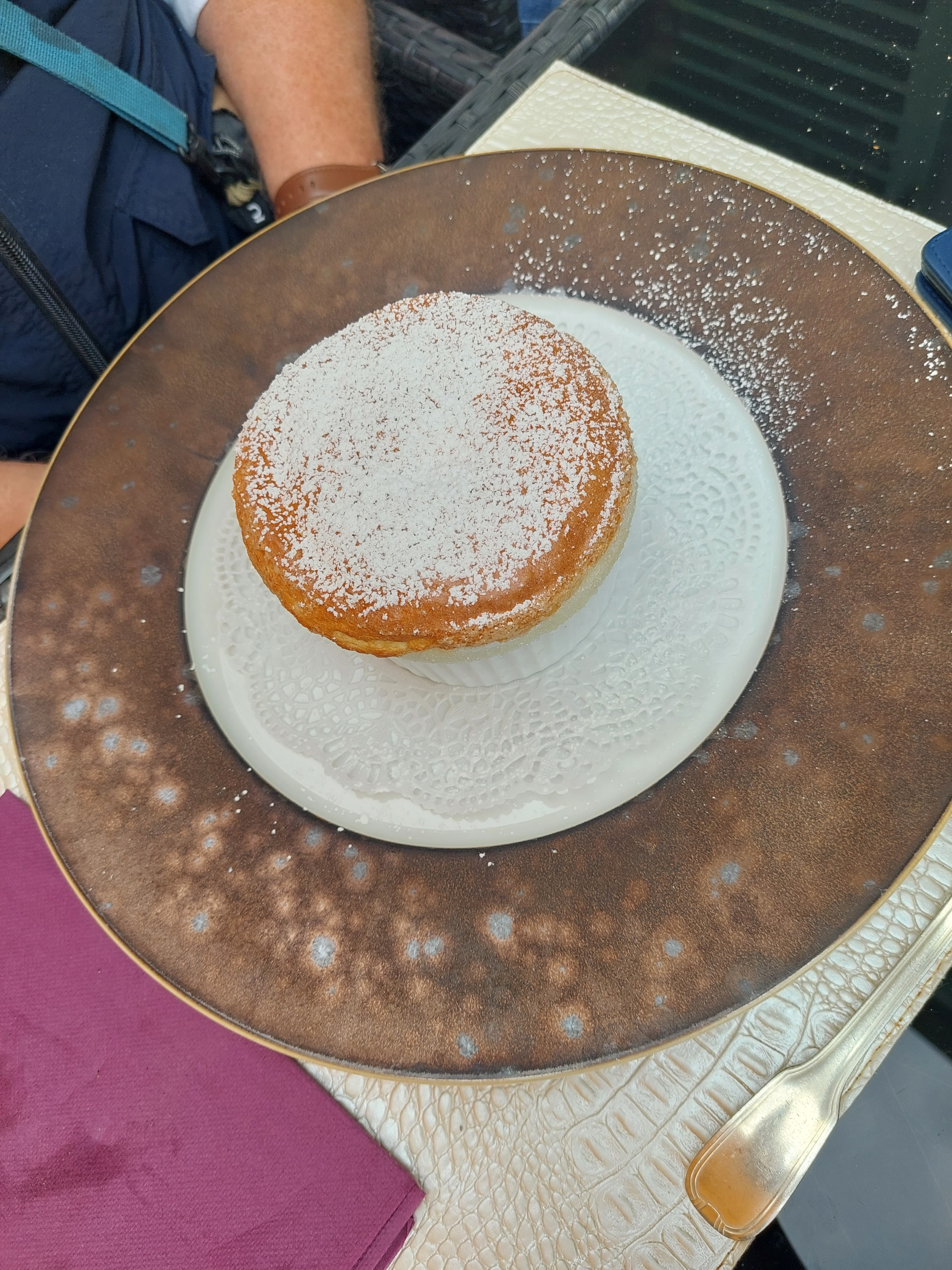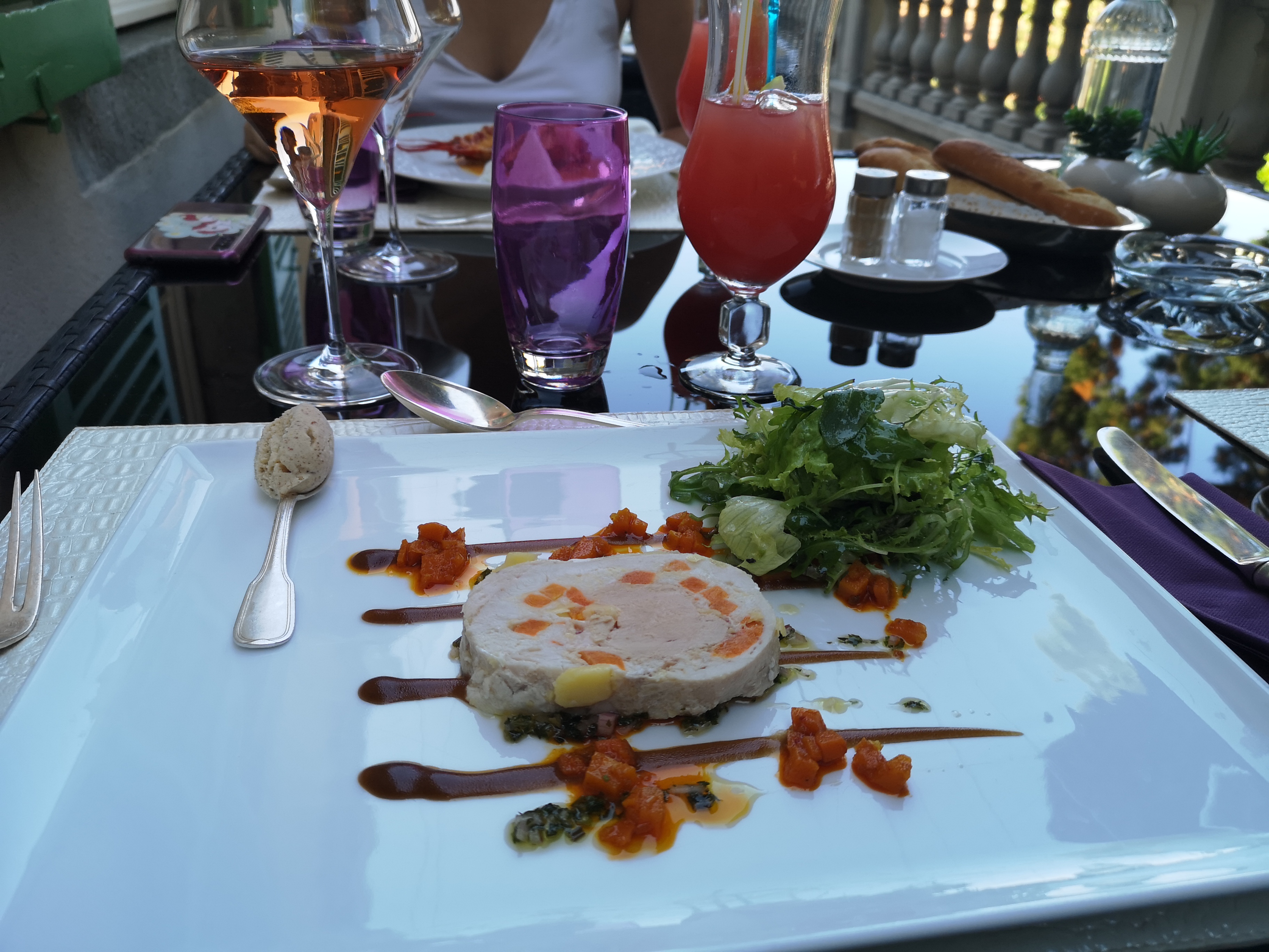Très bon déjeuner sur la terrasse. Bien qu'il fasse canicule nous n'avions pas trop chaud! Le repas est divin, mentions spéciales pour le foie gras et le soufflé! Un délice !