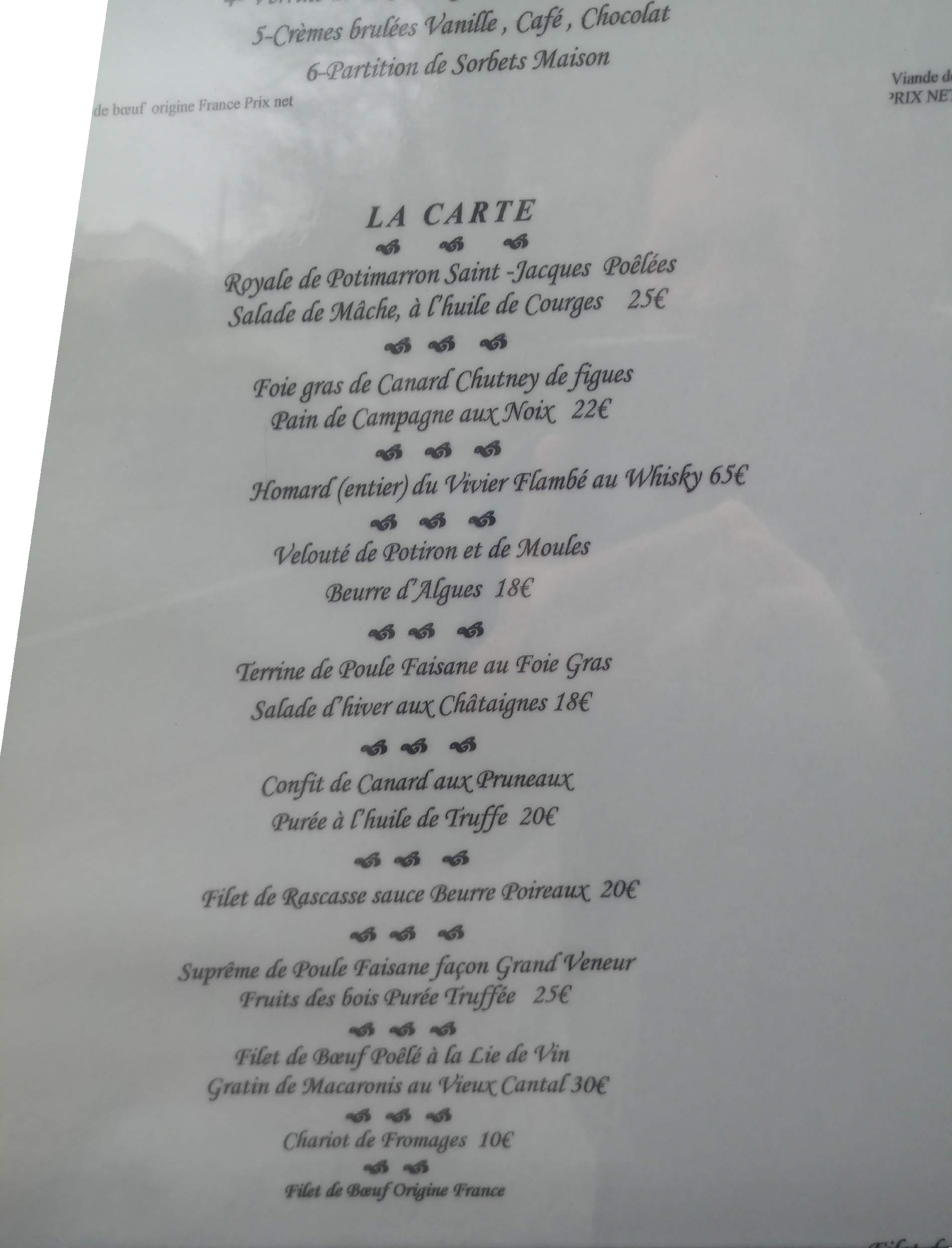 Le chef propose une cuisine basée sur les grands classiques mais avec une pointe de modernité. Les produits sont excellents et les assaisonnements précis. Les produits locaux sont mis à l'honneur : filet de bœuf, châtaignes, pommes et fromages. Un petit bémol pour le service parfois un peu brouillon mais qui reste très courtois et chaleureux. Une très bonne table pour une addition raisonnable.