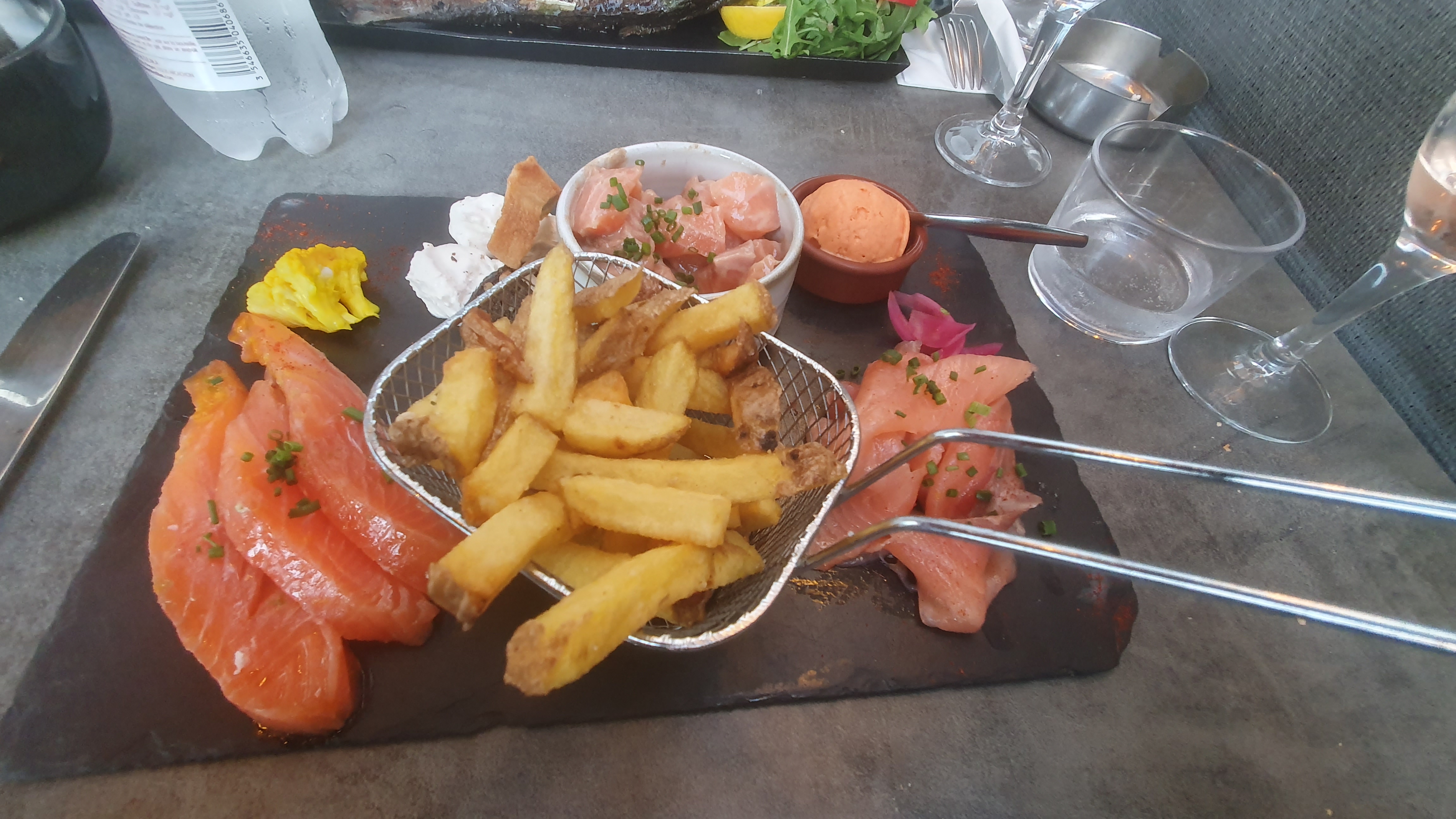 Merveilleuse soirée. Plats copieux, produits frais et délicieux. accueil très agréable. Cela fait plaisir de trouver une table généreuse. 2 entrées partagées (belle assiette de serrano, saumon fumé et gravelax avec mousse légère, fenouil sucré, et pâté d'esturgeon. plat : saint jacques cuites parfaitement avec une purée de patates douces. et tartare de bœuf charolais très bien arômatisé servi avec des grenailles et cœur de laitue assaisonnée délicieusement. les desserts : encore mieux ! ile flottante sur lit exotique et gateau mascarpone fraises fraiches et son coulis. top ! Nous reviendrons
