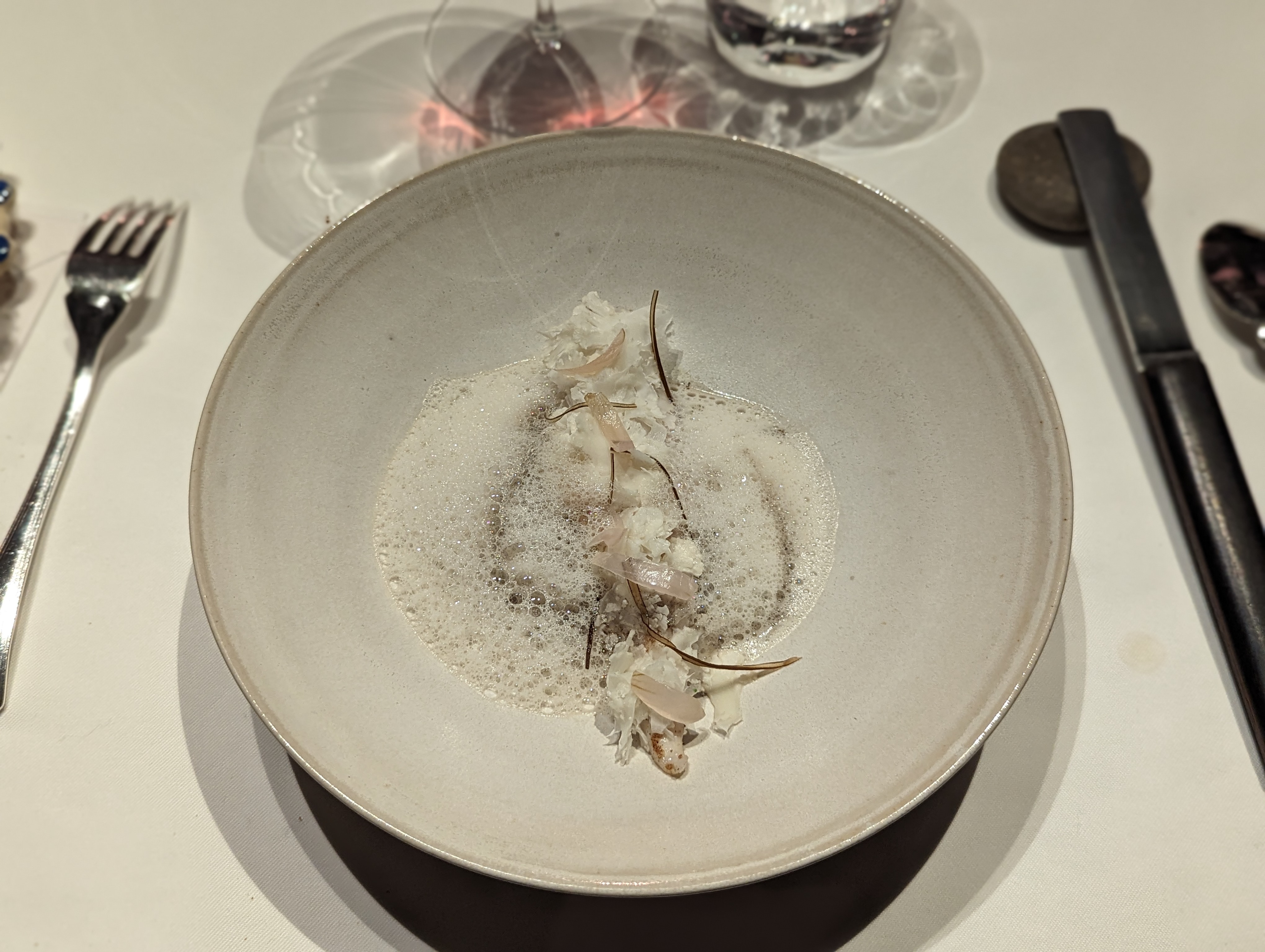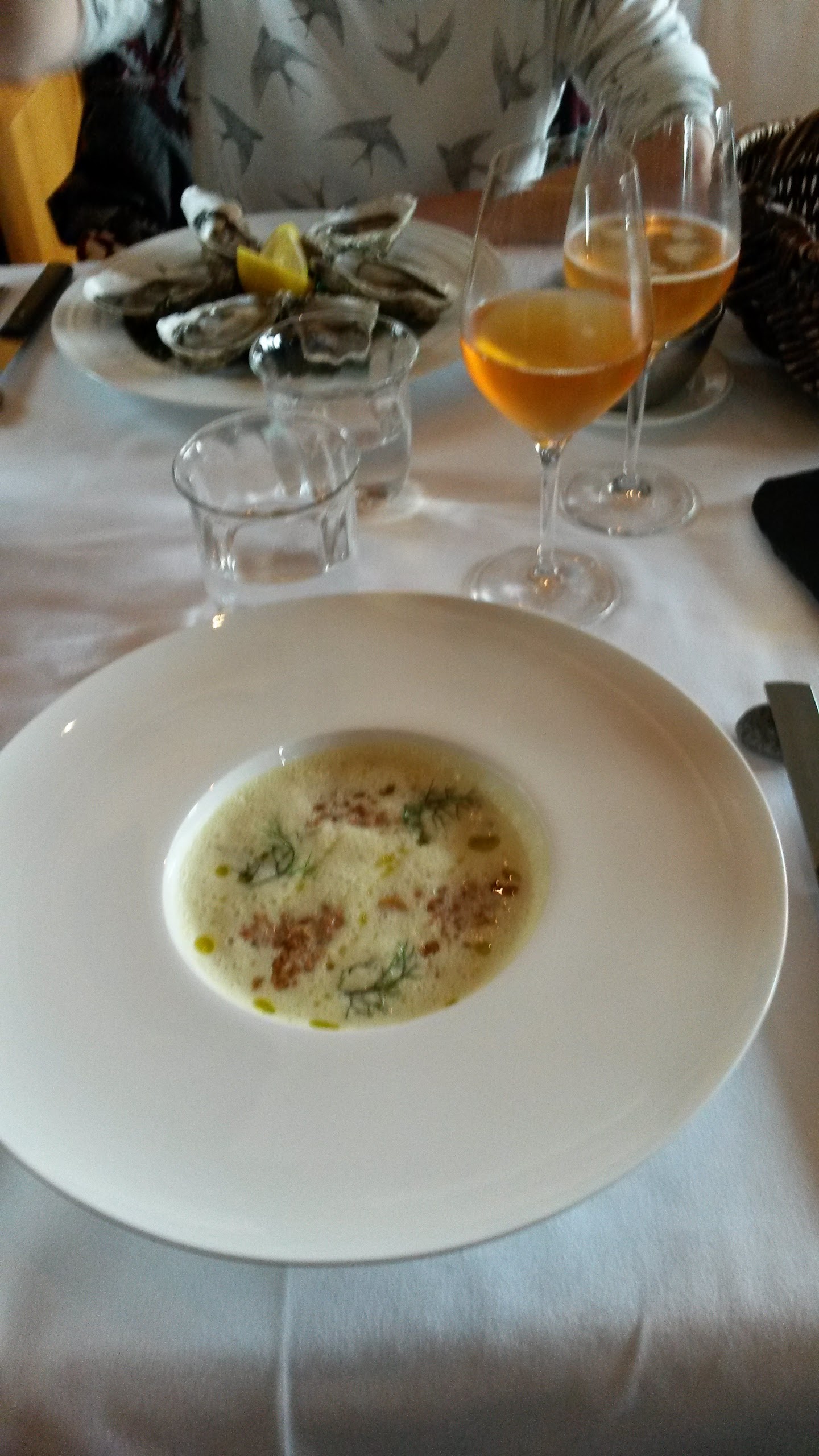 Quelle expérience fantastique ! L'emplacement est superbe, la salle du restaurant est très confortable et douillette (peut-être trop de tables cependant ? Un peu plus d'intimité serait appréciée) et la brigade relativement jeune offre un service efficace, professionnel et sympathique. Le menu dégustation (pas d'option à la carte) est absolument superbe avec une série impressionnante de petites assiettes, composées de super produits frais locaux, merveilleusement préparés et présentés, et offrant à votre nez et à votre palais quelque chose d'assez unique. Je recommanderais d'opter pour l'accord mets et vins, car les explorations du sommelier en dehors des sentiers traditionnels - parfois si classiques et galvaudées qu'elles en deviennent ennuyeuses - valent le risque. A noter également, la carte des vins assez fournie avec une gamme impressionnante de vins triés sur le volet et à un prix très maîtrisé, démontrant qu'on peut dîner dans un 2* Michelin sans se ruiner pour le vin, loin des étoiles. prix généralement trouvés dans de tels endroits. Pour faire court, arrêtez de réfléchir, laissez-les conduire et profitez du moment !