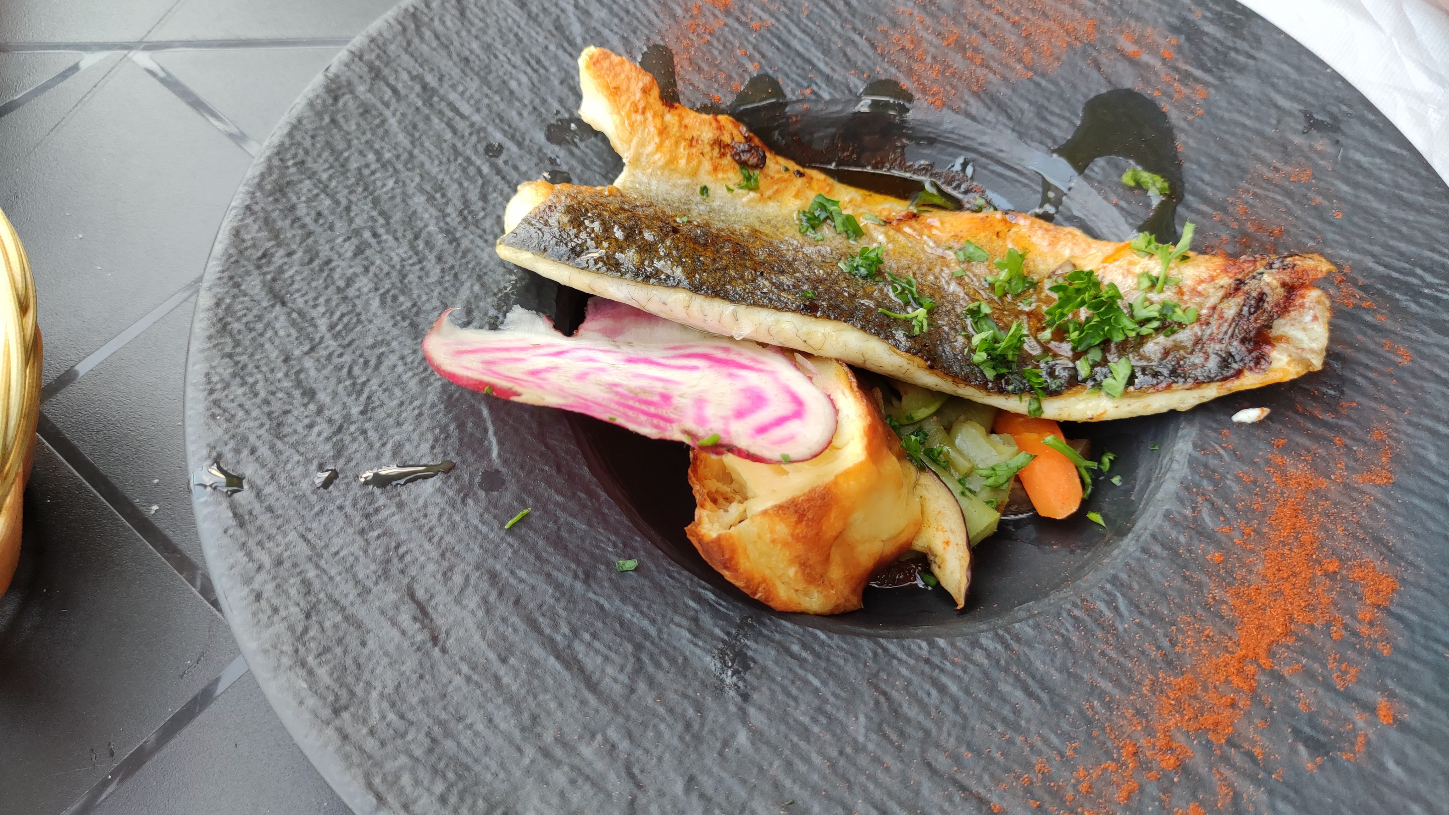 Tres beau cadre Personnel très agréable Menu extrêmement abordable et délicieux Le bar sauce caramel aux agrumes 😋😋😋 Les gambas 😋😋😋 Excellent crumble ananas Une adresse ou je reviendrai avec plaisir