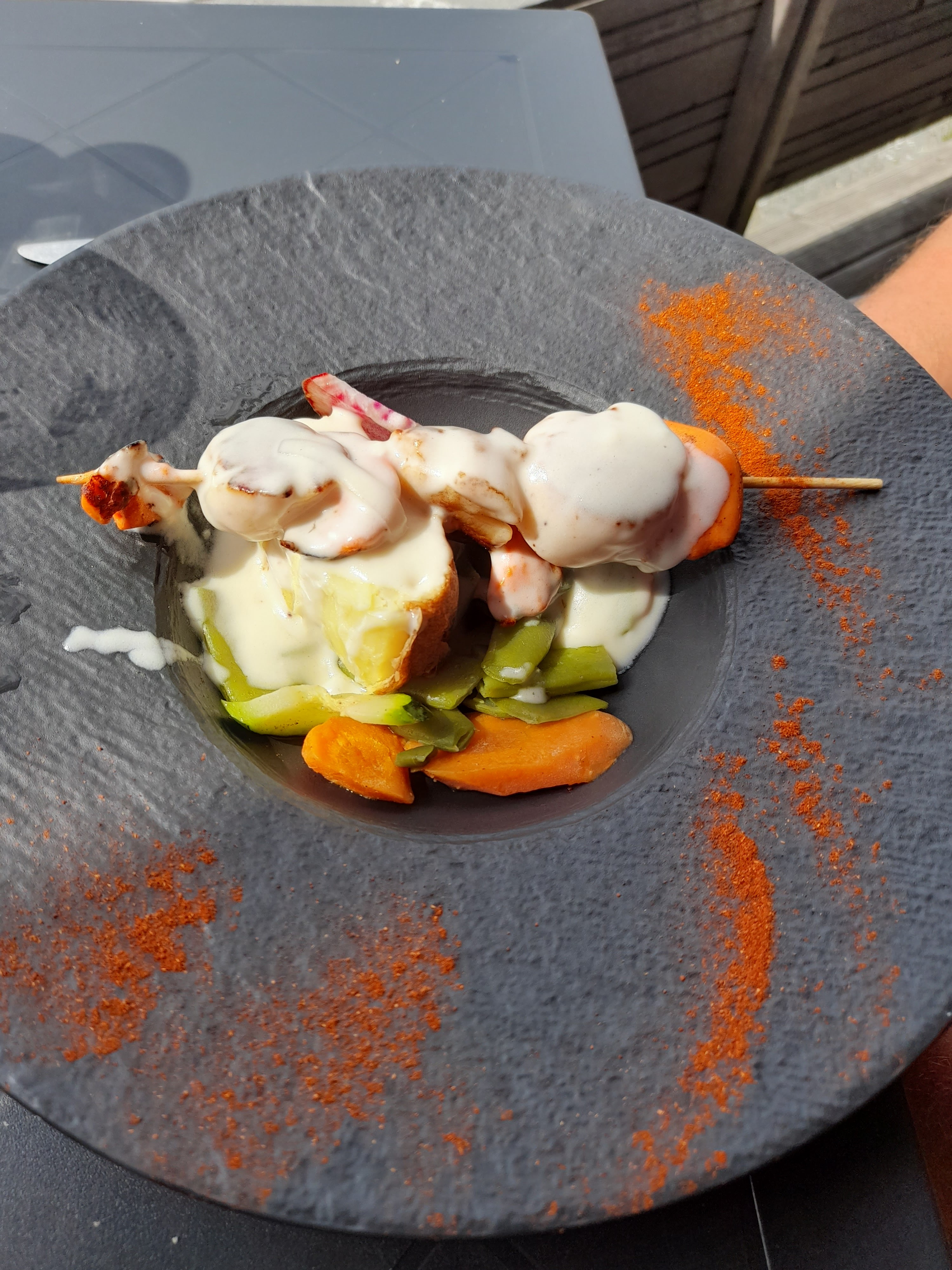 Très bien cuisiné, des produits de qualité un service agréable. Une gambas et une saint Jacques de plus ne serait pas de refus. Cordialement.
