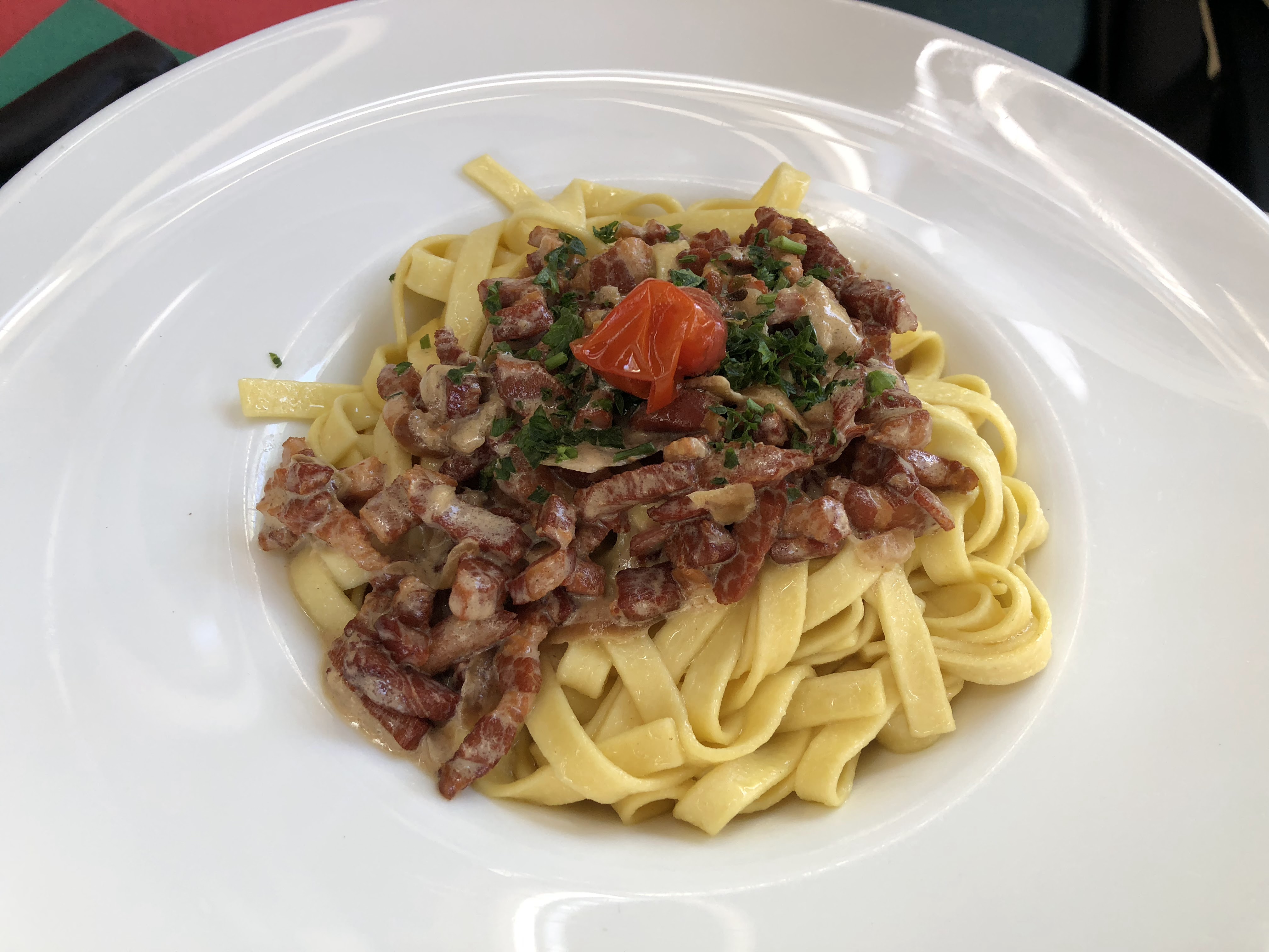 Pas une expérience marquante en terme de goût : une pate très fine pour les pizzas et cramée sur les bords, des pâtes pas si dingues mais le tout nourri quand même bien. Quelques maladresses du serveur qui, lorsque nous n’entendons pas les plats annoncés avec le bruit ambiant nous dit « Faut ouvrir les oreilles!! » sur le ton de la rigolade peut-être mais une de nous est réellement malentendante donc ce genre de remarques n’est pas vraiment agréables ni drôle. Nous avons été déçus