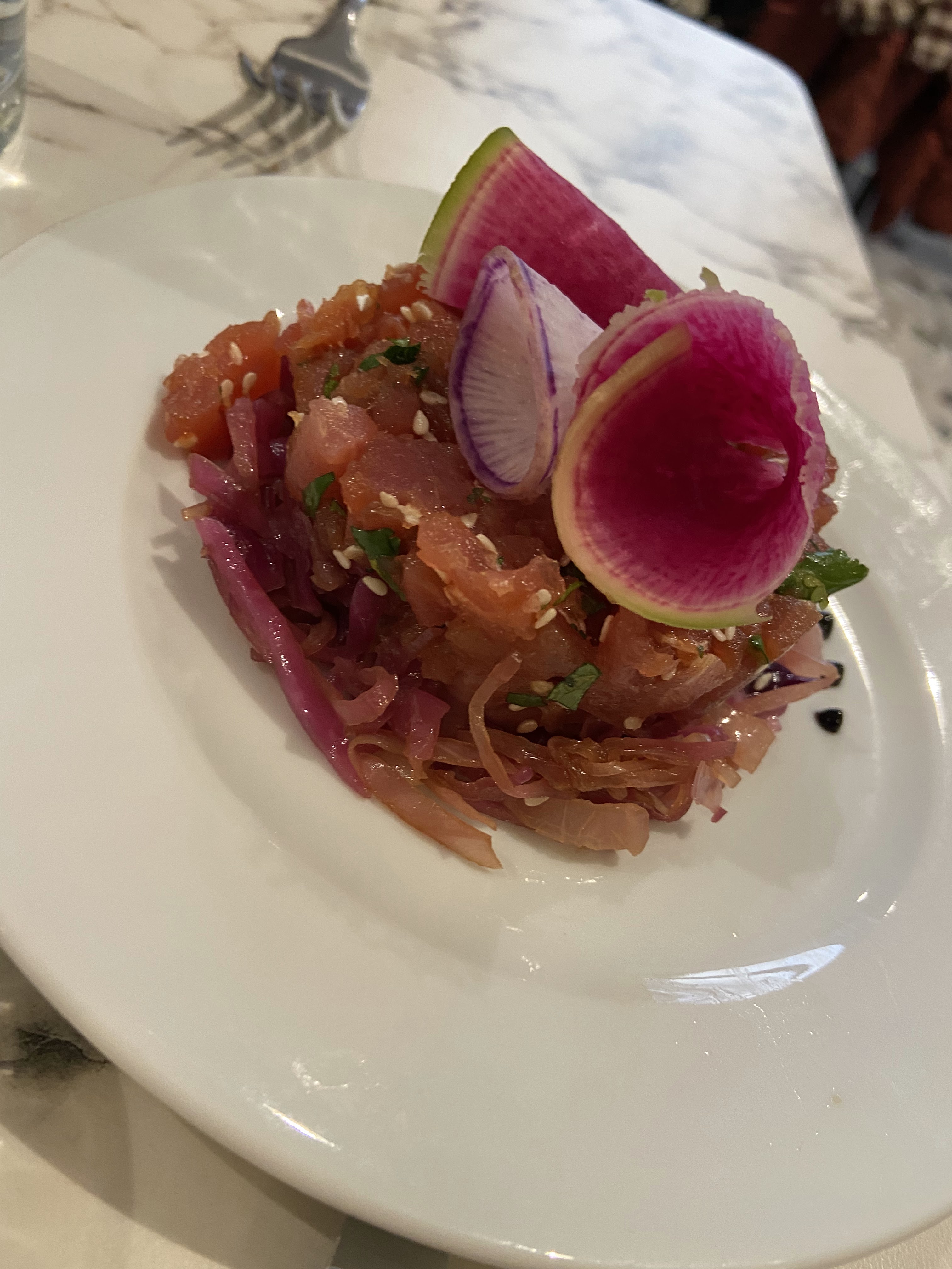 Un bien beau restaurant decouvert par hasard Plein de charme De bien belles couleurs Un cadre très agréable Des produits triés sur le volet et bien mis en valeur par les cuisines. Un service discret et efficace. Une belle salle. Un beau choix pour un prix très raisonnable en plein Lyon. À 2 pas de Perrache.