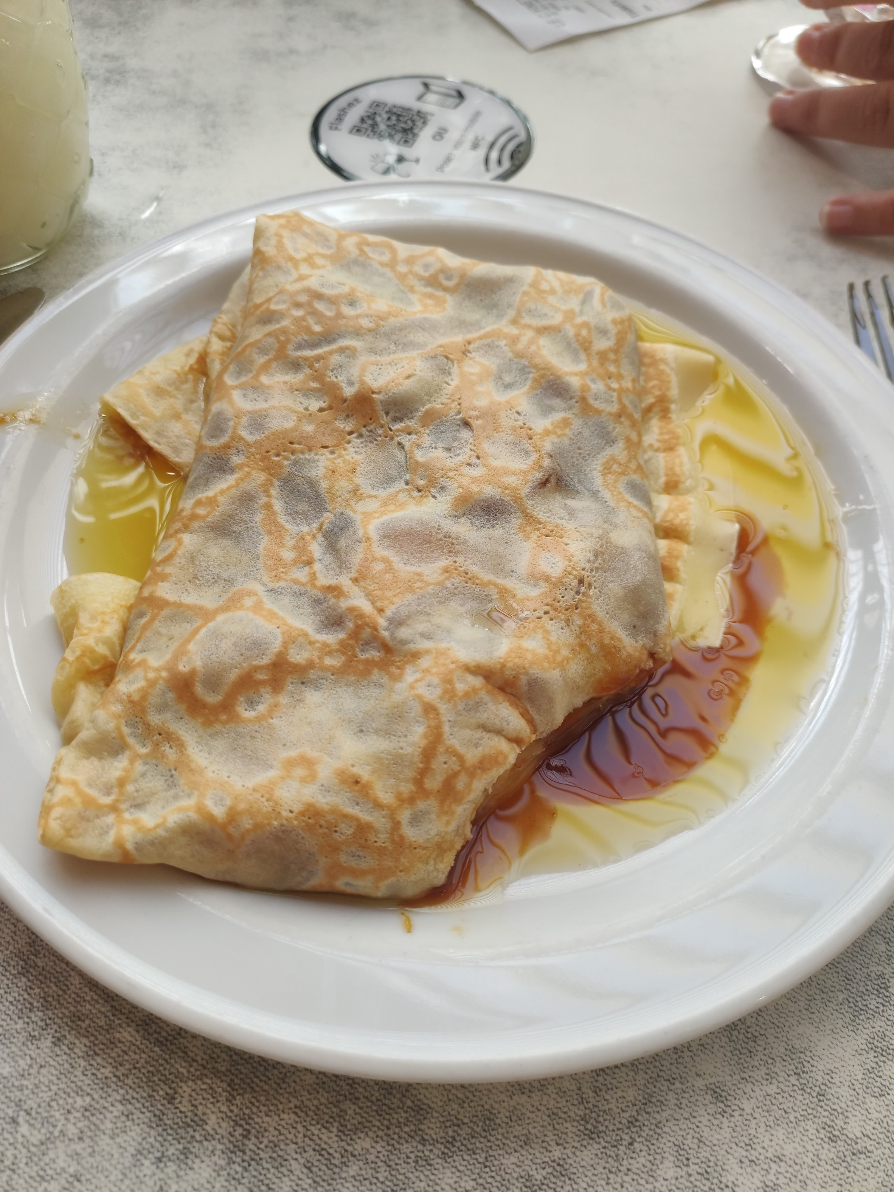 Nous avons pris des crêpes nature qui étaient très bonne avec des boules de glaces saveurs beurre de cacahuète un délice 🤩 caramel beurre salé et banane. Portions très généreuses. La serveuse était super sympas.