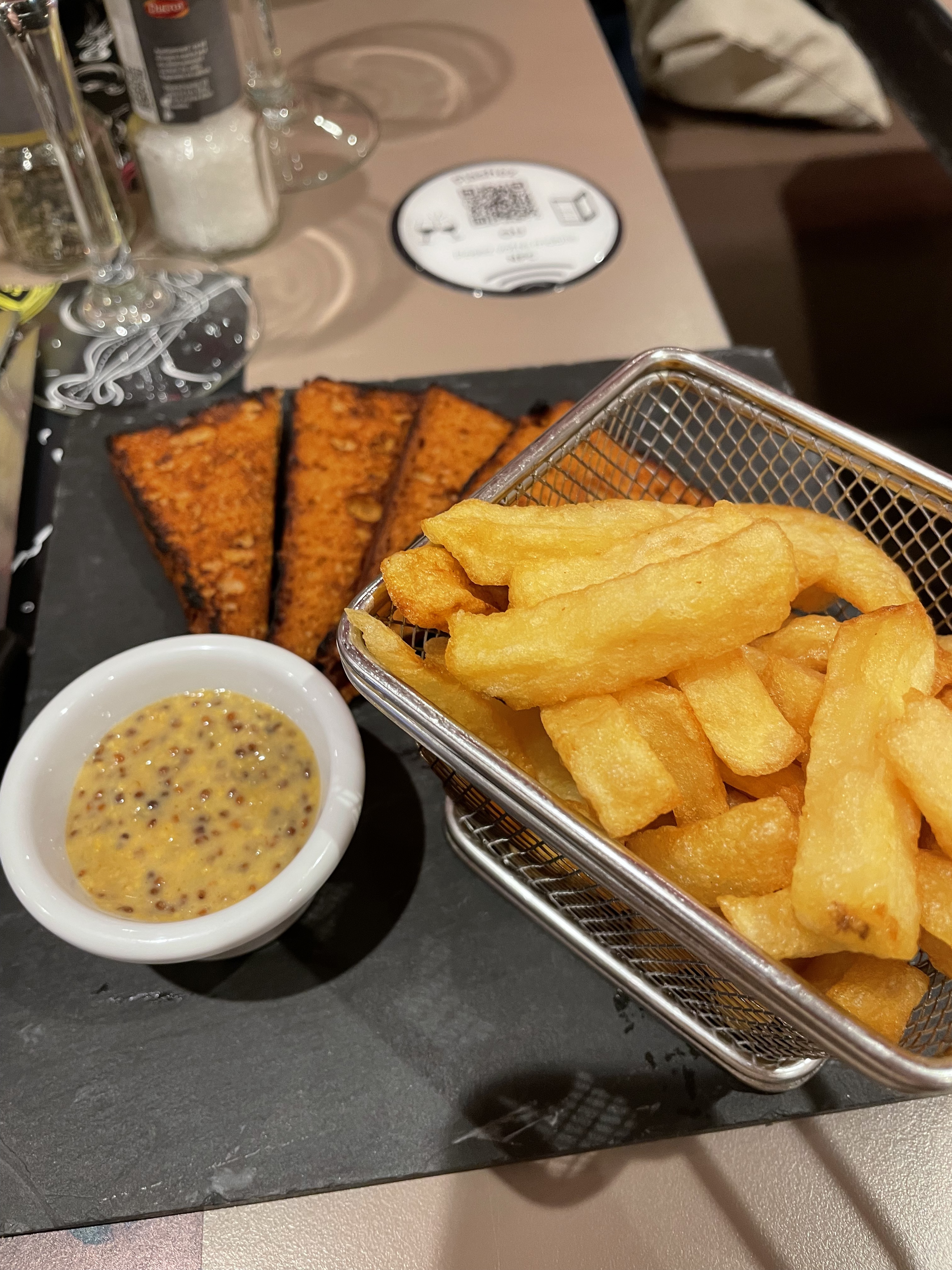 Première fois qu'on venait manger Terrasse chauffée bien agréable en ce temps brumeux de février Serveur très agréable et serviable Nous nous sommes régalés Portion généreuse Toilettes intérieur très propre