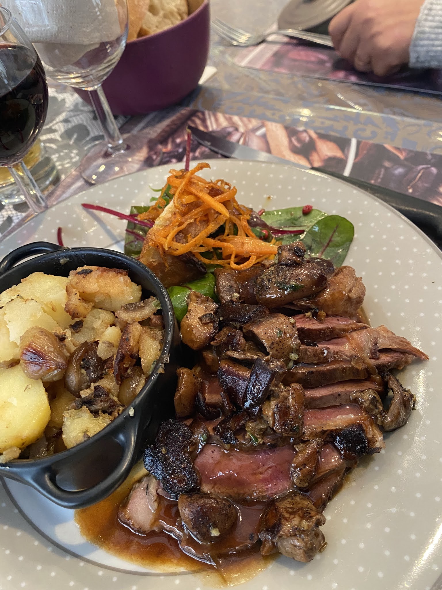Ce jour là j'ai pris confit canard avec des cèpes, des pommes de terre et un petit peu salade. Le confit n'était ni trop sec ni trop gras.