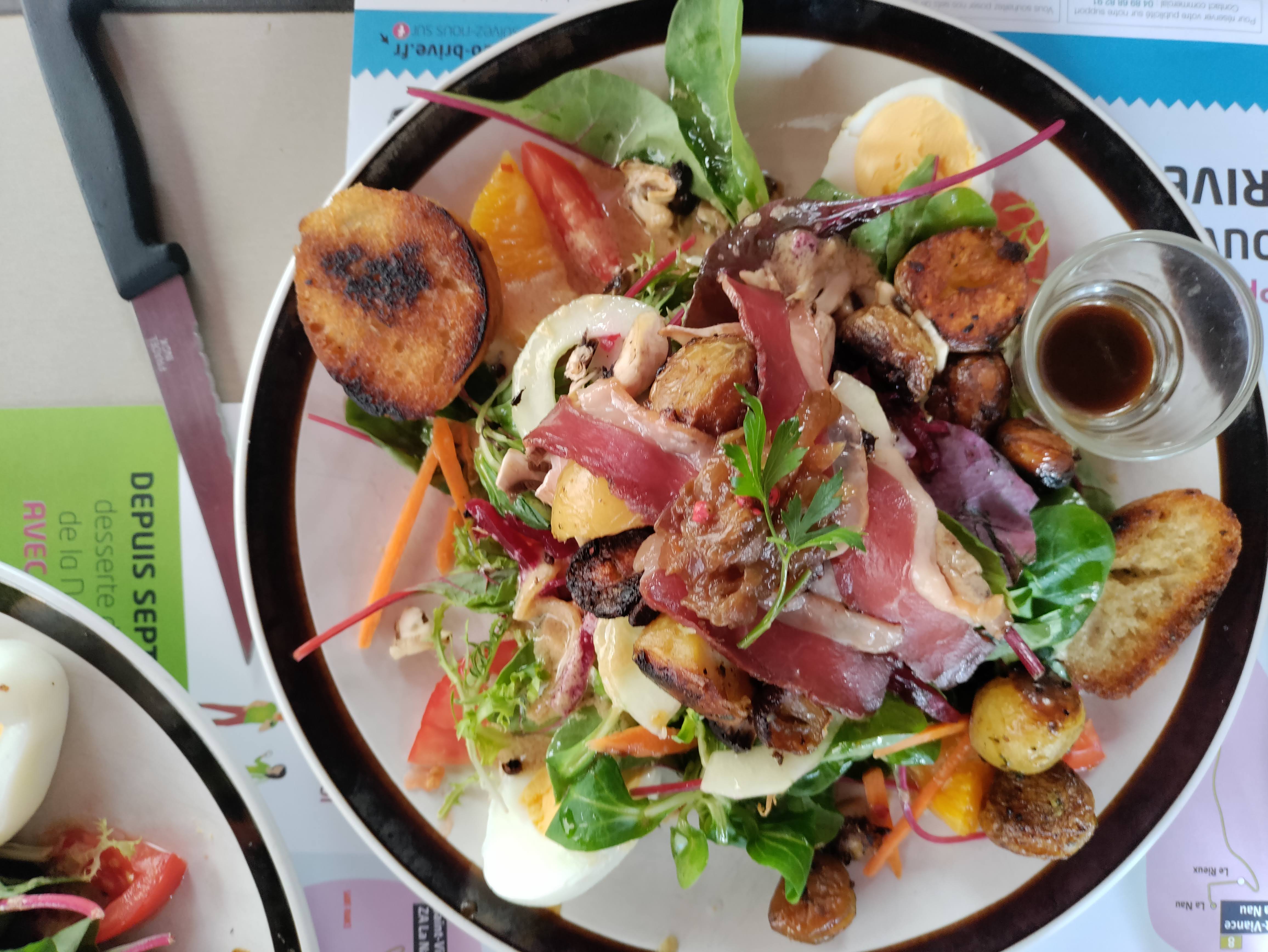 Nous sommes arrivés à Brive-La-Gaillarde dans la magnifique région de la Dordogne en France après le déjeuner vers 14 heures. Nous voulions chacun quelque chose de français, quelque chose de local. Nous avons cherché autour de Bruce et il y avait quelques endroits encore ouverts et servant de la nourriture, mais rien ne nous plaisait vraiment. Puis nous sommes tombés sur Le Corrèze. Le personnel nous a dit qu'ils servaient toujours et ont produit une délicieuse salade qui était exactement ce que nous recherchions. Service amical, serviable et poli, pas cher.