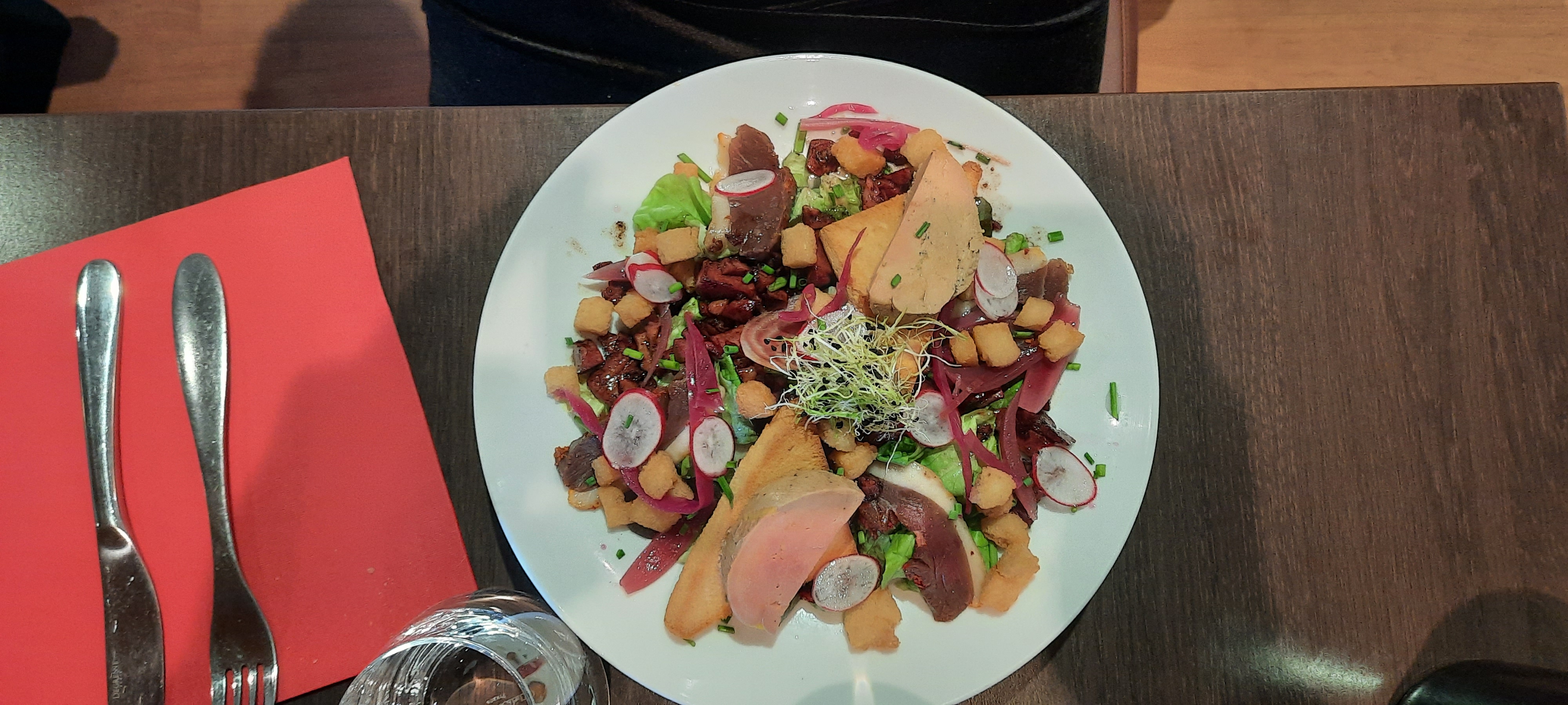 J’ai pris une salade de pâtes méditerranéenne. Les pâtes étaient beaucoup trop cuites et le mélange fade de pesto, mozzarella, feta et tomates fraiches et confites était immangeable. Le jeune serveur a gentillement accepté ma réclamation en envisageant un café ou un dessert offert. Au moment du règlement la cheffe de salle refuse sèchement chaque geste commercial et remarque que le directeur de la maison avait mangé la même salade qui d’après lui est tout à fait satisfaisante. Non seulement les 2 employés ne savent pas prendre une décision dérisoire en faveur du client (2,10€ pour un café offert) mais la satisfaction de ce dernier ne compte pas du tout. Il y a assez de touristes qui se perdent dans ce resto qu’ils n’ont apparemment pas besoin d’y faire attention. Ce qui est le plus triste c’est que ma copine s’est pris un « conasse » dans son dos car elle a osé mentionner l’intérêt de la satisfaction client. Impensable!