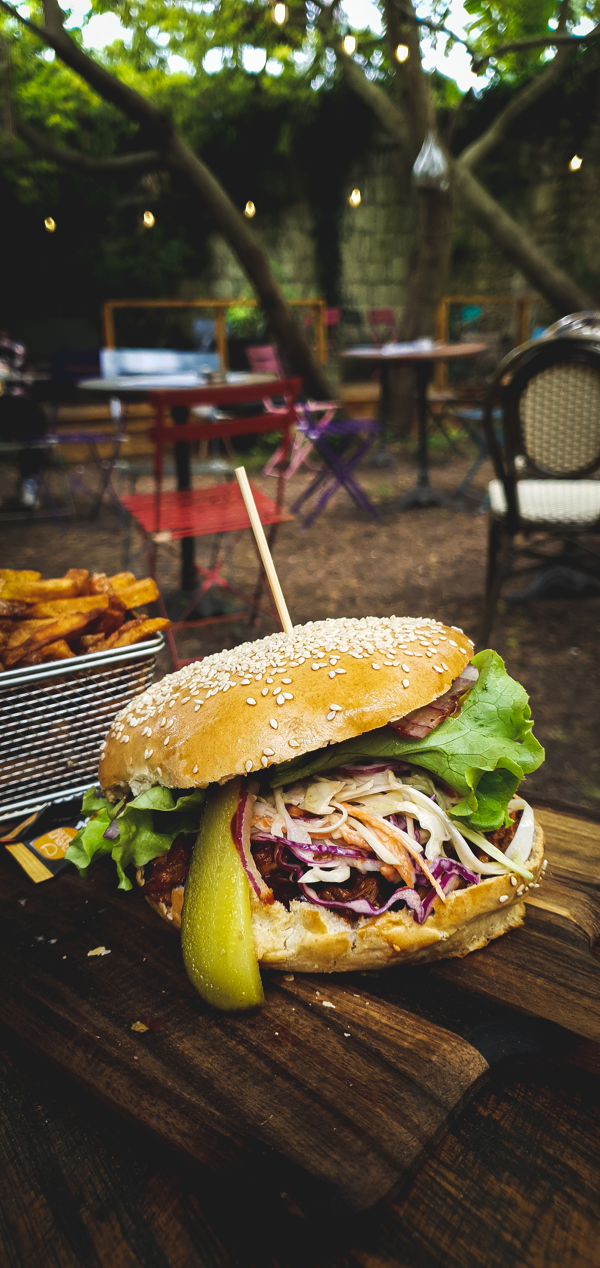 Ça avait mal commencé : j'arrive et demande une table pour une personne, on me dit pas de problème. C'est marrant, vous êtes là 2ème femme seule enceinte de la journée !... Je ne suis pas enceinte. Gros malaise et de quoi se vexer. Je ne me rappelle pas avoir entendu des excuses. Dieu merci, la serveuse a rattrapé le coup, hyper sympa et adorable ! J'ai pris un burger à l'effiloché de porc, très bon, mais trop de sauce barbecue dedans, accompagné de ses frites. Le lieu est néanmoins chaleureux, à l'extérieur, cela fait très guinguette. Si vous êtes passionnés des toilettes sèches au fond du jardin, ce resto est fait pour vous ! ☺️