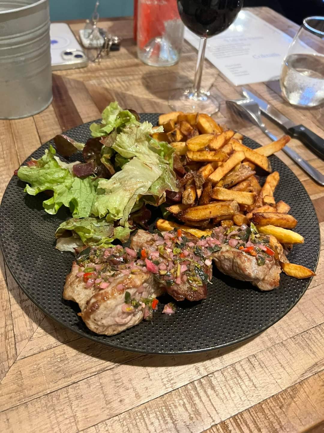 Endroit sympa et cuisine de bonne qualité, petit bémol le mobilier style table et chaises de jardin métal et bois qui ont bien vécus et les tables trop petites