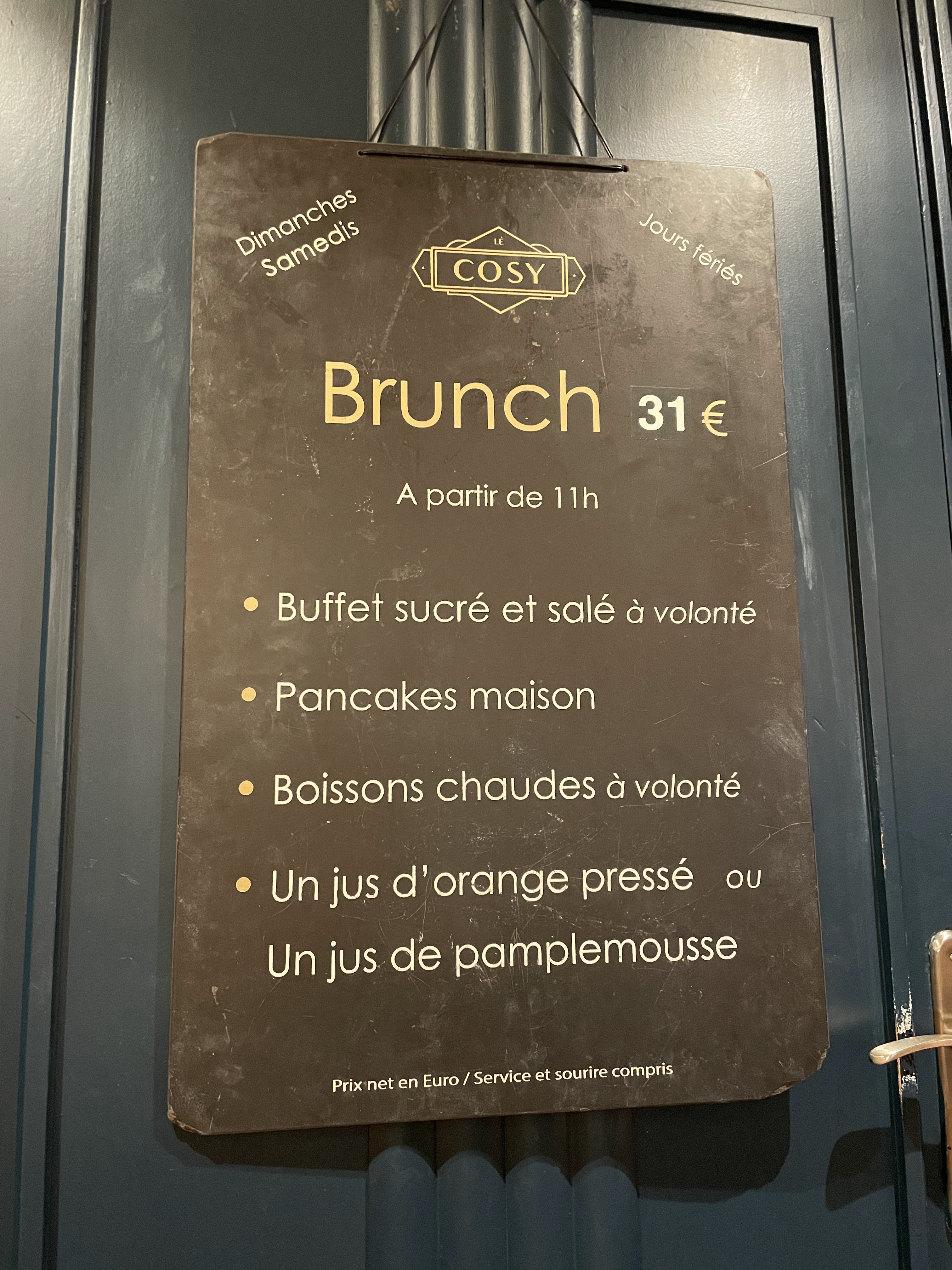 A la recherche d'un brunch dominical, nous avons été accueilli chaleureusement par l'ensemble de l'équipe Le cosy qui fut attentionnée, professionnelle tout au long de notre repas. Nous avons pris la formule brunch a 29€ qui nous a tous conquis que ce soit au travers de buffets copieux et gourmands ( nous n'avons pas pu tout goûter à notre grand désespoir ^^) , une qualité de produits indéniable et faits maison sans compter des petites attentions culinaires surprises ( pancake, mini hamburger )...mais bon comme on dit : un brunch est fait pour se faire péter le bidon et dans cet établissement tous les ingrédients sont réunis pour faire un brunch réussi... bravo à toute l'équipe!! Je recommande vivement !! Une famille provinciale conquise !!!