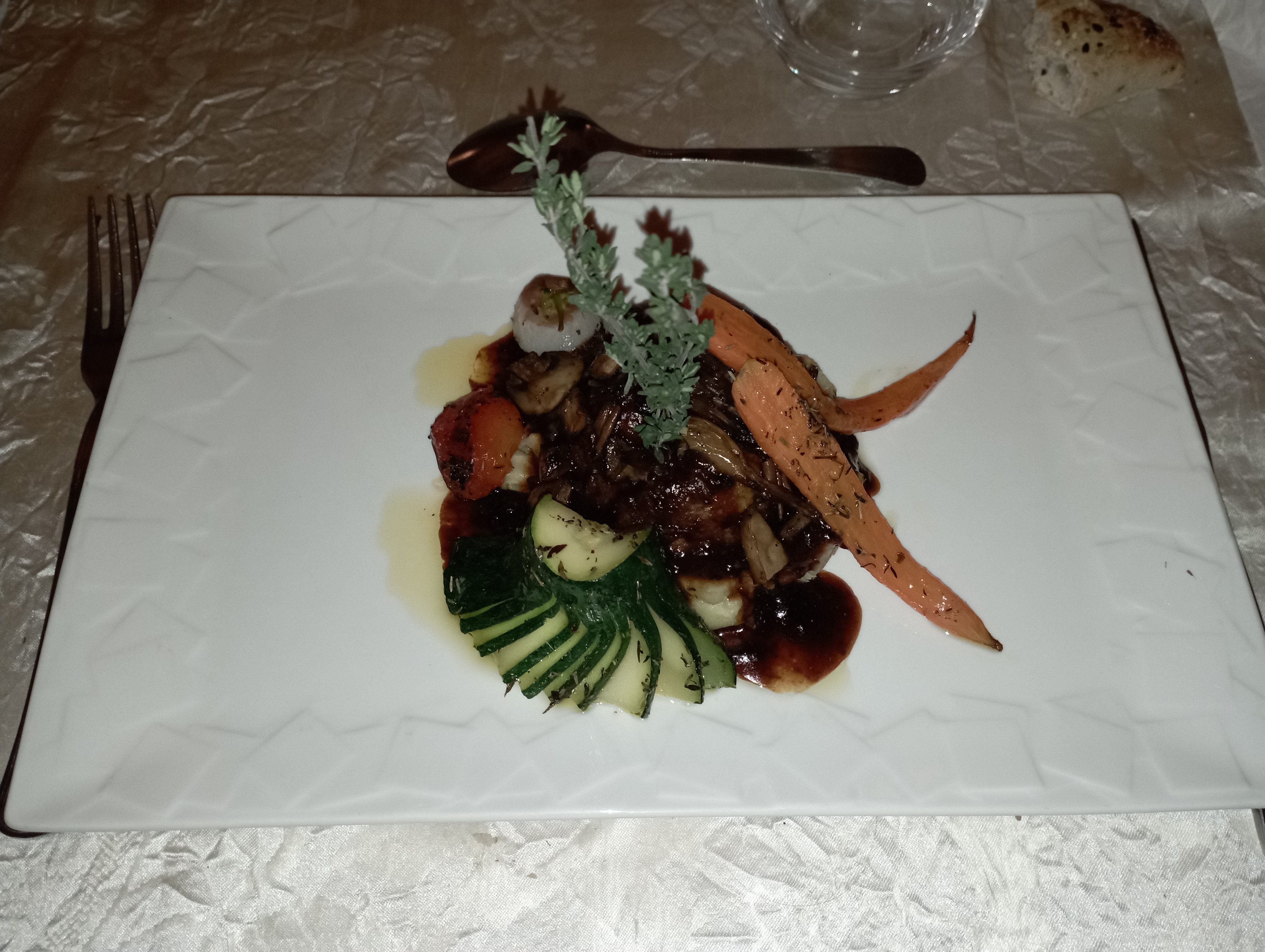 Un cadre très agréable, convivial et original. Dommage que la salle sentait l'odeur de cigarette camouflée. Réservé pour 19h30 (impossible de réserver plus tôt donc on s'est baladé dans le petit village en attendant). La serveuse n'était apparemment pas encore arrivée. On a été reçu par la gérante, qui s'est trouvé un peu débordée pour prendre les commandes de 2 tables... Du coup l'apéro s'est fait attendre. Et la bière commandée par mon mari a fini en partie sur la table et épongée avec la main 🤔 ceci dit mon apéro était délicieux (un muscat avec du sirop d'amande il me semble). Nous avons été charmés par notre entrée : soupe de poissons pour moi et champignons façon bourguignon pour mon mari. Un peu moins d'intérêt pour le plat principal (bien qu'il était très joli). J'ai un doute sur la qualité de l'agneau qui m'a semblée un peu trop sucré et très très tendre. A-t-il vraiment mijoté dans cette cuisine? Je ne sais pas. Et le dessert, un classique sans autre recherche : poire belle hélène. Ah, et déception, sans aucune indication claire sur la carte, pas de menus possibles le samedi soir. Donc l'addition était un peu salée. Ce fut toutefois une soirée en amoureux pas désagréable. Bilan en demi-teinte.