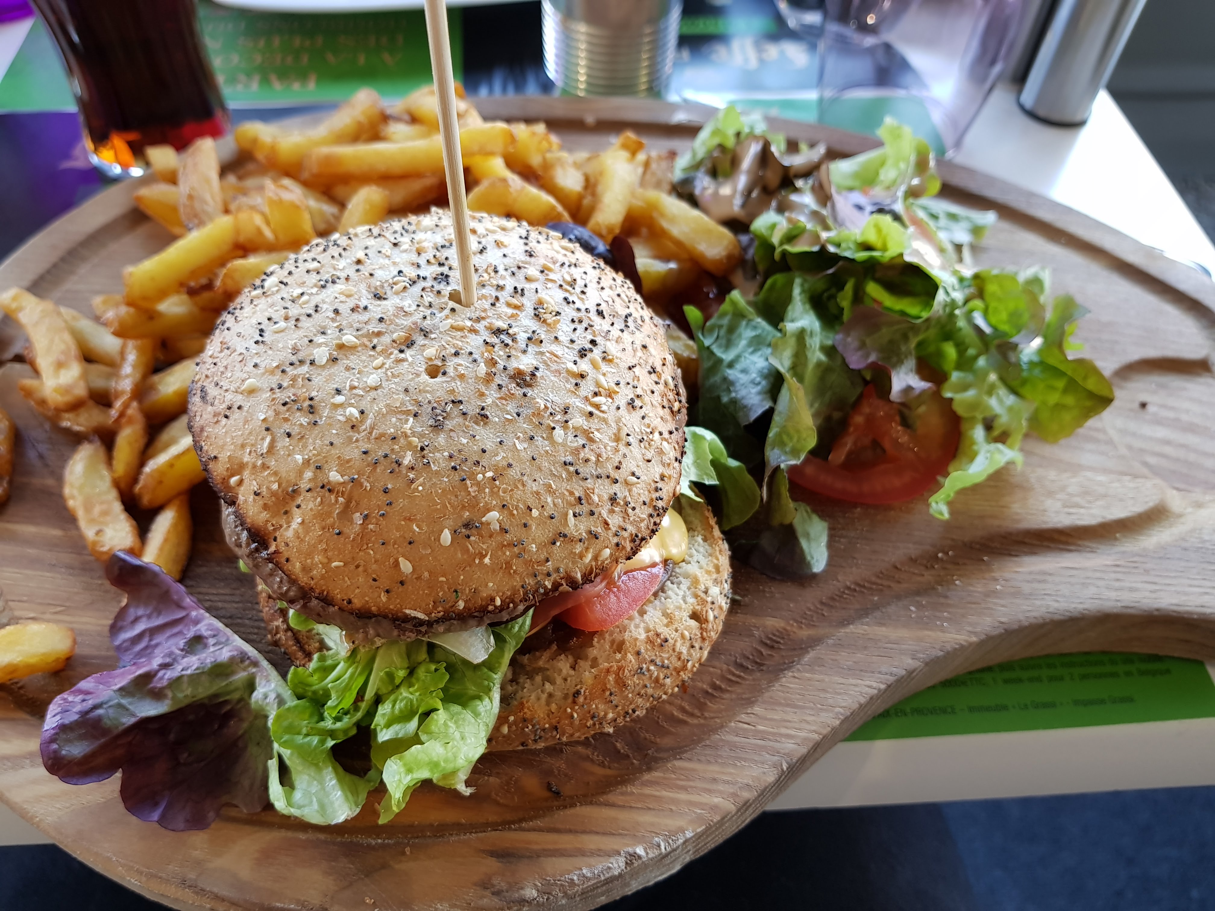 Cuisine du jour variée et goûteuse Burgers excellents (surtout celui au chèvre) Café gourmand fabuleux !